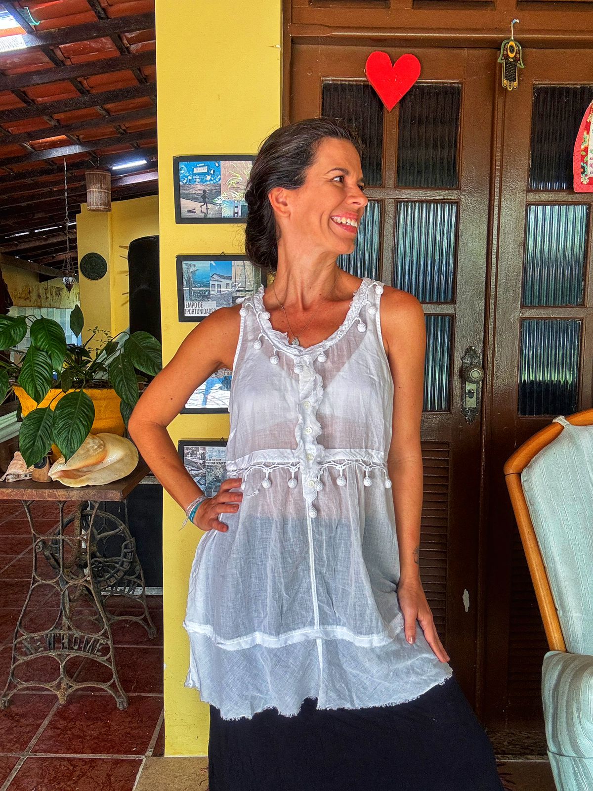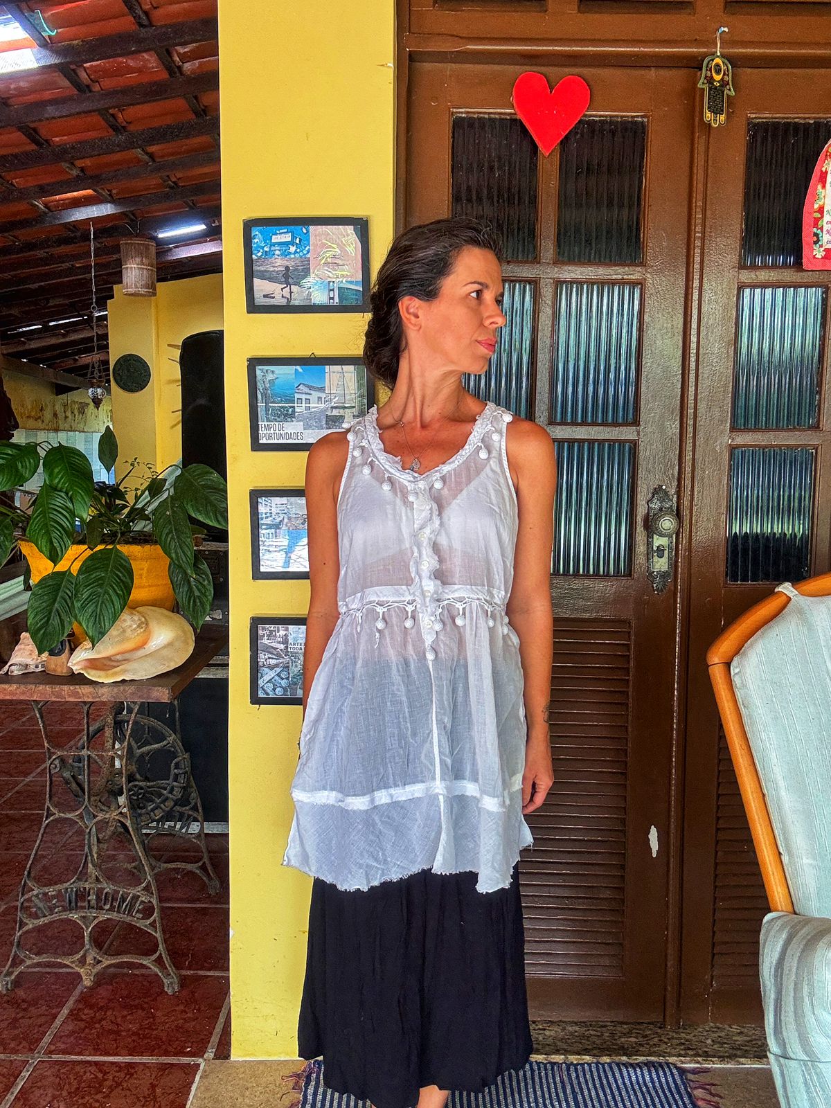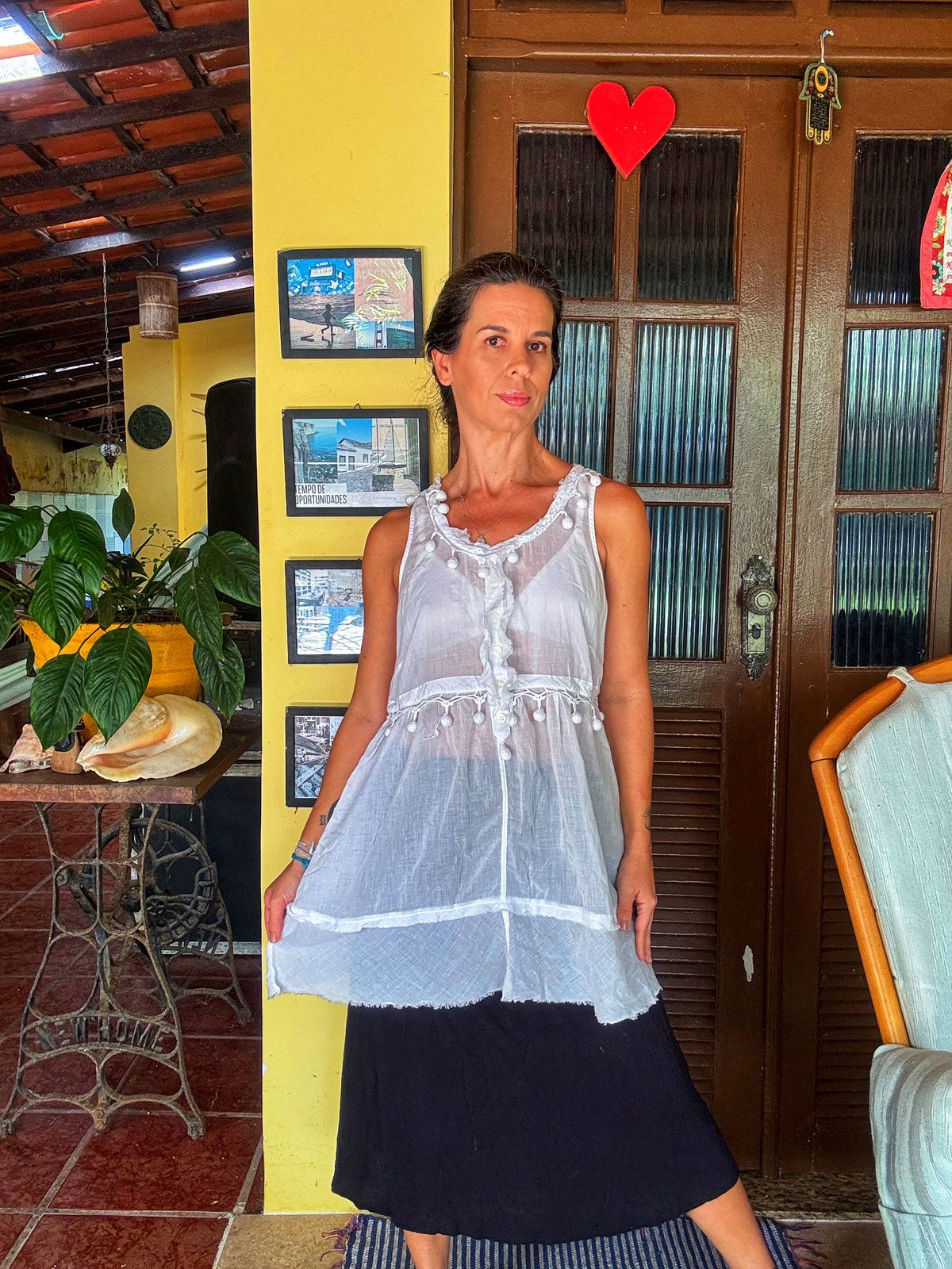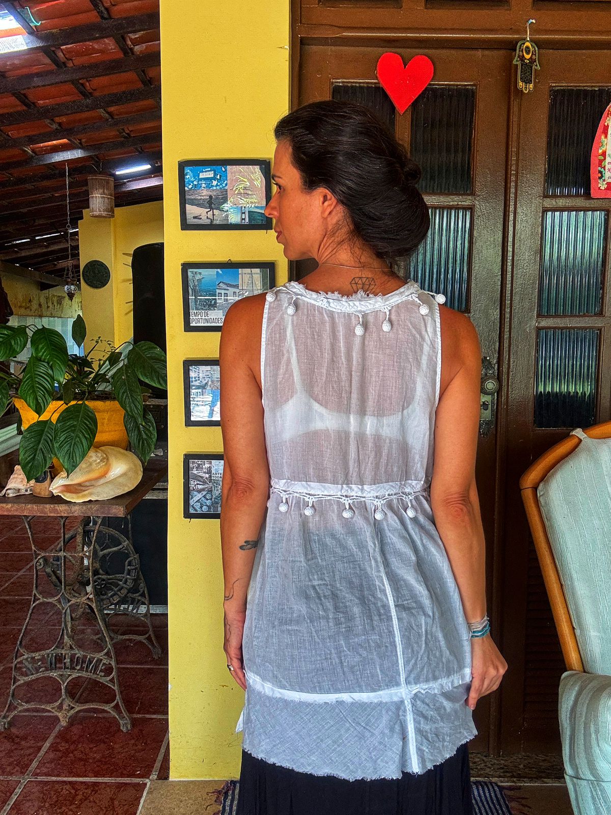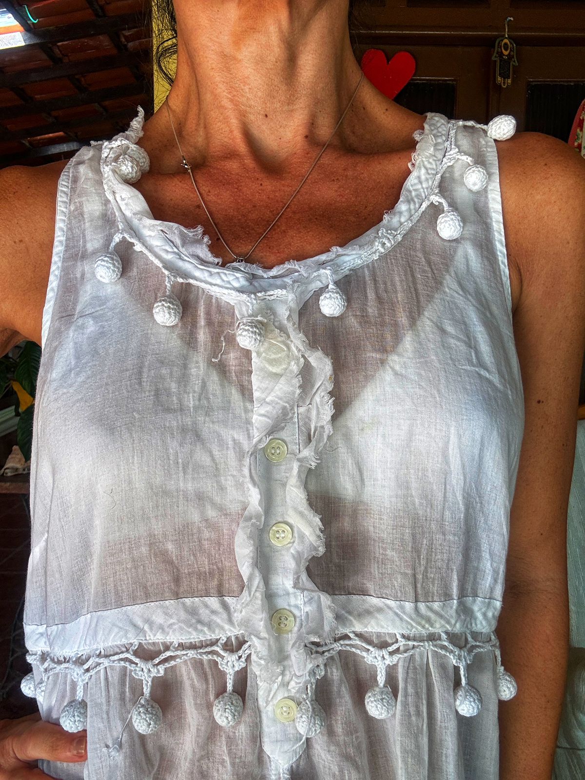 Encantadora bata branca sem mangas, com detalhes de pompons e rendas artesanais no decote V e cintura império. Tecido leve e fluido com leve transparência. Perfeita para um look boho-chic, como saída de praia ou peça casual. Ótimo estado.
