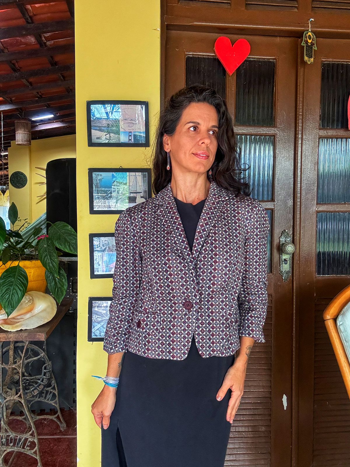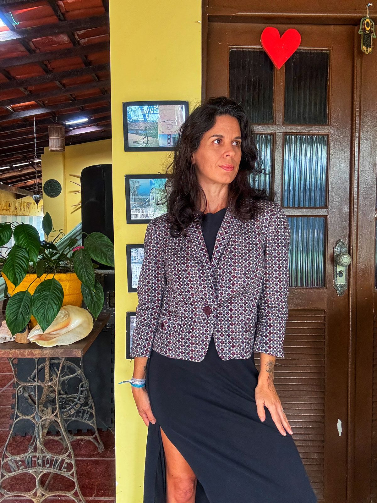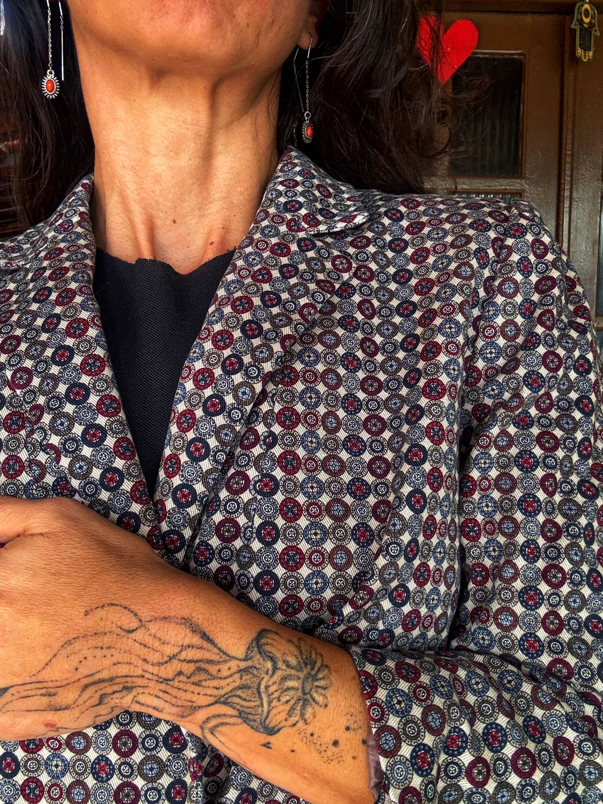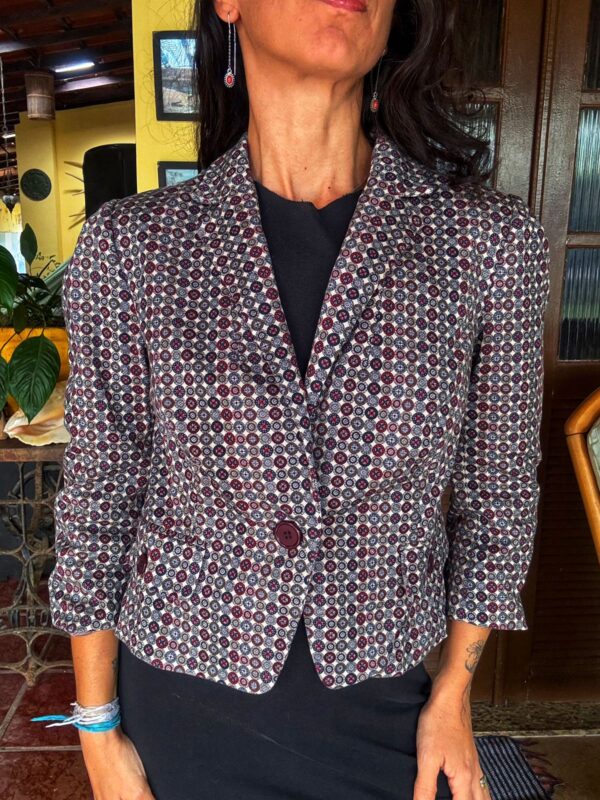 Este blazer com estampa em círculos de tons azul marinho e vermelho bordô é a peça perfeita para quem busca estilo e originalidade. Com corte clássico e mangas 3/4, ele adiciona um charme vintage e versátil a qualquer look.