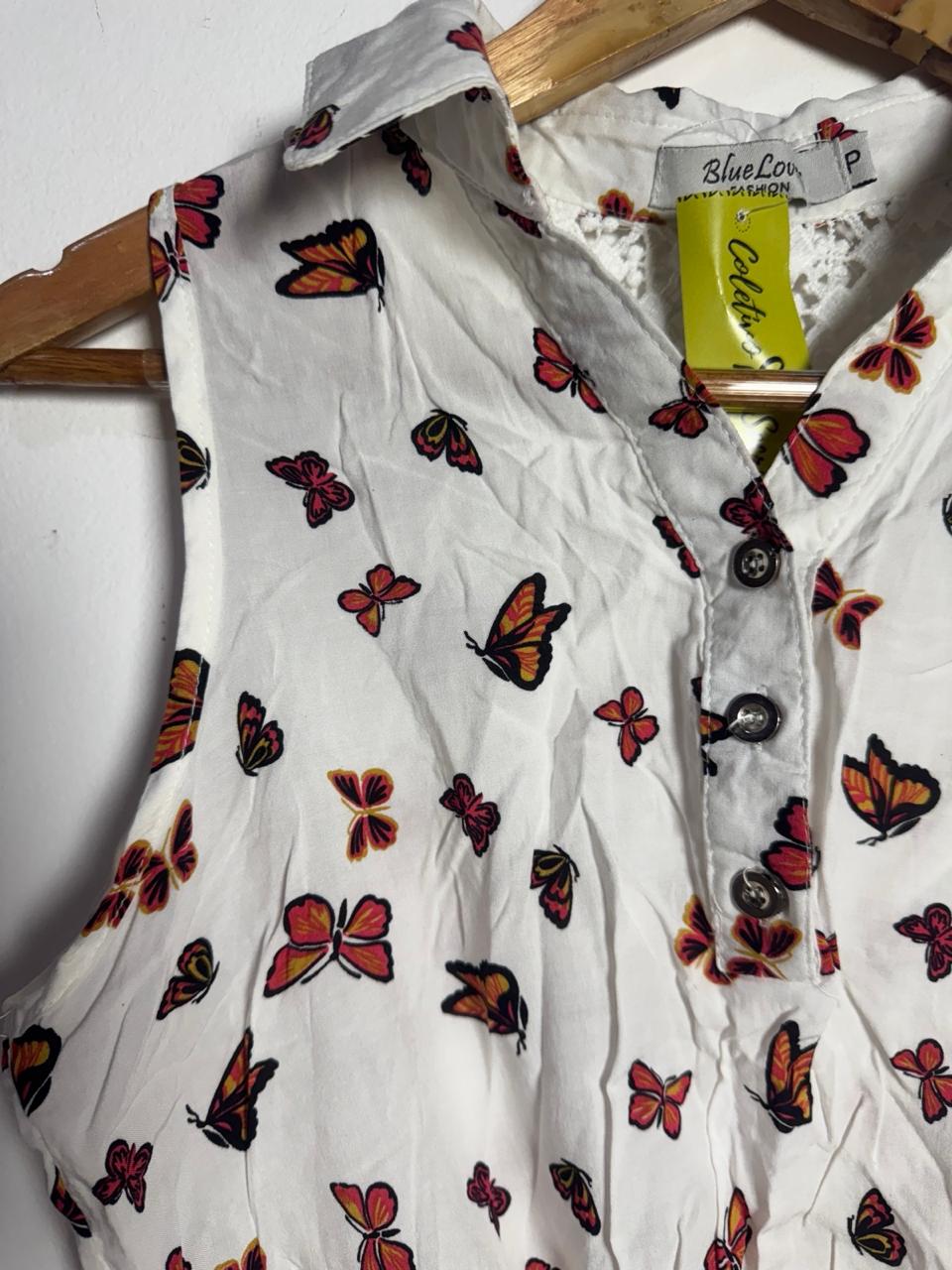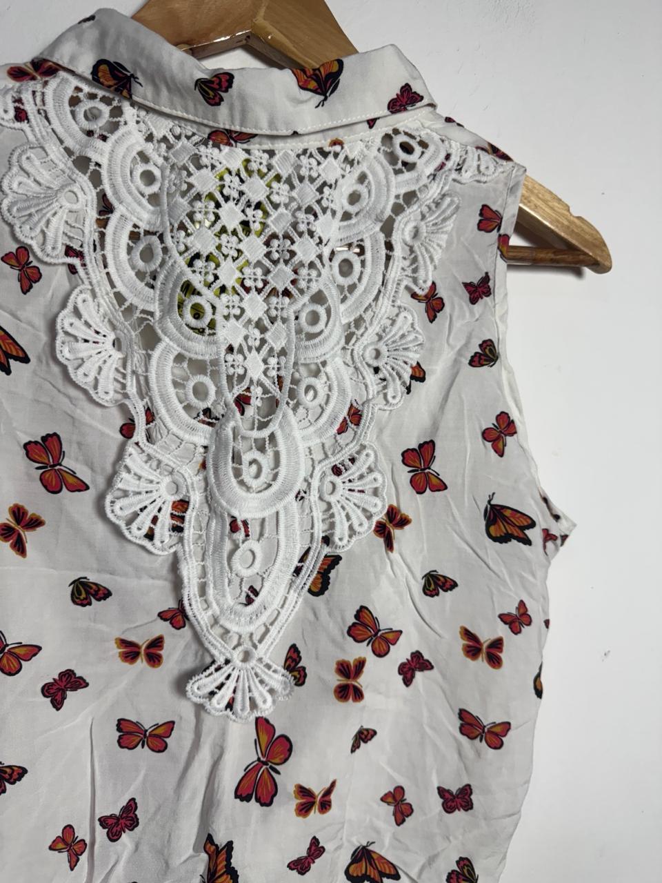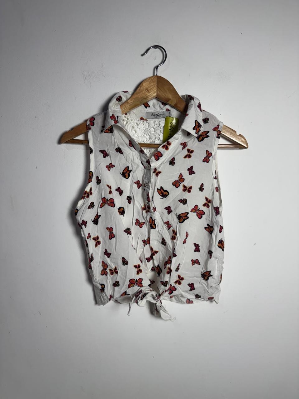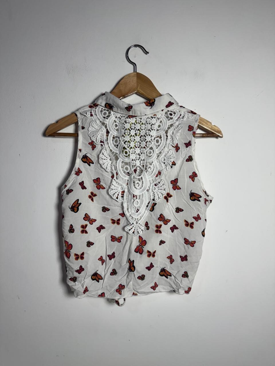 Blusa cropped sem mangas, estampa delicada de borboletas e fechamento em nó frontal, com painel em renda guipir nas costas. Um toque vintage e romântico para looks leves de verão.