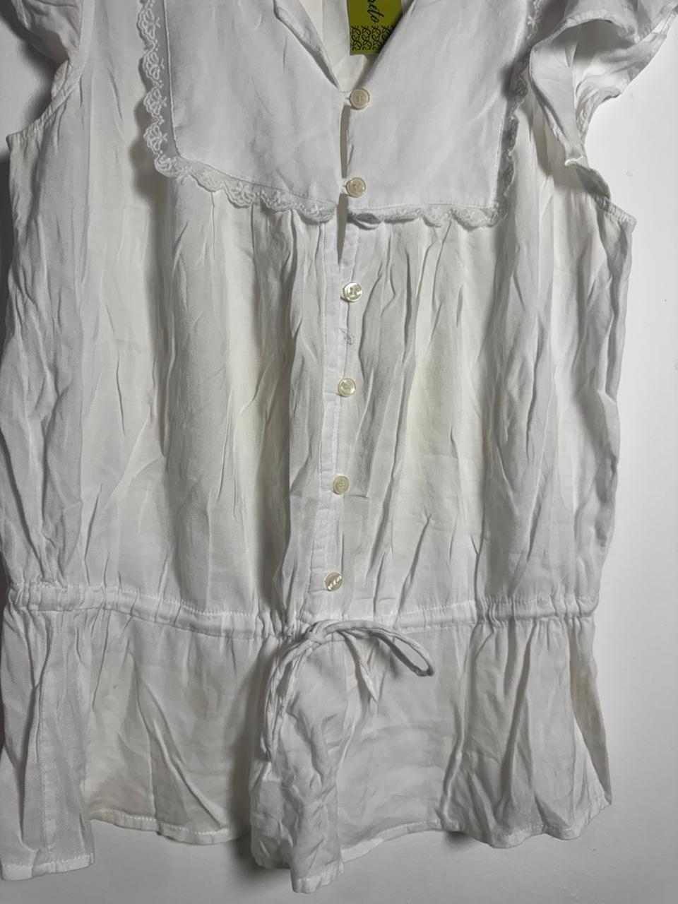 Blusa branca com botões frontais, mangas fluidas e ajuste de amarração na cintura. Uma peça romântica e leve para compor looks frescos de passeio.