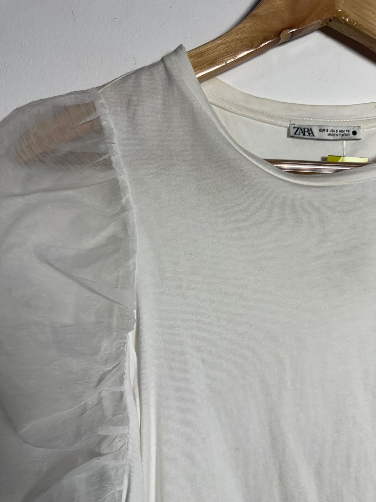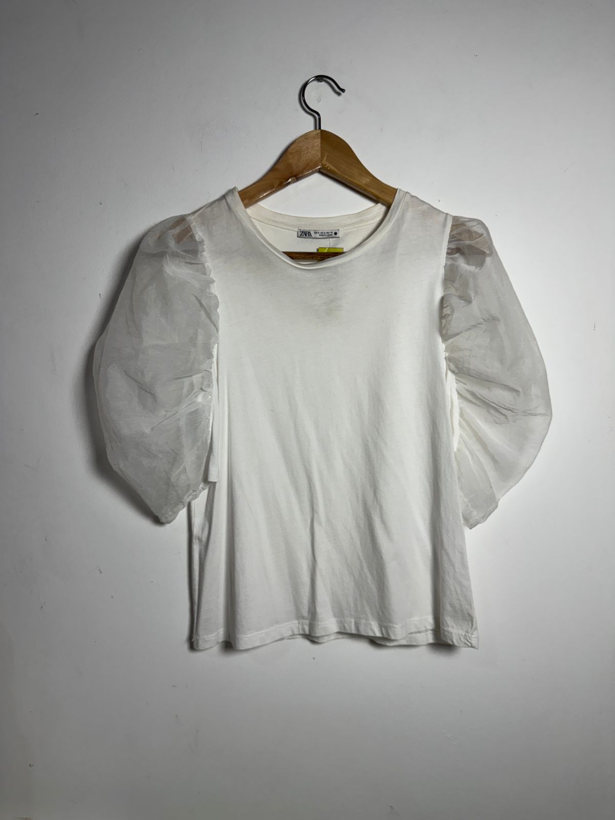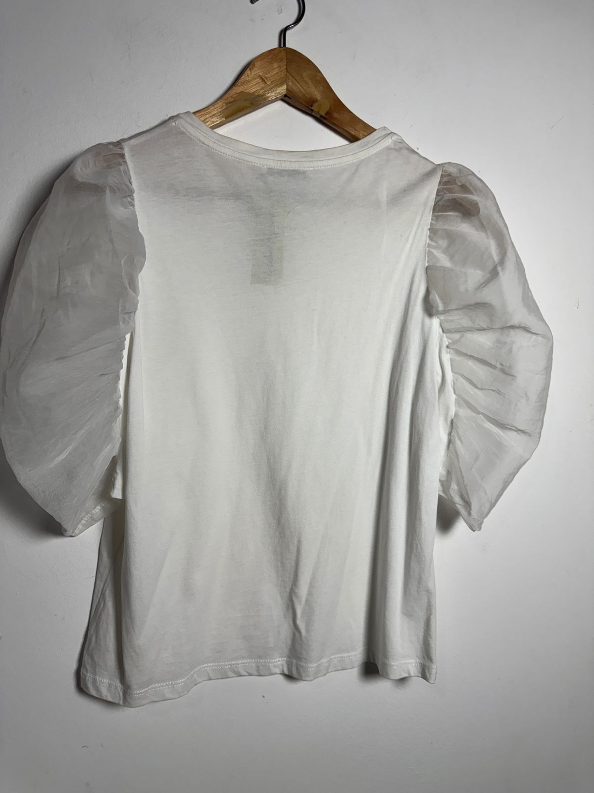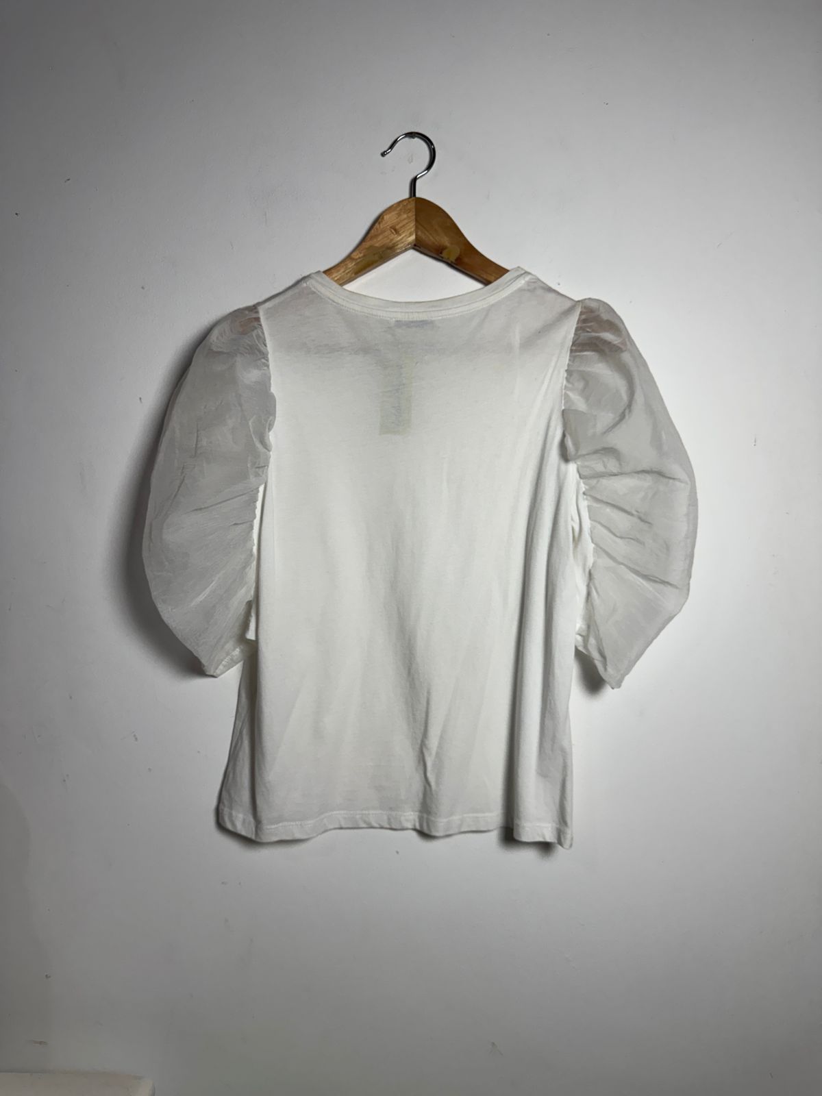 Estilosa e Moderna: camiseta básica branca com mangas bufantes em organza translúcida. Uma peça versátil que adiciona um toque de sofisticação a qualquer look casual.