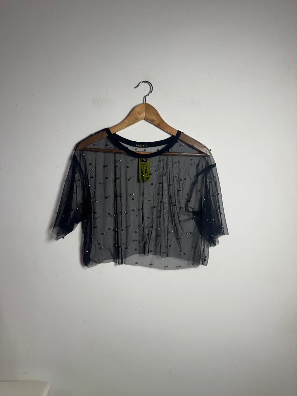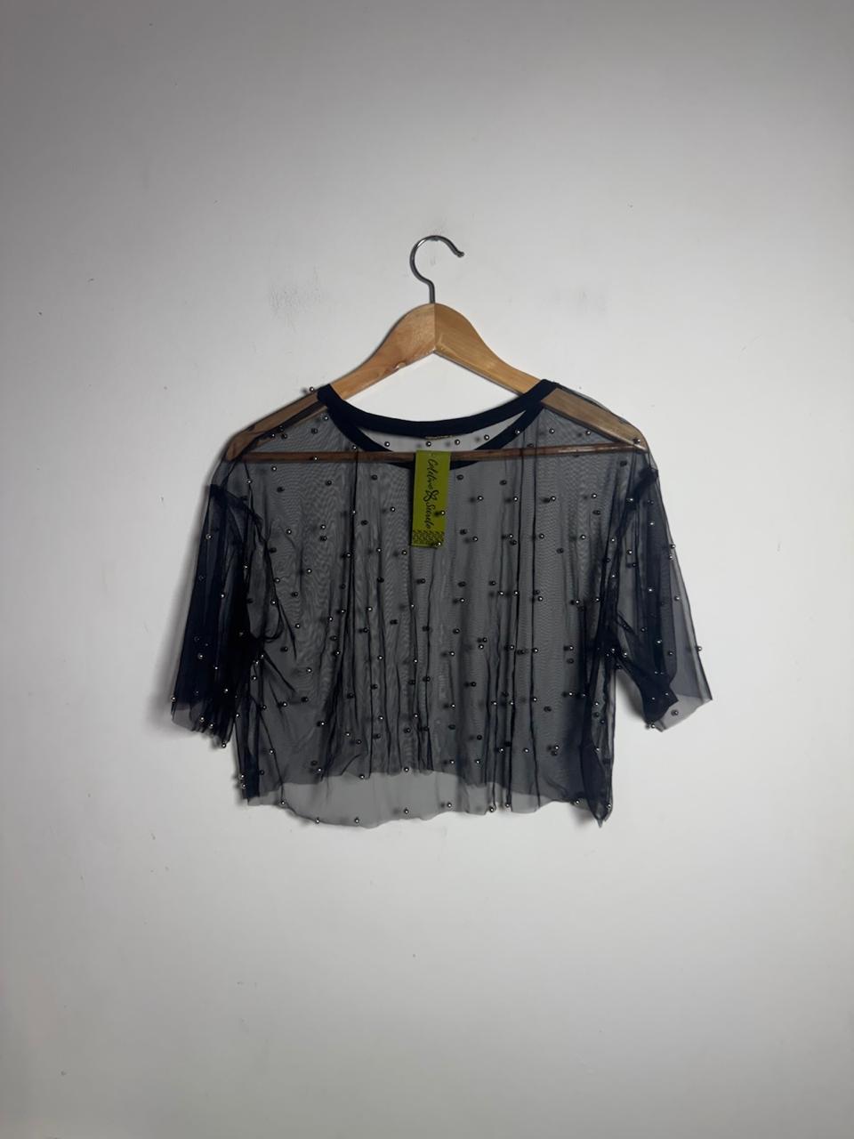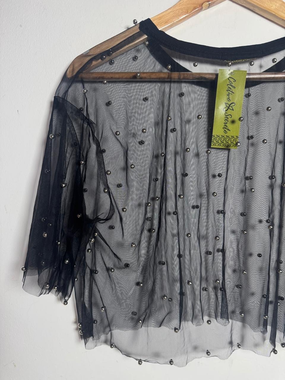 Blusa preta transparente com aplicação de pequenas esferas brilhantes e gola redonda. Sugestão ideal para sobreposições criativas em looks festivos ou noturnos.