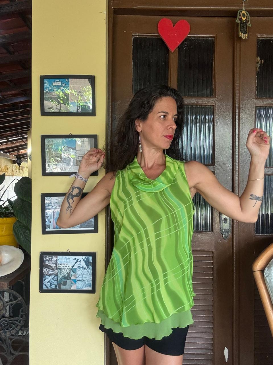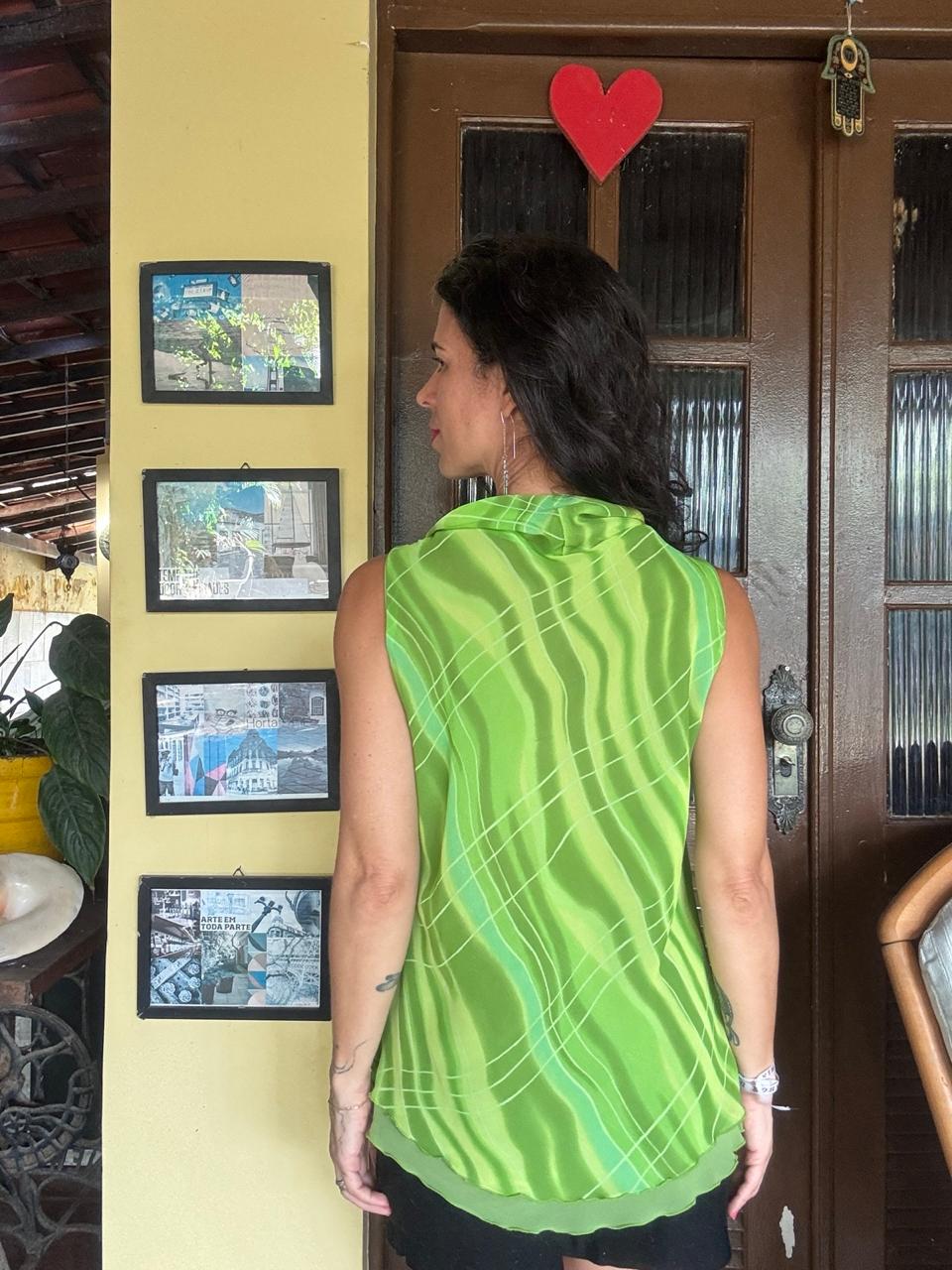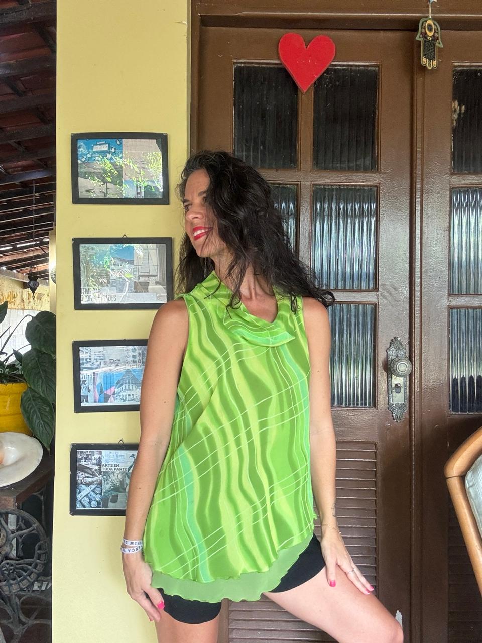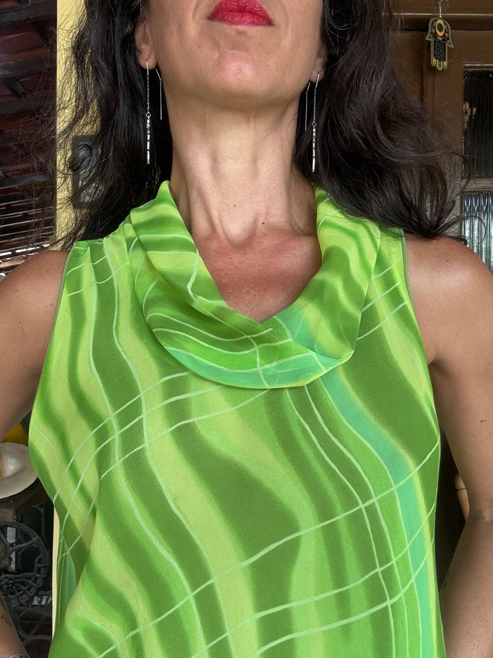 Movimento & Cor: Confeccionada em tecido leve com transparência sutil e estampa abstrata em tons de verde, destacando-se pelo charmoso decote degagê. 🍏 Uma peça vibrante com barra em camadas que adiciona leveza ao visual, perfeita para iluminar qualquer composição do dia à noite.