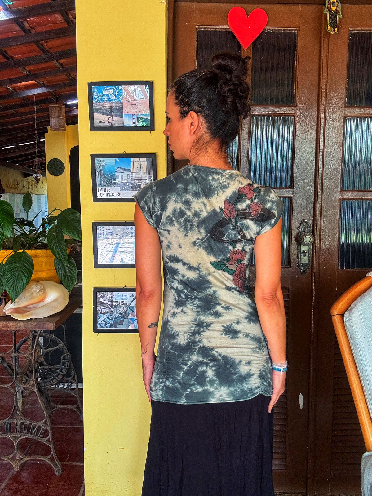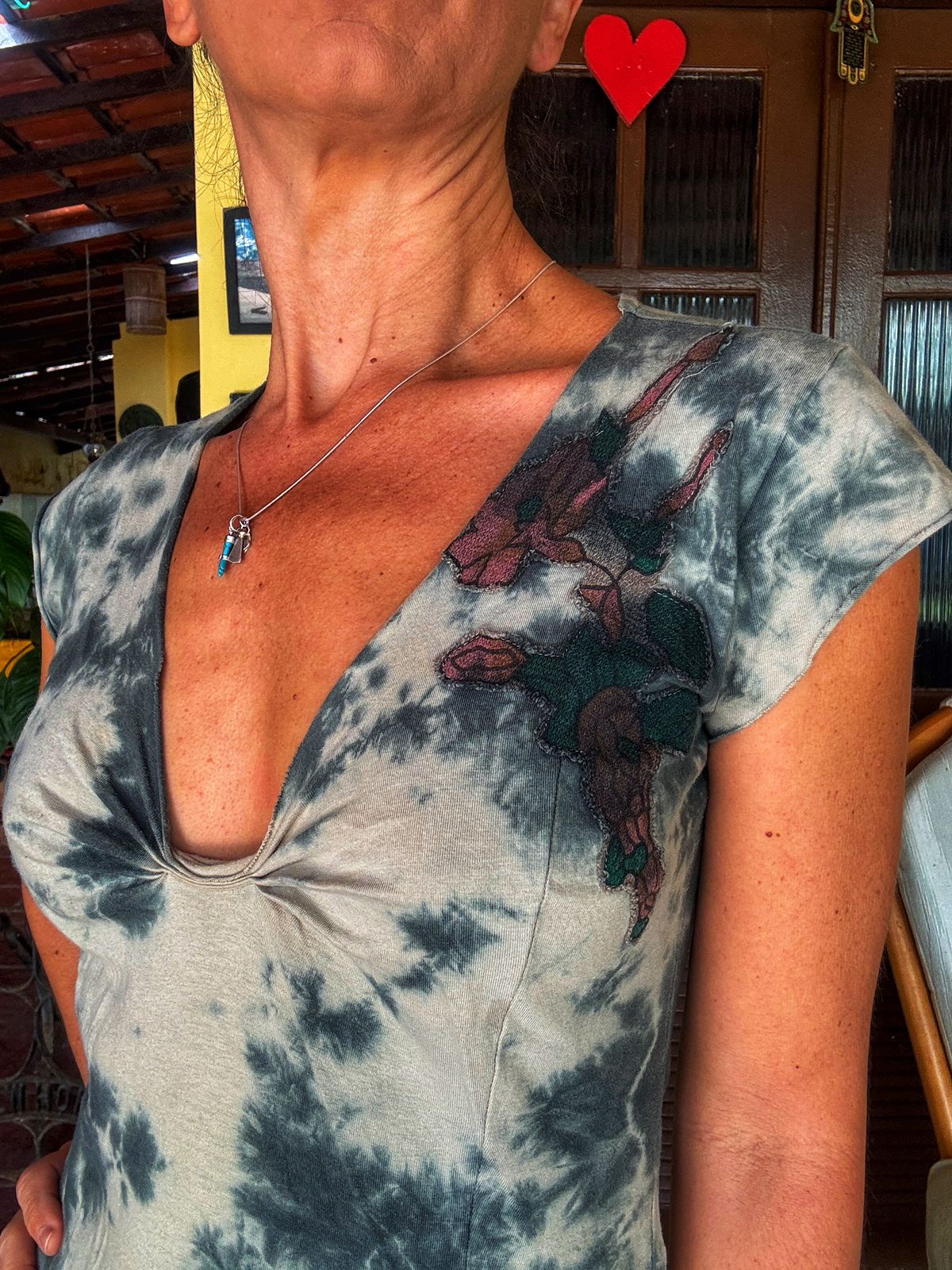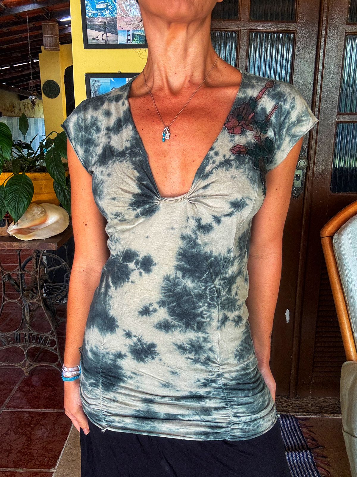 Blusa em malha tie-dye nas cores off-white e cinza/verde escuro, com um decote V profundo e detalhe franzido no busto. Apresenta uma charmosa estampa floral estilizada no ombro e costas em tons de rosa e marrom. Uma peça moderna e com um toque artístico. Ótimo estado.