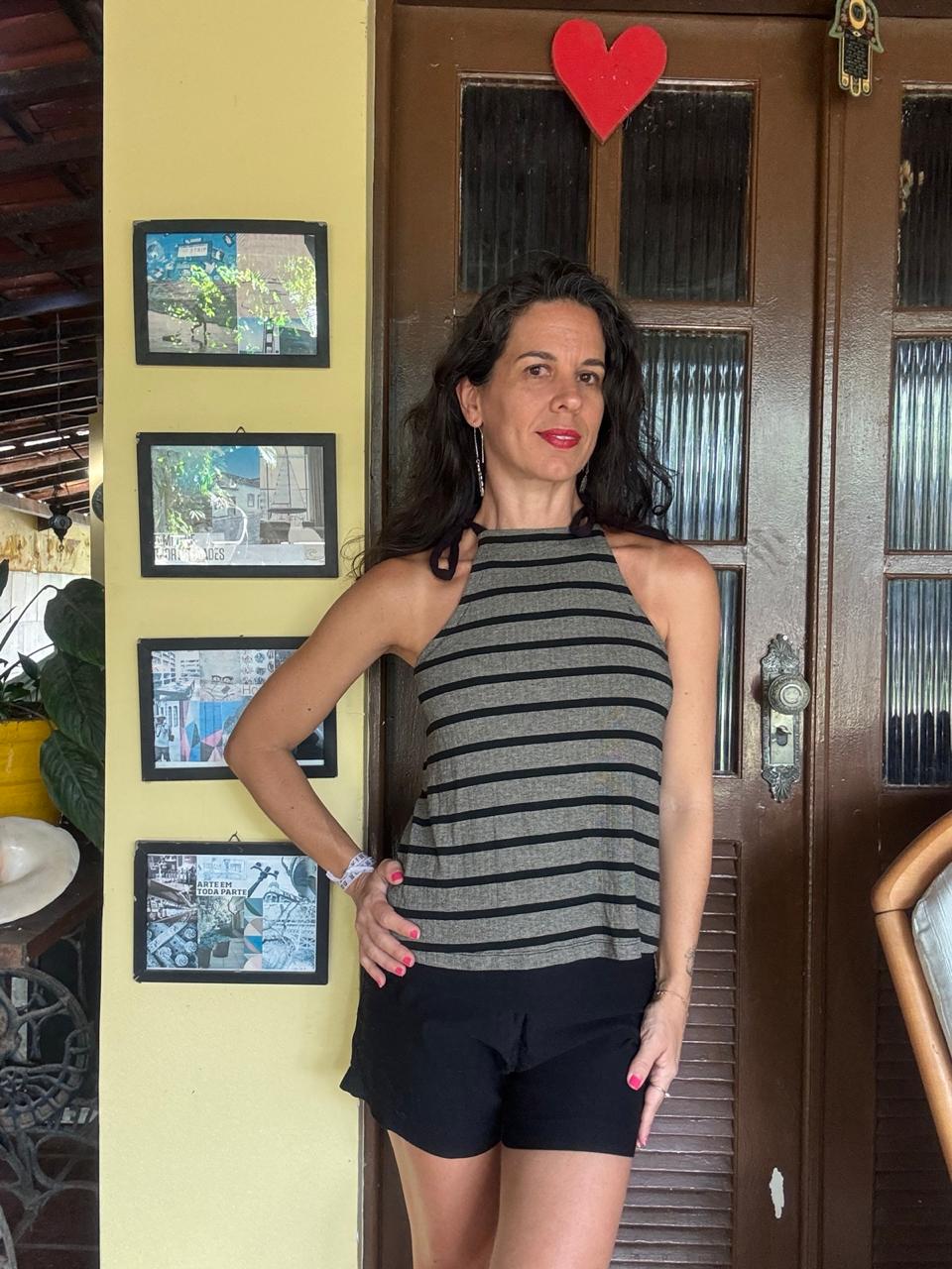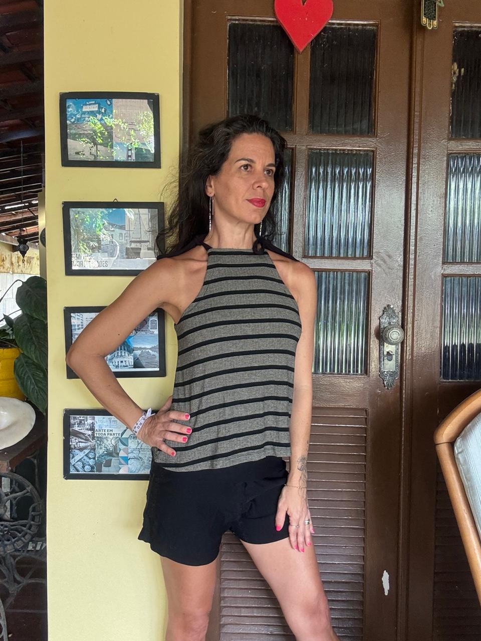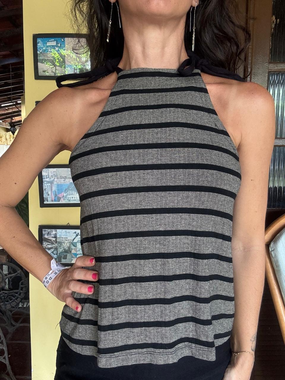 Conforto & Estilo: Confeccionada em malha canelada cinza com listras pretas, possui modelagem frente única com charmosas amarrações nos ombros. 🧶 Uma peça básica e cheia de bossa, com detalhe em couro nas costas, perfeita para compor looks despojados com o seu jeans favorito.