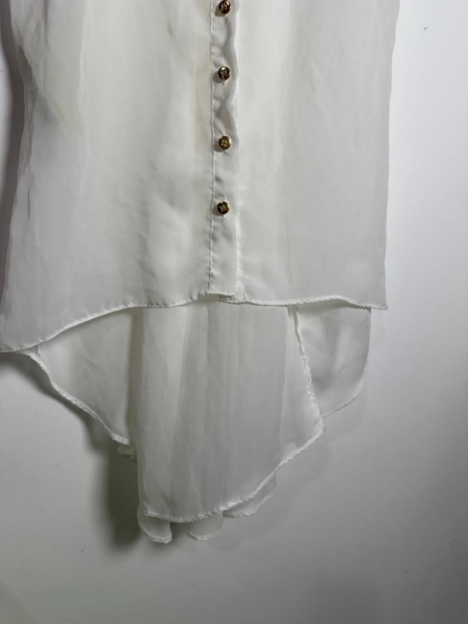 Blusa com fechamento frontal por botões dourados, gola colarinho e comprimento alongado na parte posterior. Uma peça fluida e elegante para compor looks de trabalho ou eventos casuais sofisticados.