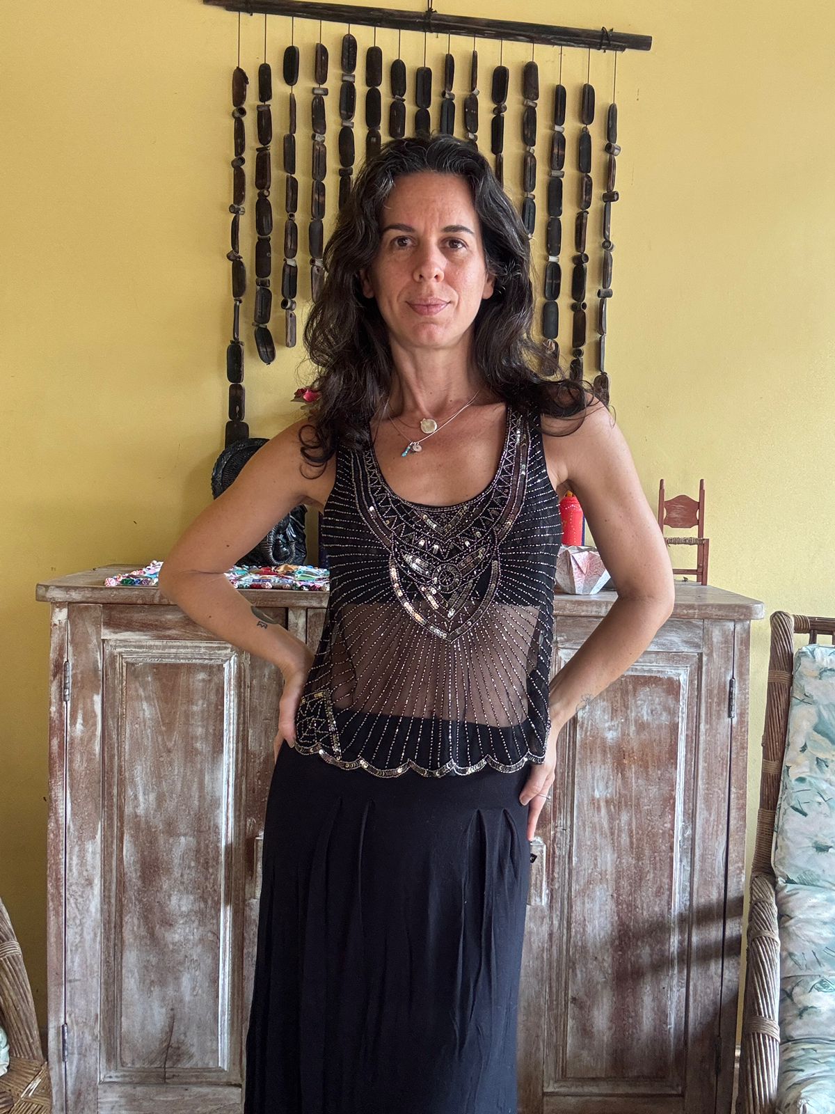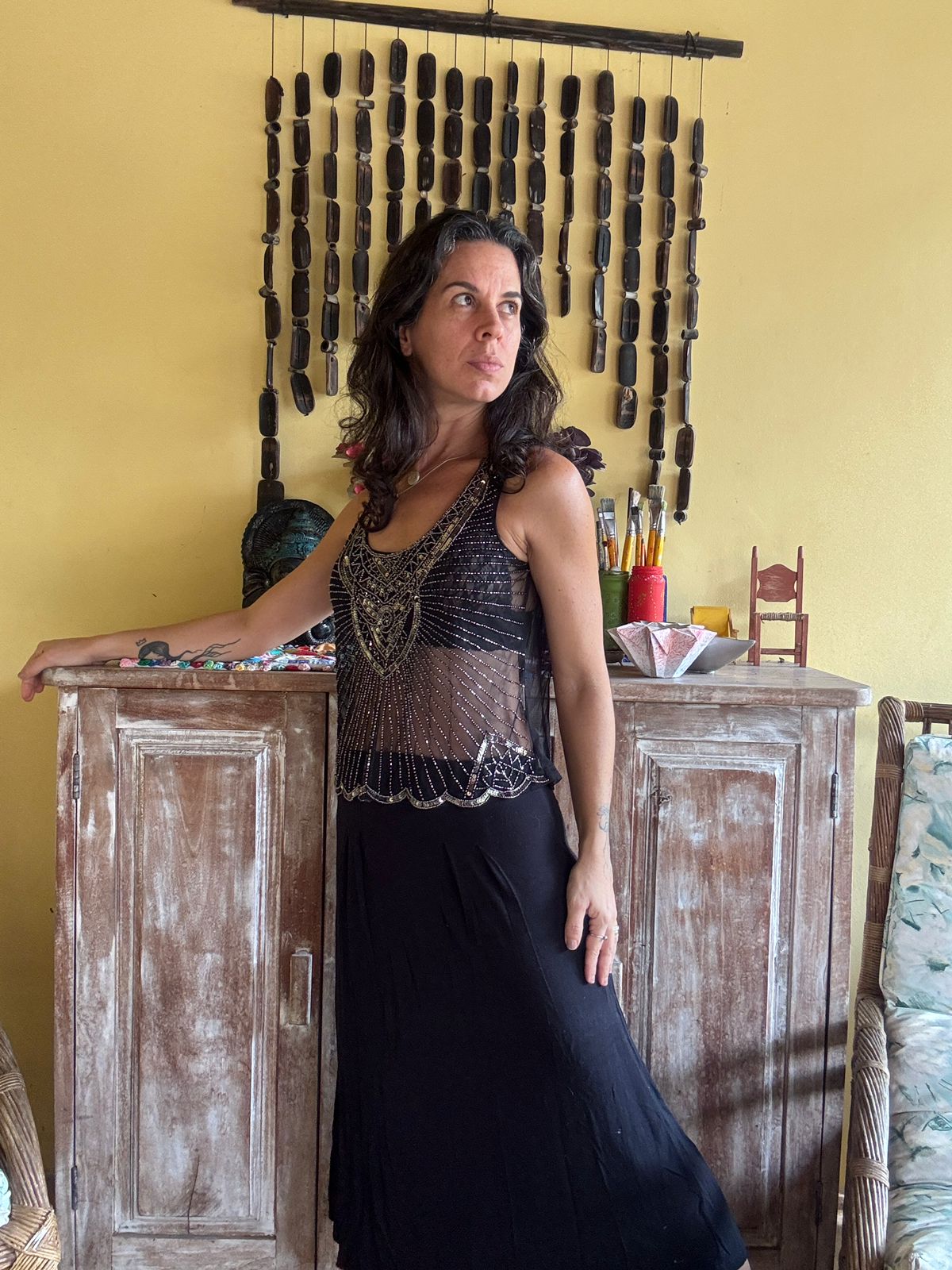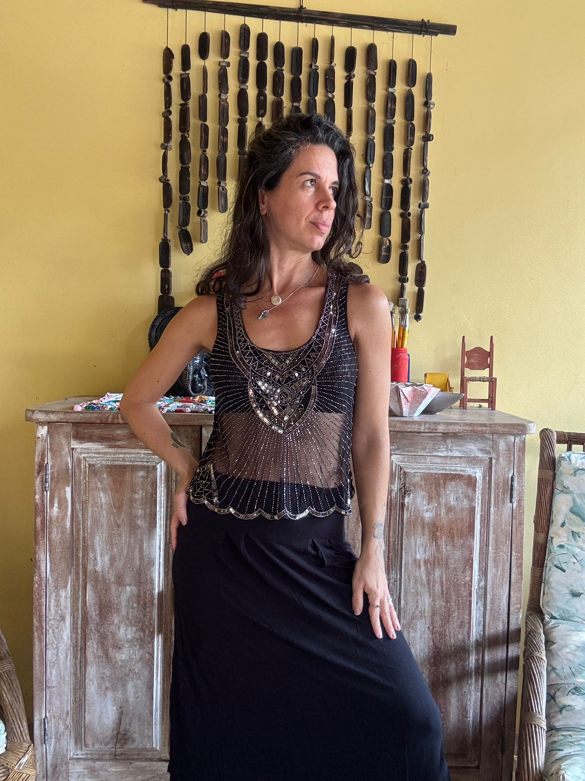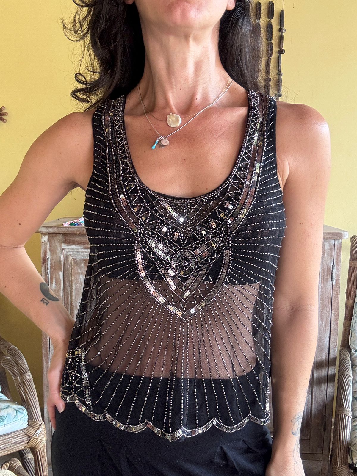 Regata preta em tule de transparência, inteiramente bordada com miçangas e paetês em tons de preto, prata e dourado, formando um desenho geométrico estilo art déco. Uma peça de brechó que evoca o glamour da era Gatsby e é perfeita para criar um visual noturno deslumbrante e vintage!