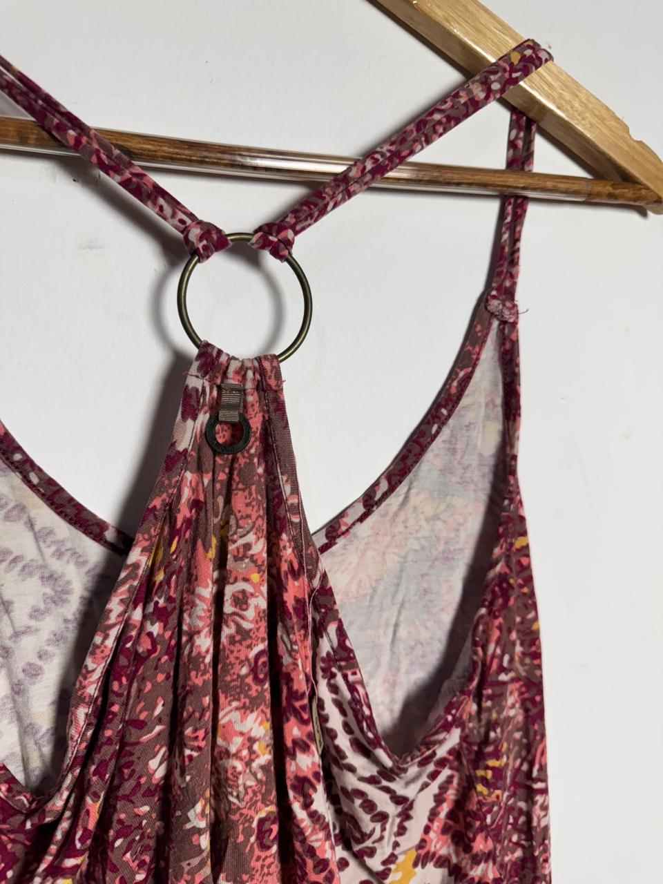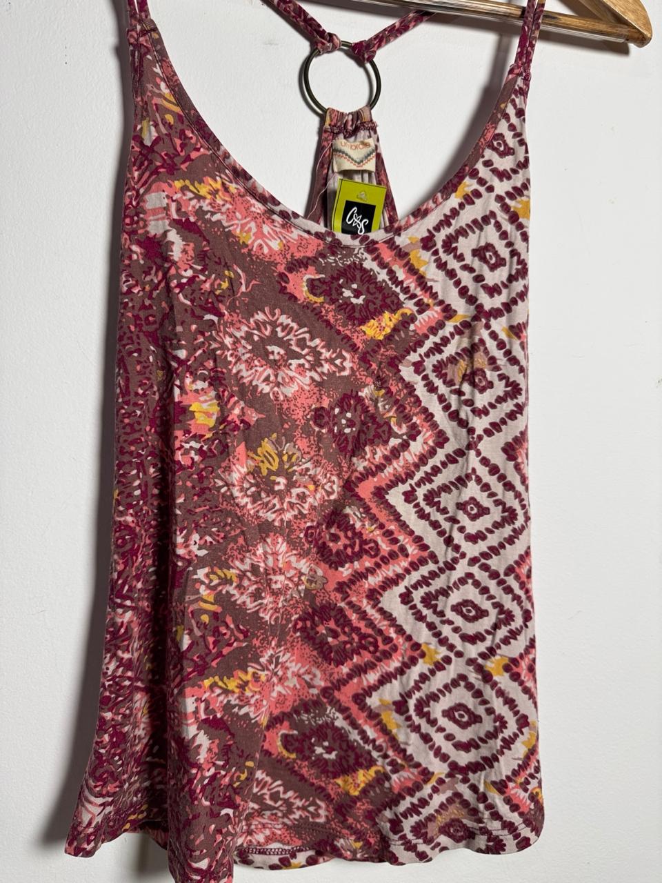 Regata fluida com estampa mista tie-dye / étnica em tons de vinho, rosa e amarelo, e decote nadador com detalhe em argola metálica. Peça leve e colorida, perfeita para compor looks de verão com estilo boho-chic.
