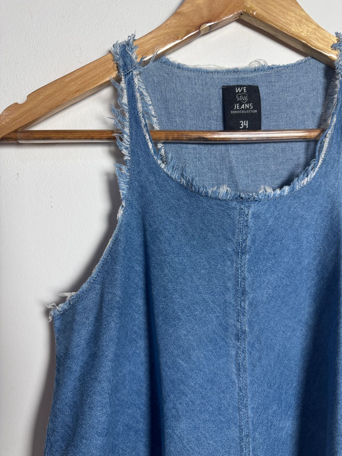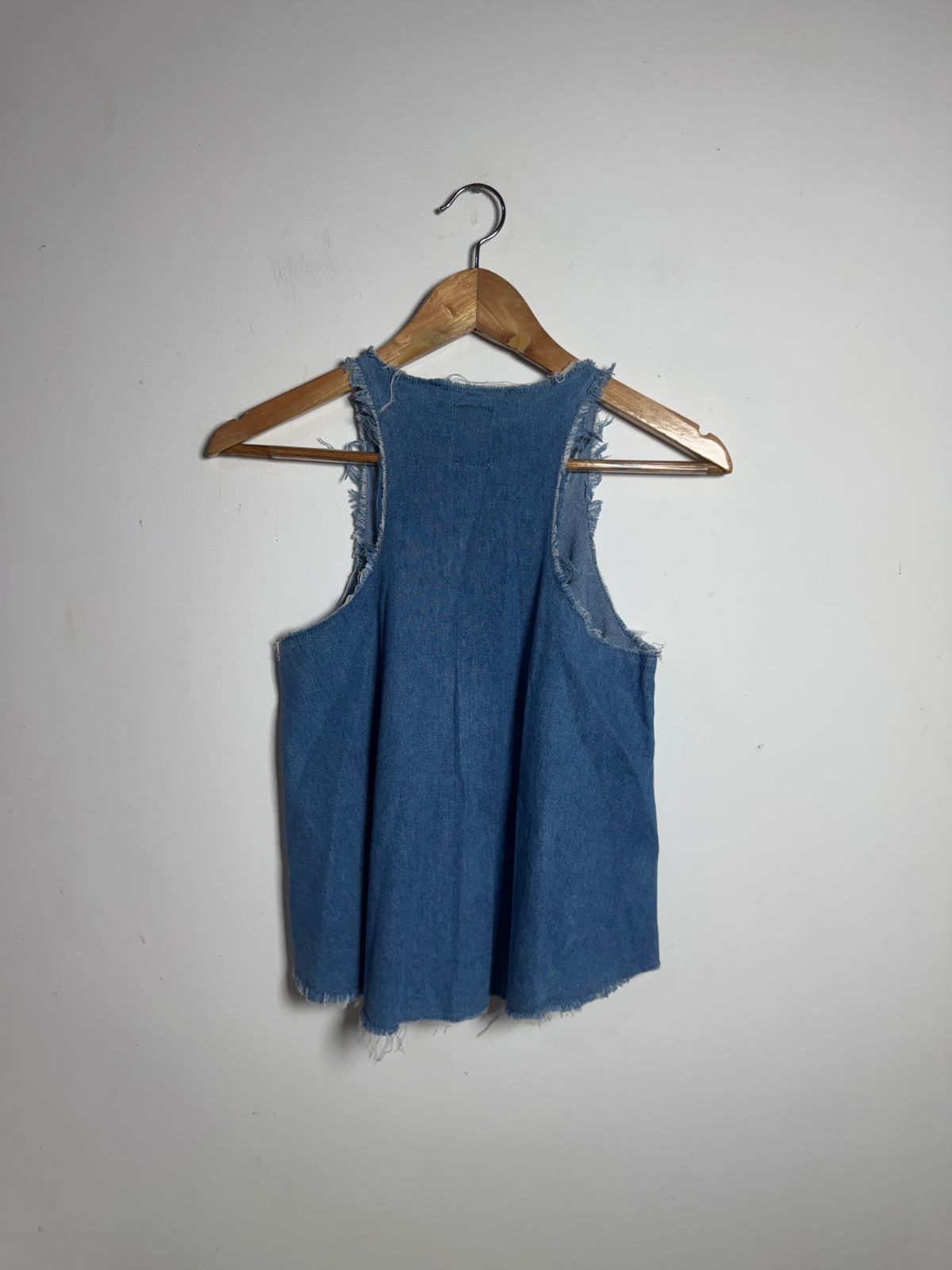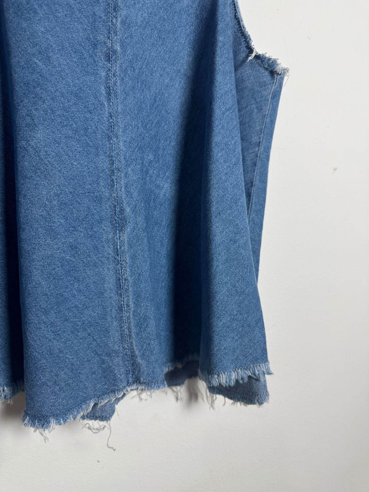 Regata em jeans leve e fluído (denim) com modelagem evasê, super confortável e estilosa. Destaque para as cavas e barra desfiadas, trazendo um toque moderno e boho-chic ao clássico denim.