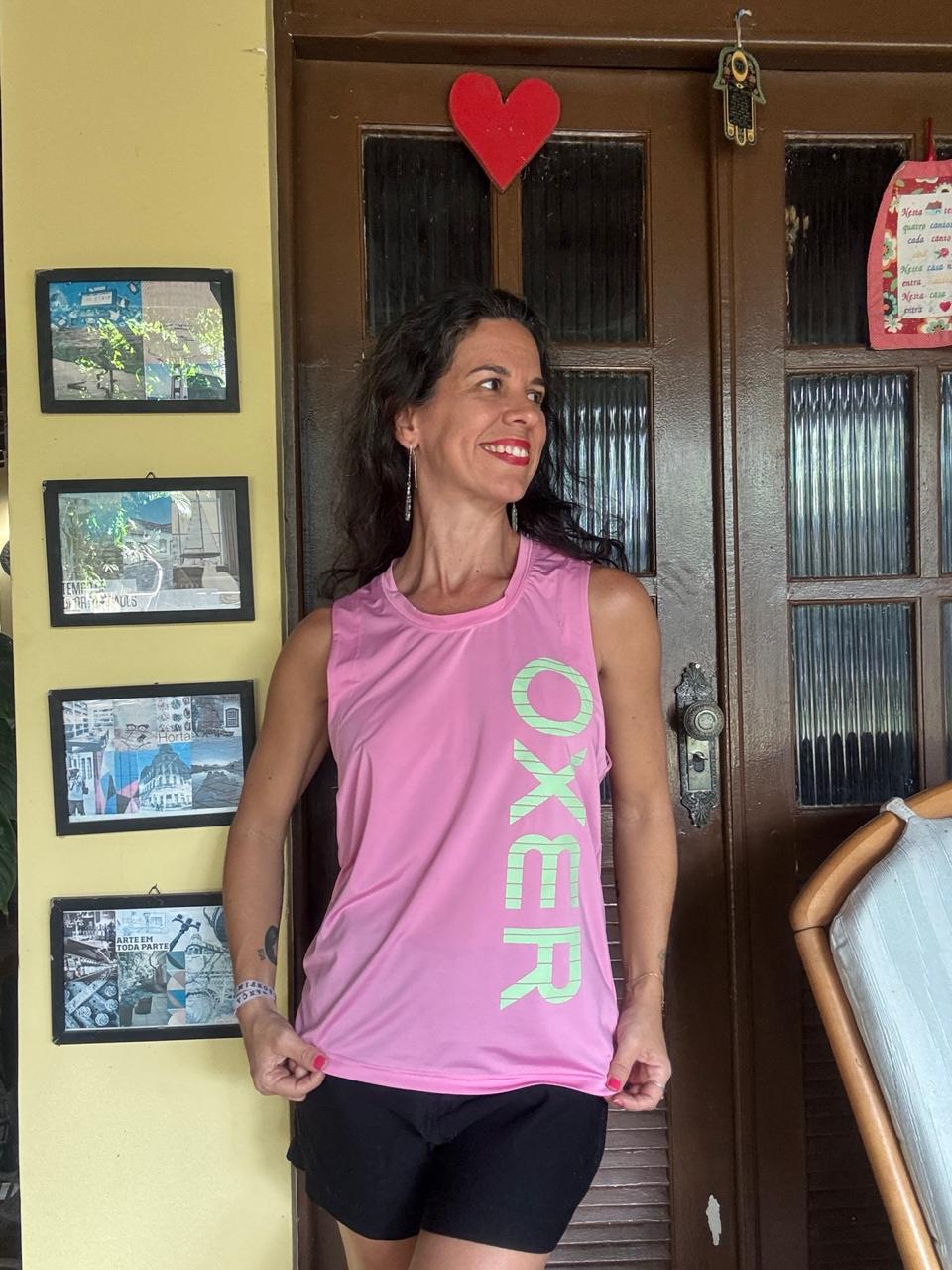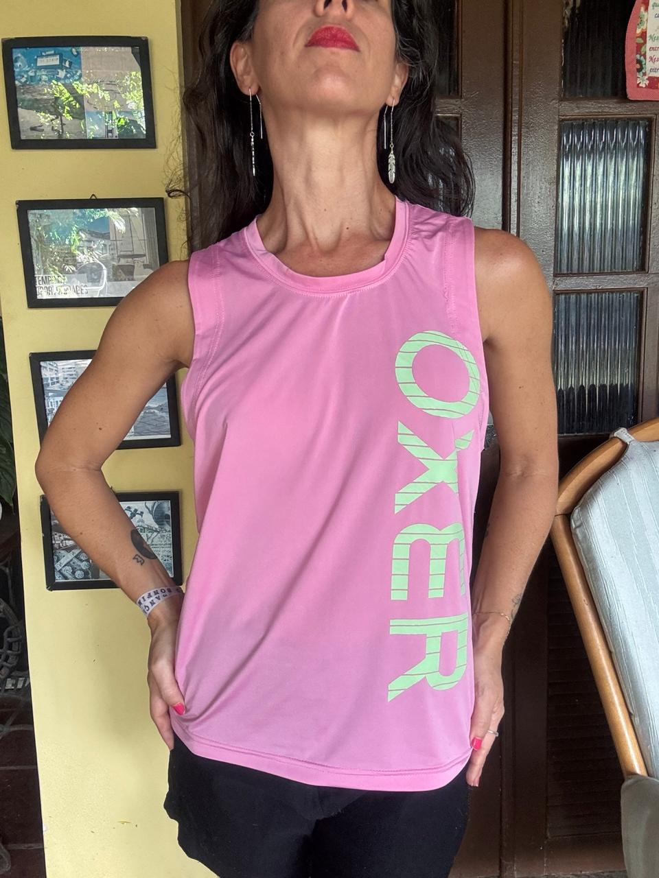 Esta regata esportiva em tom rosa vibrante traz a tecnologia dry fit para máximo conforto térmico, destacando-se pela estampa lateral “OXER” em contraste verde neon. Com modelagem soltinha e decote redondo, é a peça ideal para garantir performance e estilo durante seus treinos ou momentos de lazer.