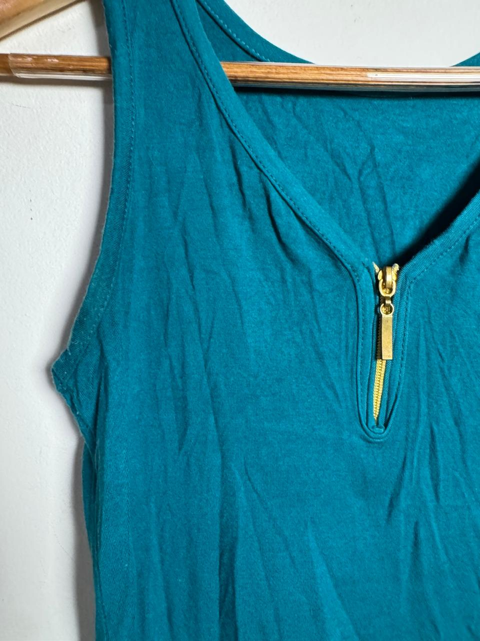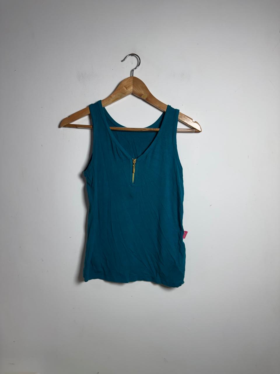 Regata na cor verde petróleo com decote em V e zíper dourado frontal. Peça básica e confortável, ideal para looks do dia a dia.