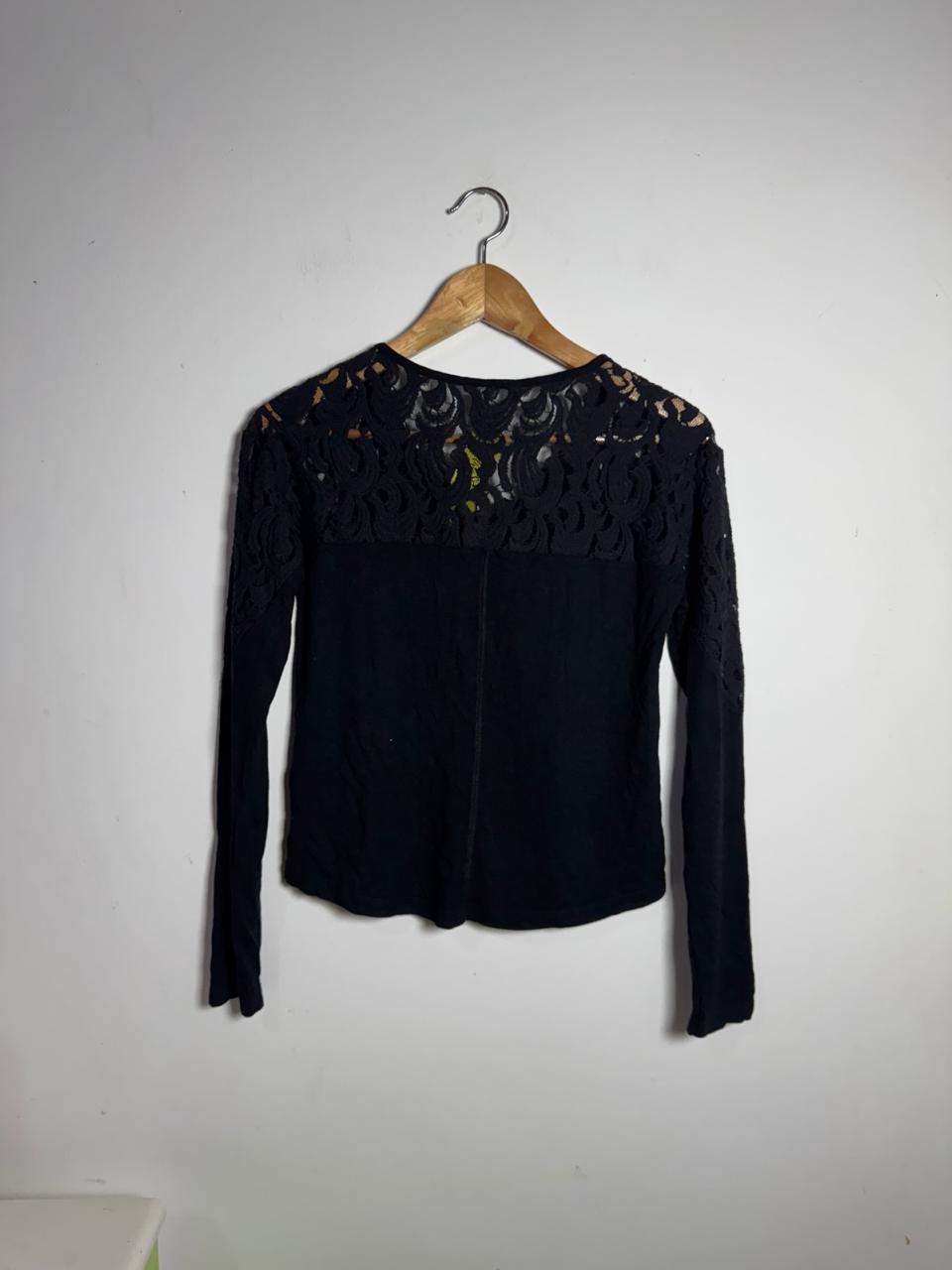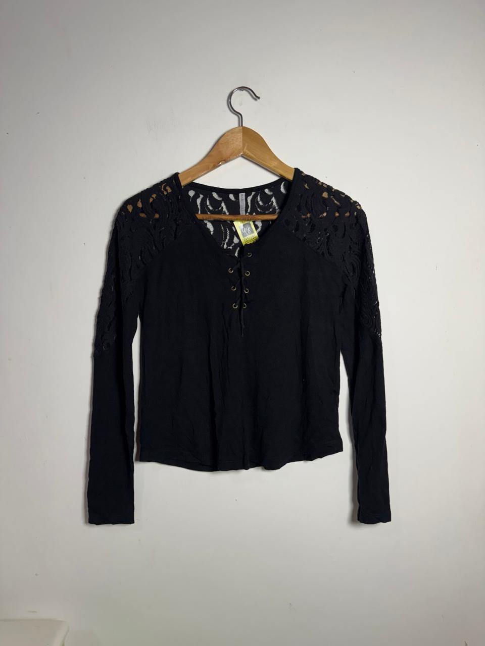 Blusa preta de manga longa com detalhe de renda nos ombros e pala das costas. Possui decote V com ilhós trançado (lace-up), combinando estilo romântico e uma pegada boho moderna.