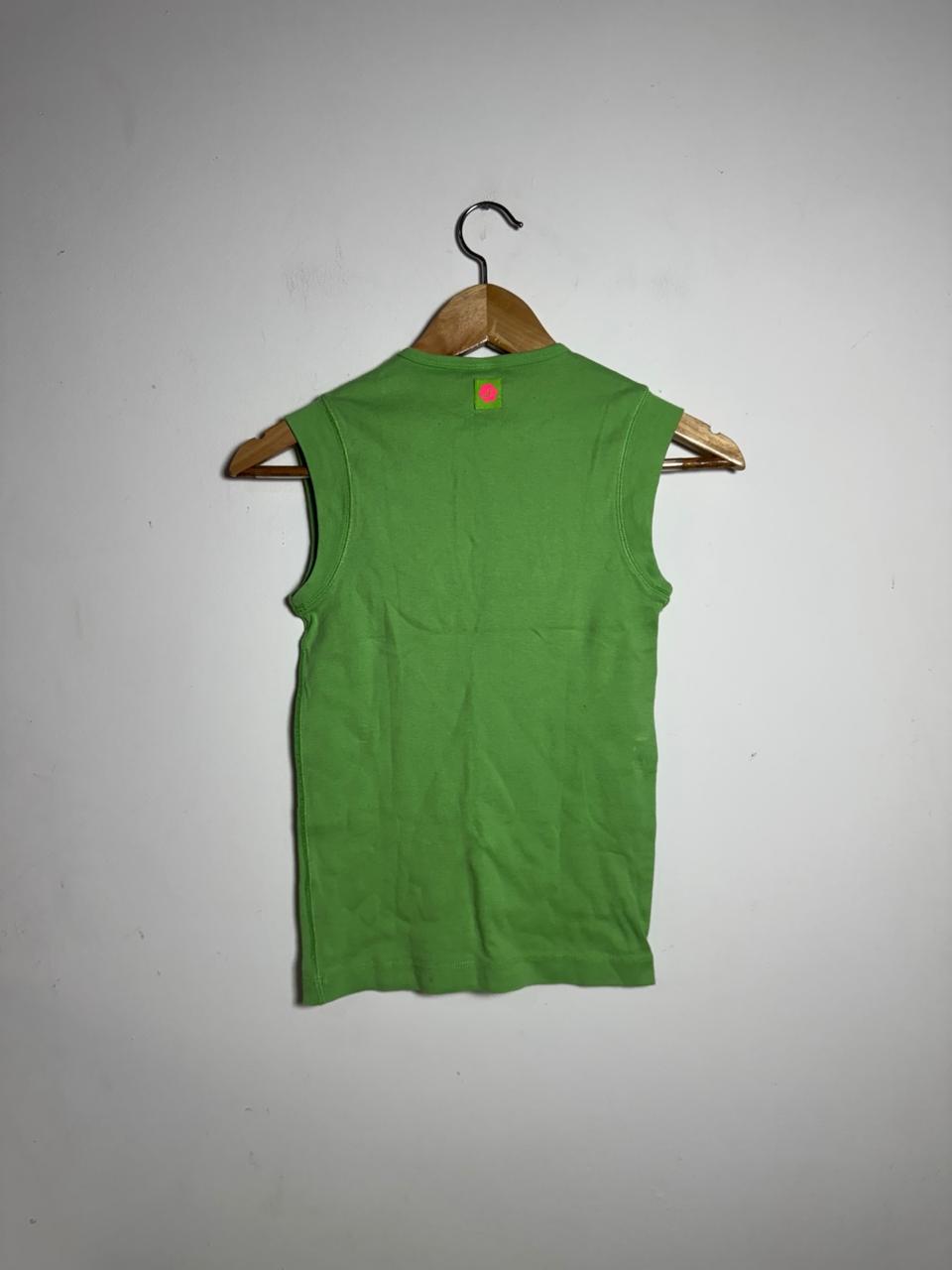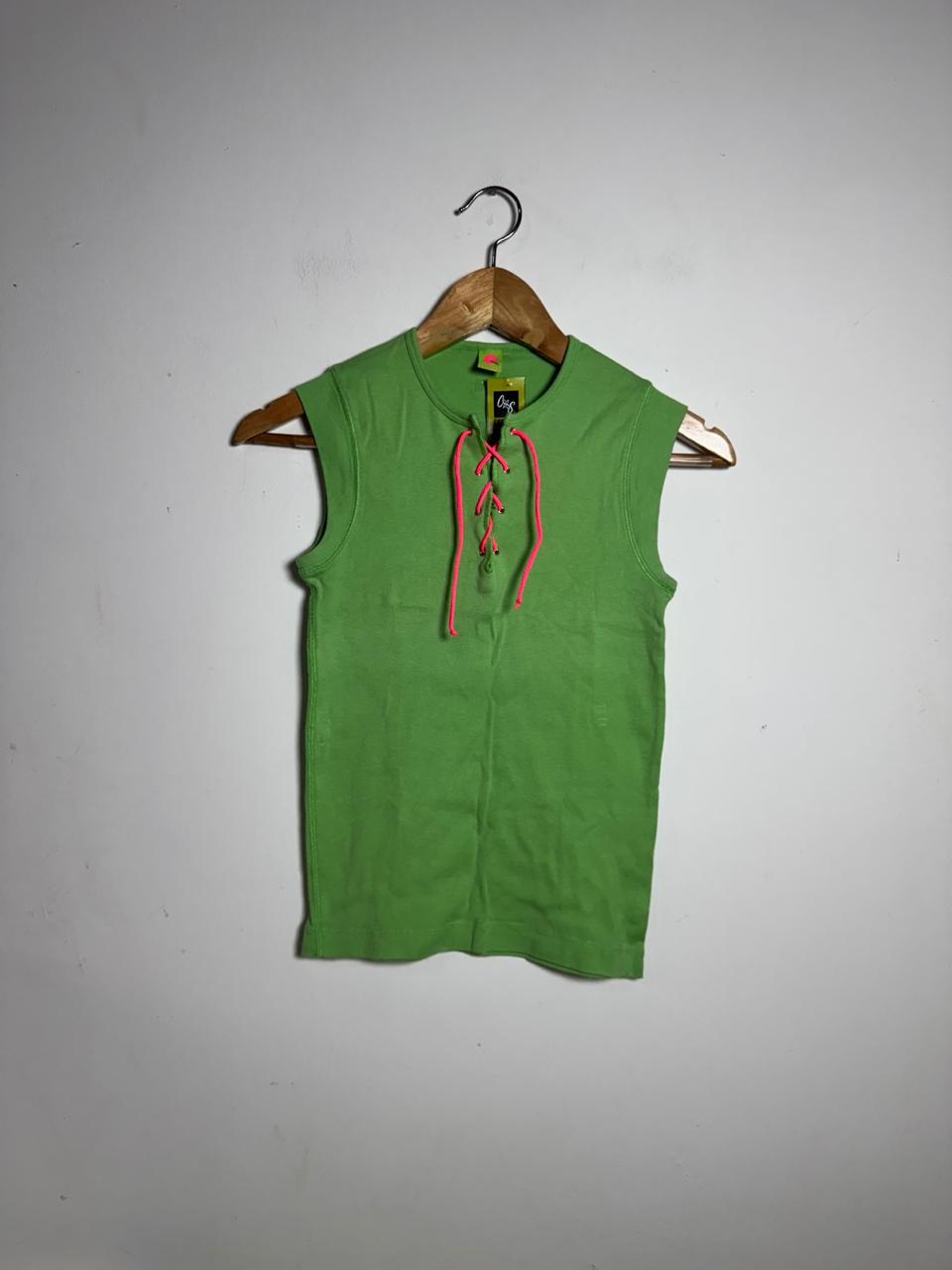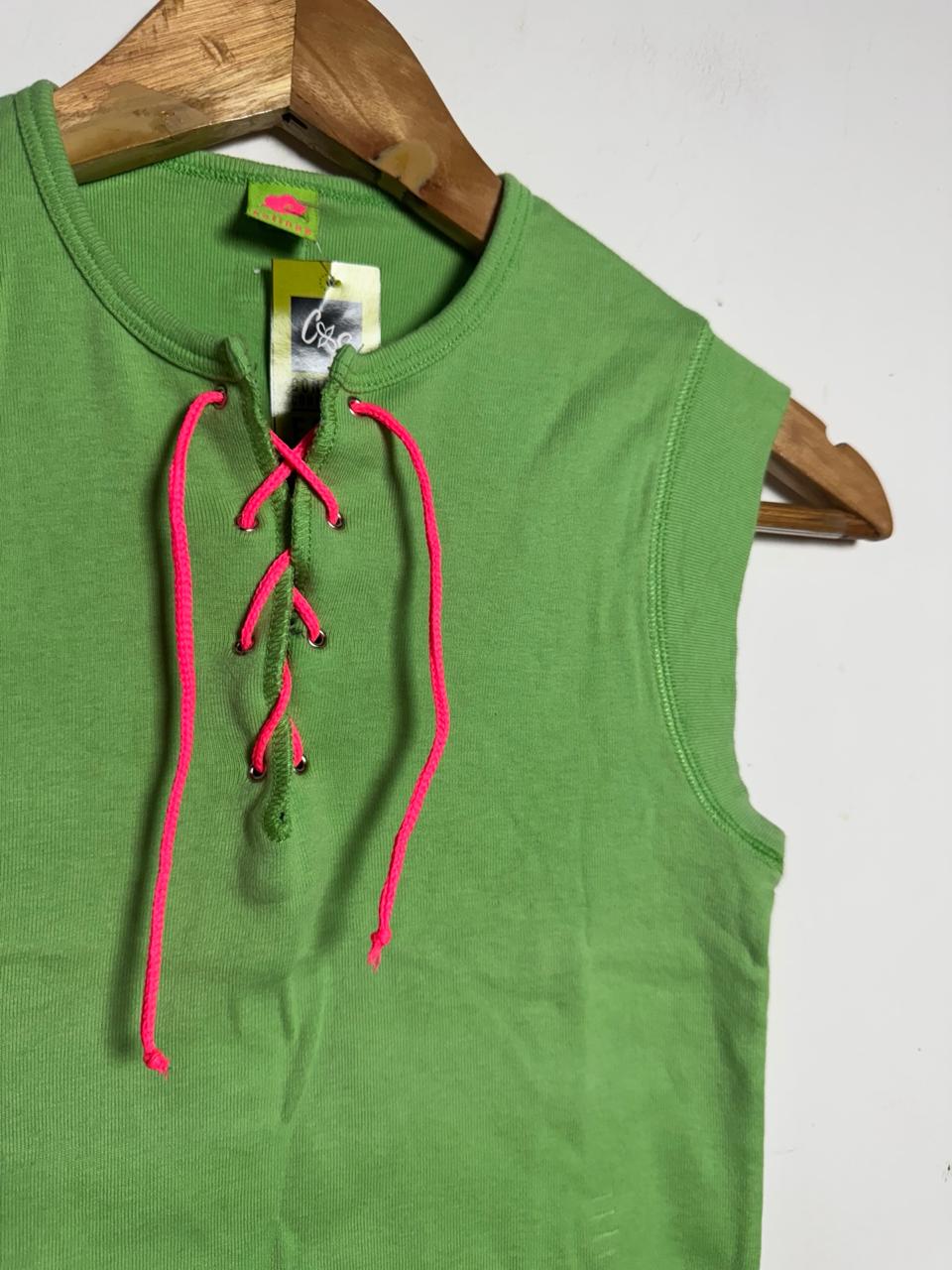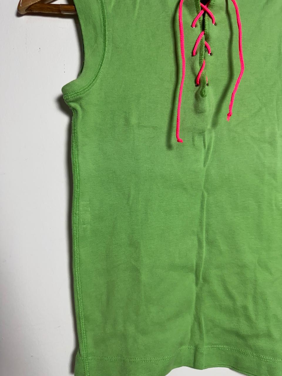 Regata de algodão no vibrante tom verde limão/neon, com um detalhe de amarração (lace-up) no decote. Os ilhoses metálicos e o cordão em pink neon criam um contraste moderno e arrojado, ideal para um look divertido e de destaque.