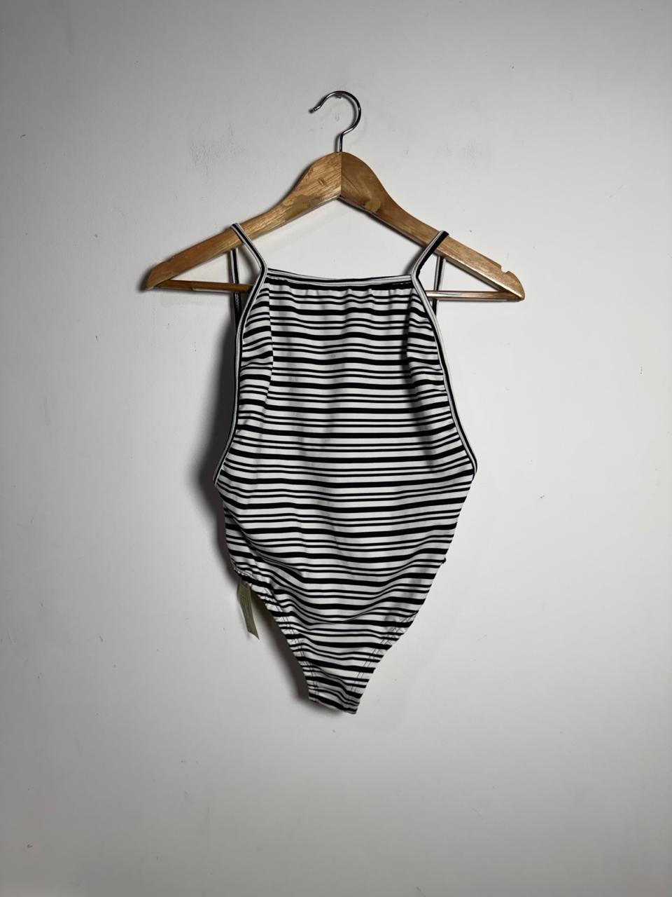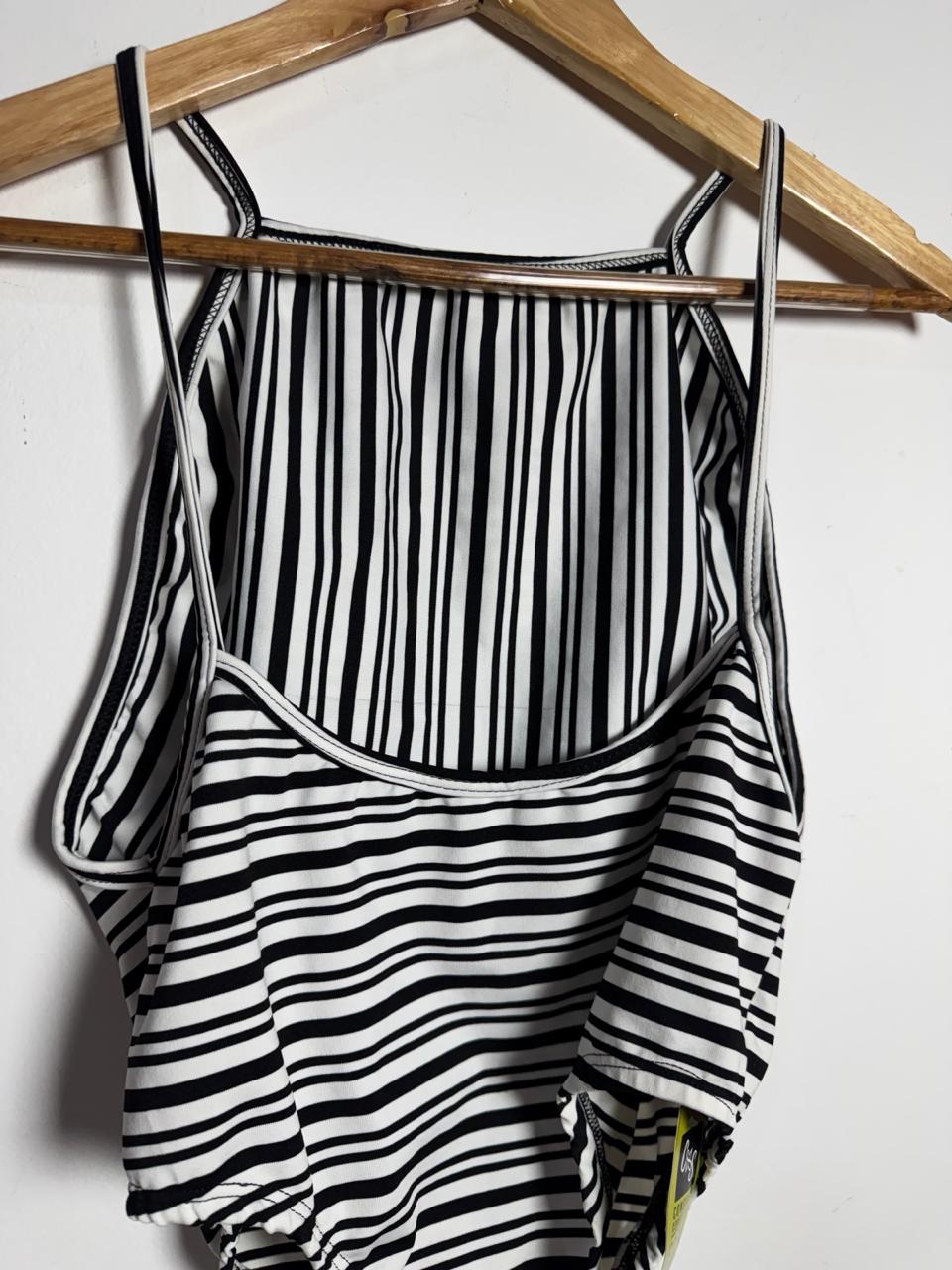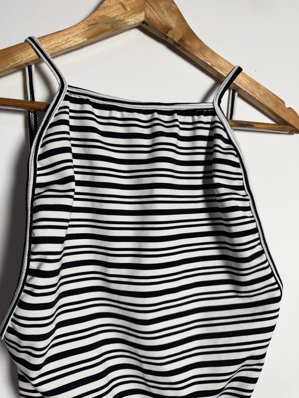 Body  de alças finas em malha canelada, com estampa clássica de listras pretas e brancas. Possui decote alto e costas nadador, sendo uma peça versátil que pode ser usada tanto na praia quanto em looks casuais.