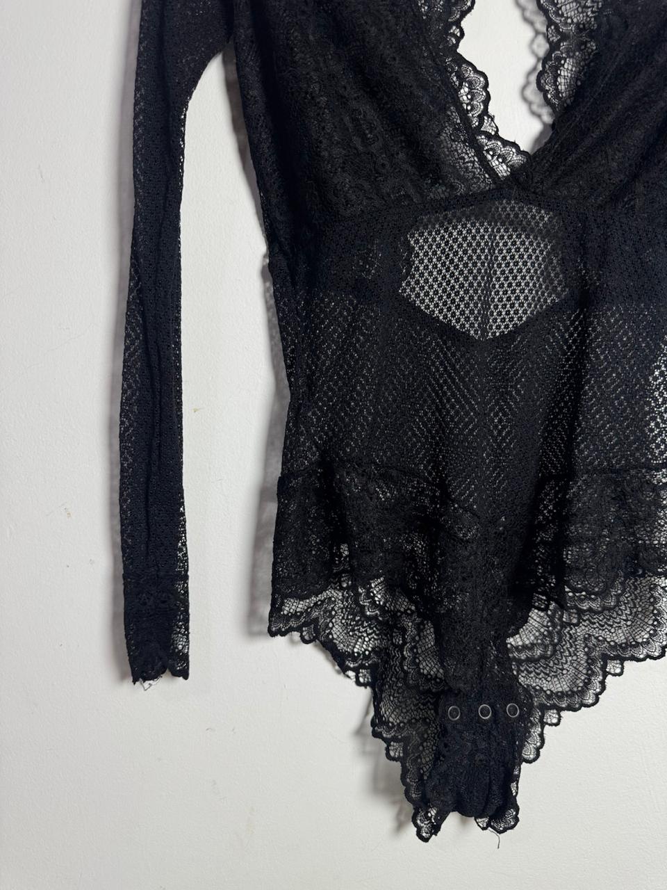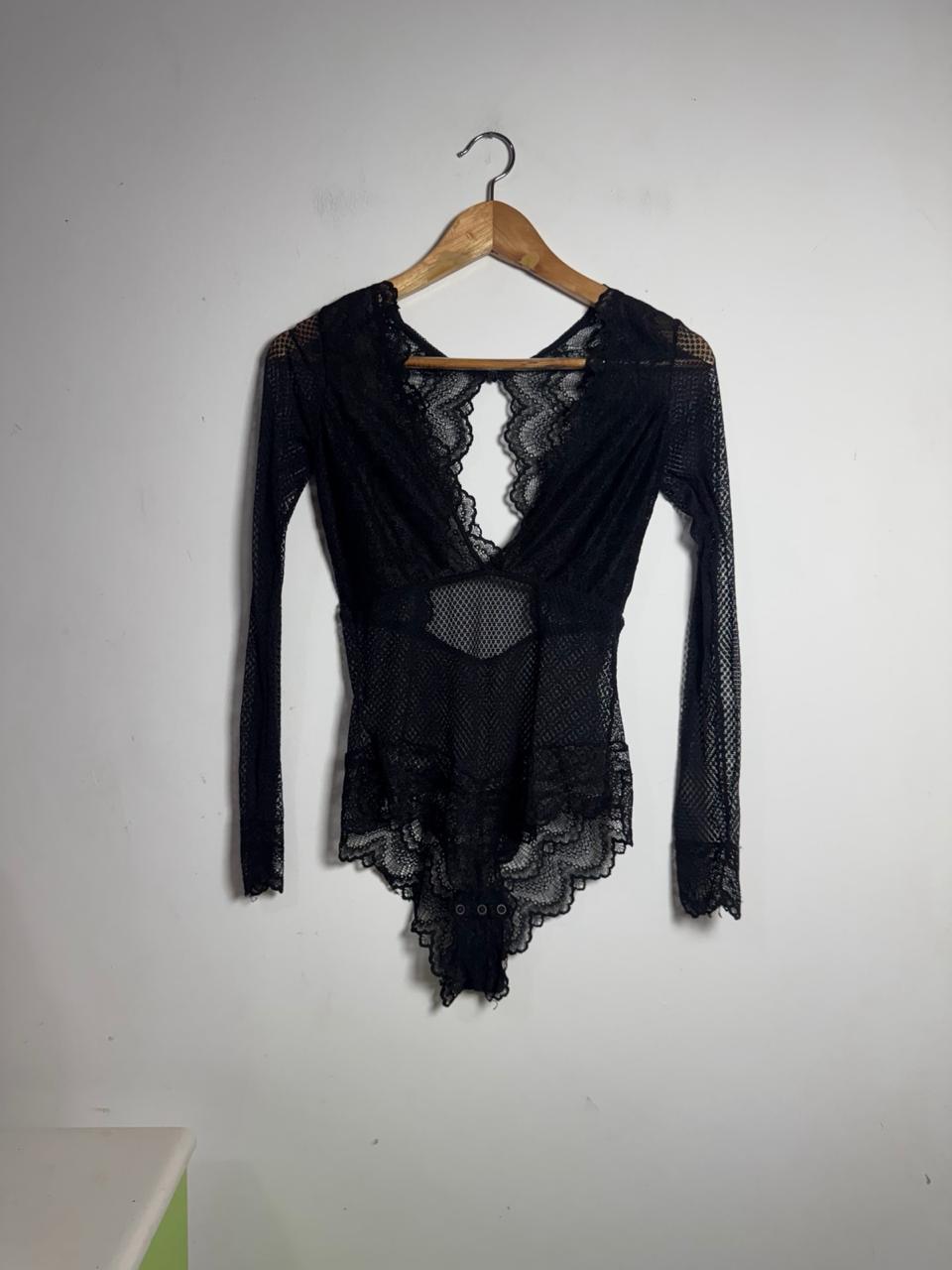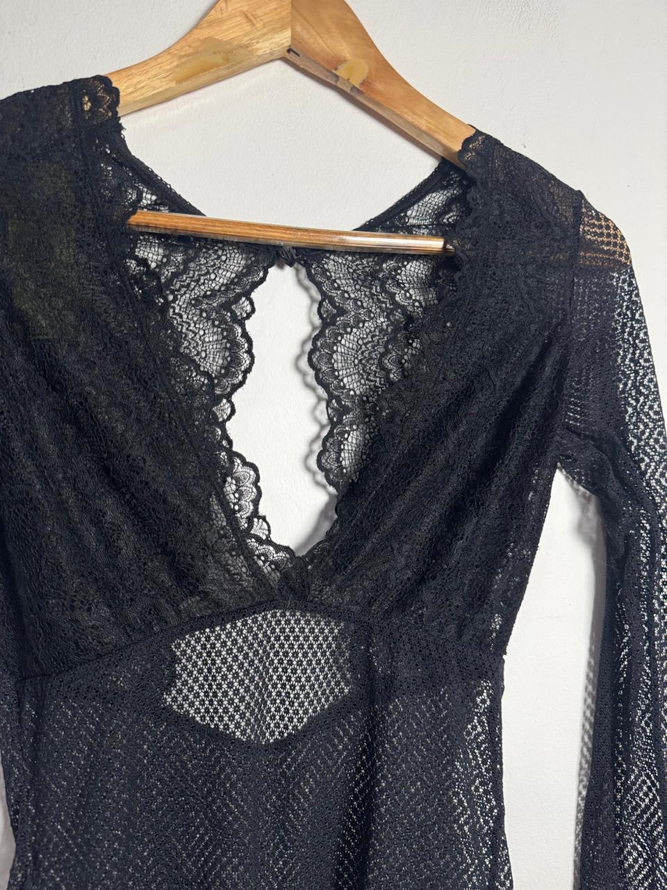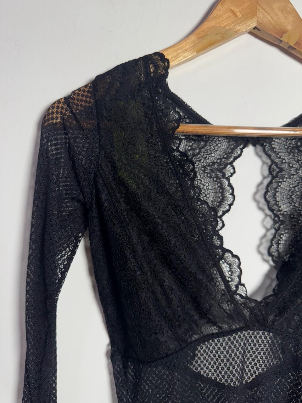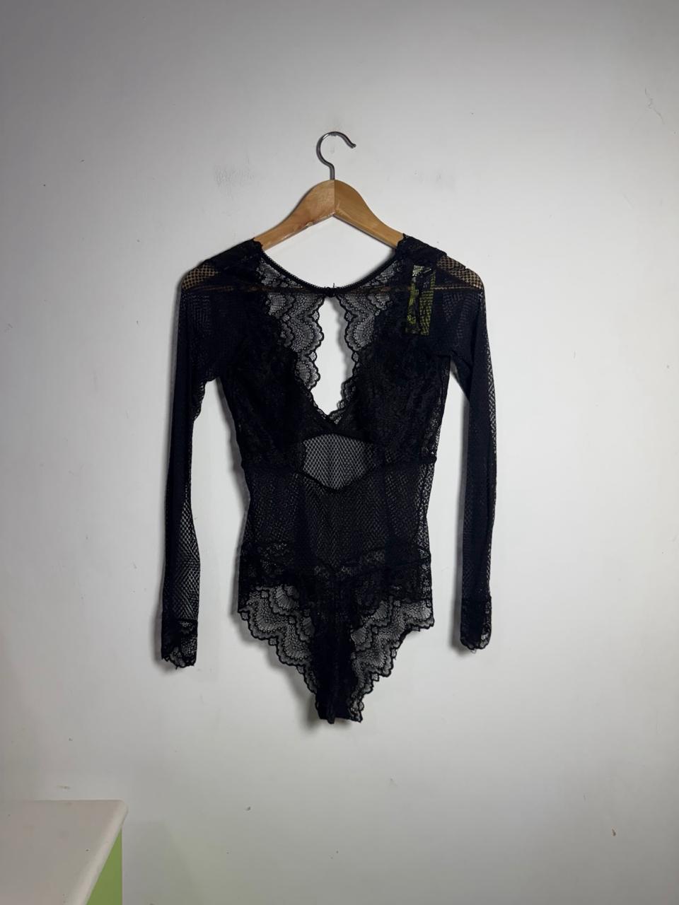 Body preto com transparência nas mangas compridas e detalhes rendados no busto. Peça de ajuste justo ao corpo, perfeita para compor visuais noturnos com elegância.