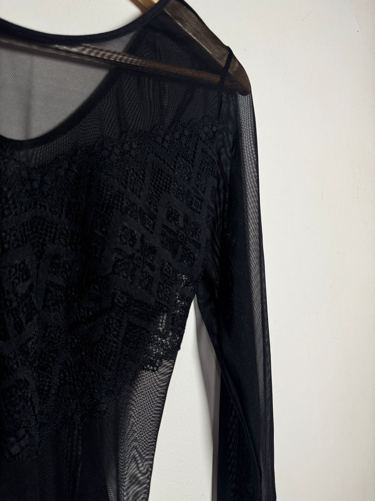 Body de manga comprida em tule preto, com detalhes em renda e transparência. Peça sexy e versátil para usar em diversas ocasiões.