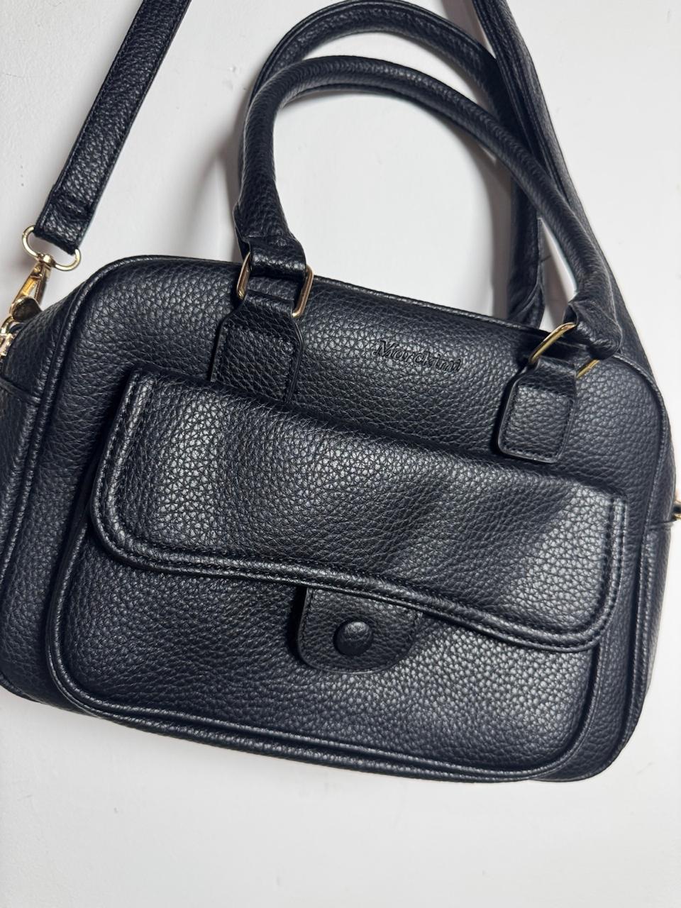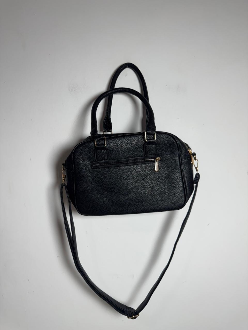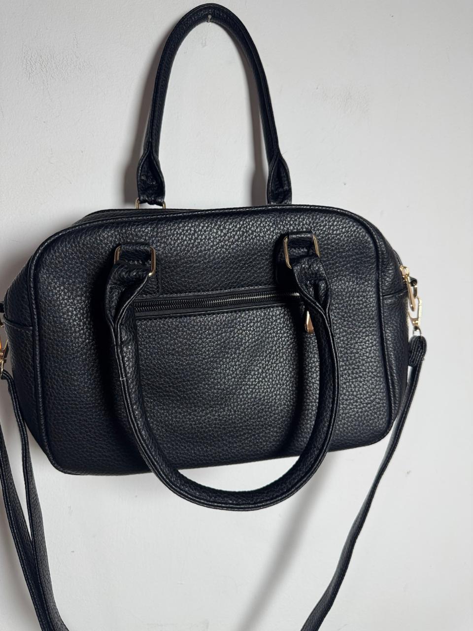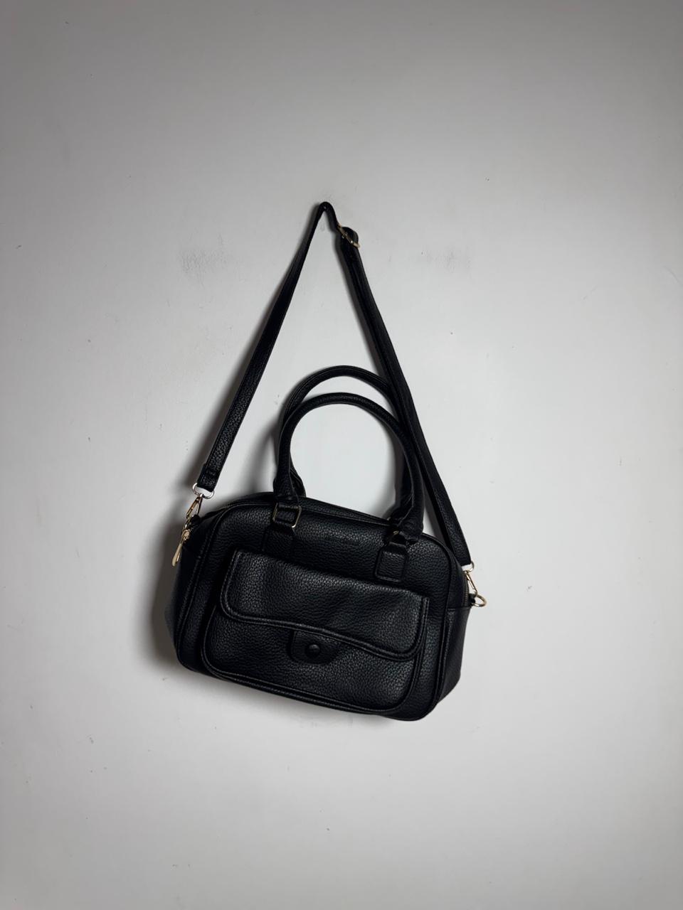 Bolsa baú preta com textura granulada, alças de mão estruturadas e alça transversal removível com ferragens douradas. O modelo possui bolso externo com botão magnético e bolso traseiro com zíper, sendo perfeito para looks de trabalho ou passeios.