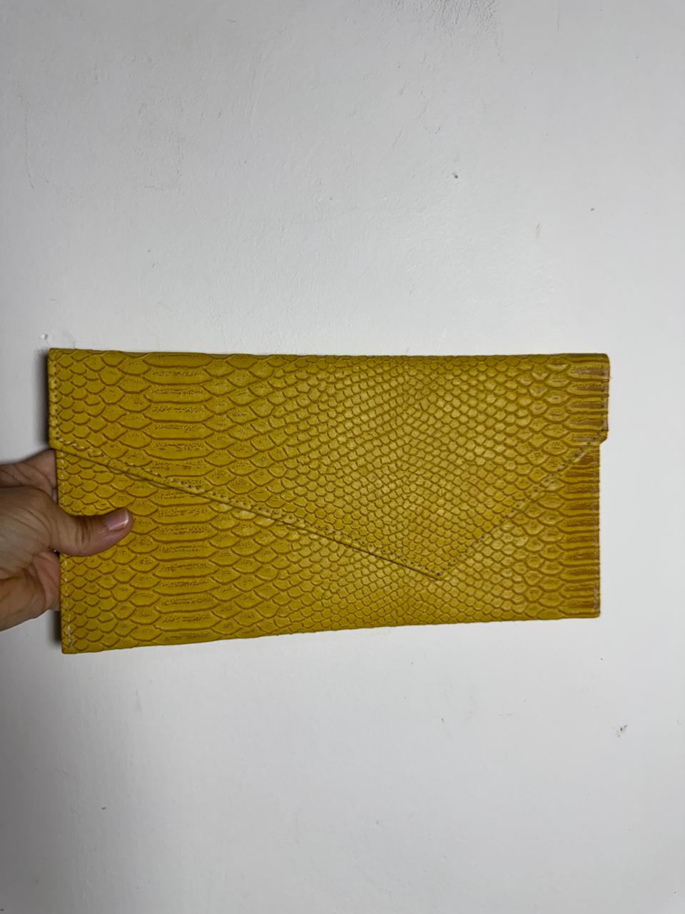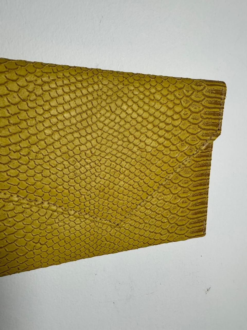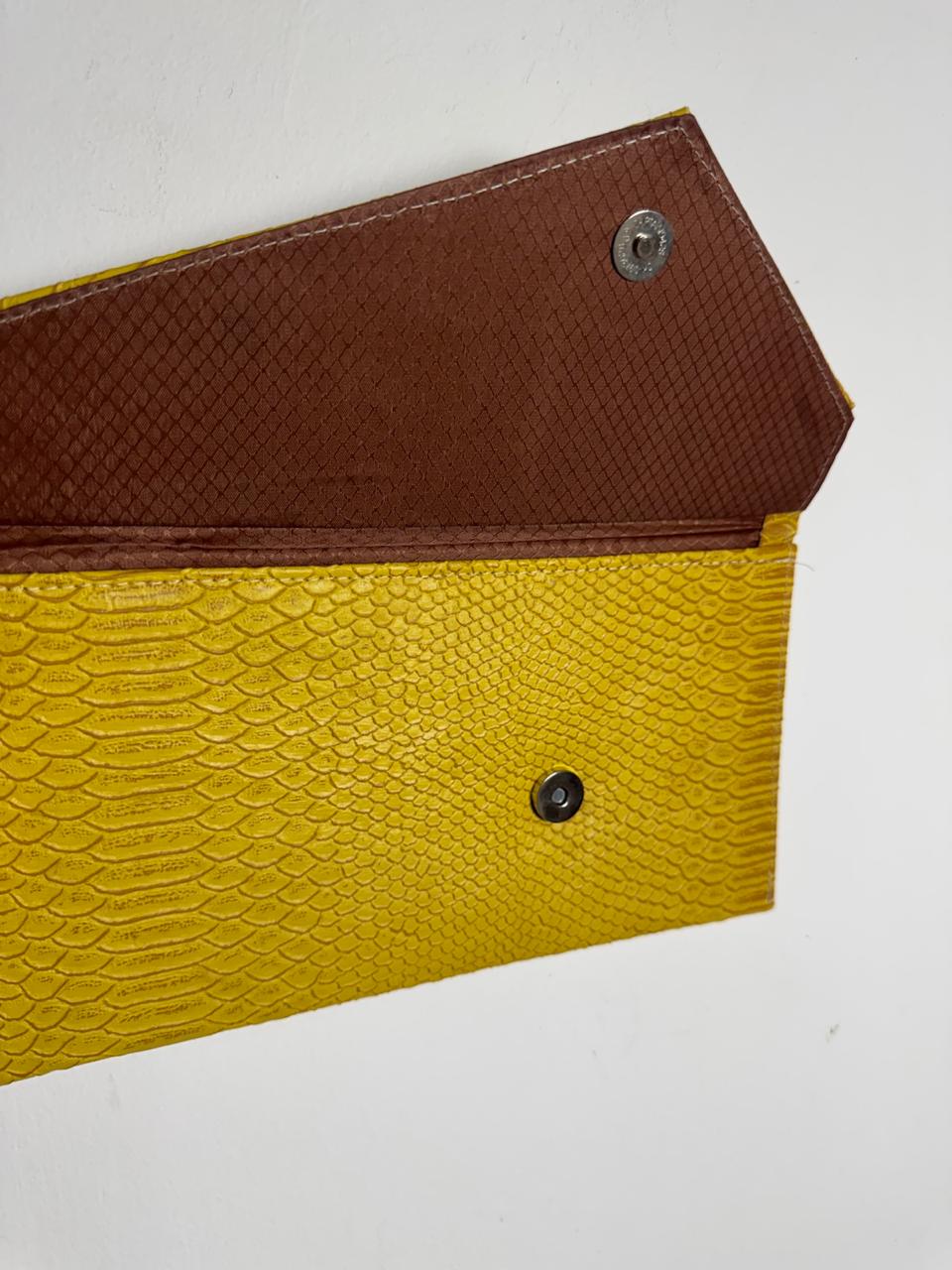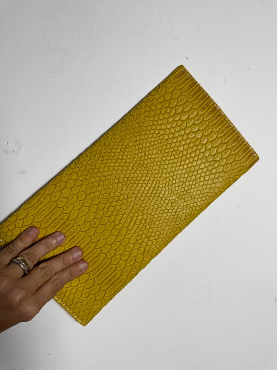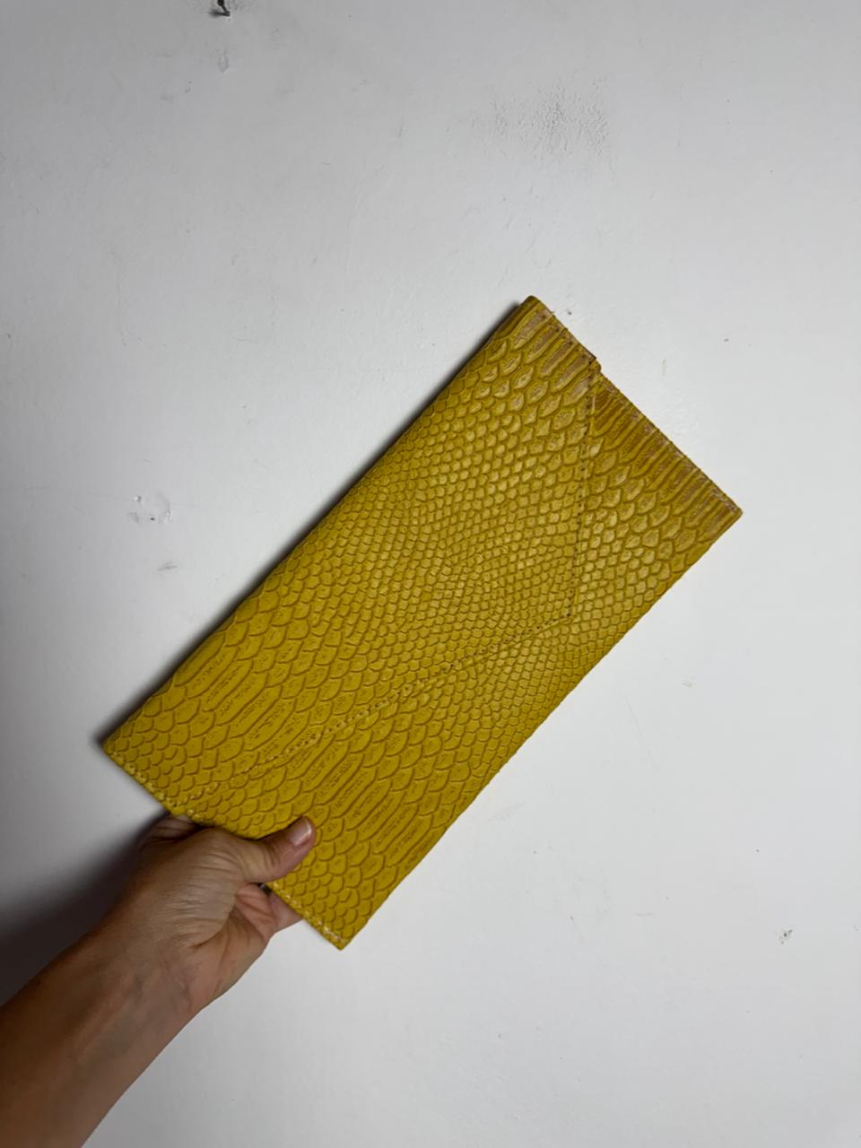 Bolsa formato envelope amarela vibrante com textura de cobra em relevo e fecho magnético interno. Modelo alongado de mão, perfeito para levar o essencial e dar um toque de cor em produções noturnas ou eventos.