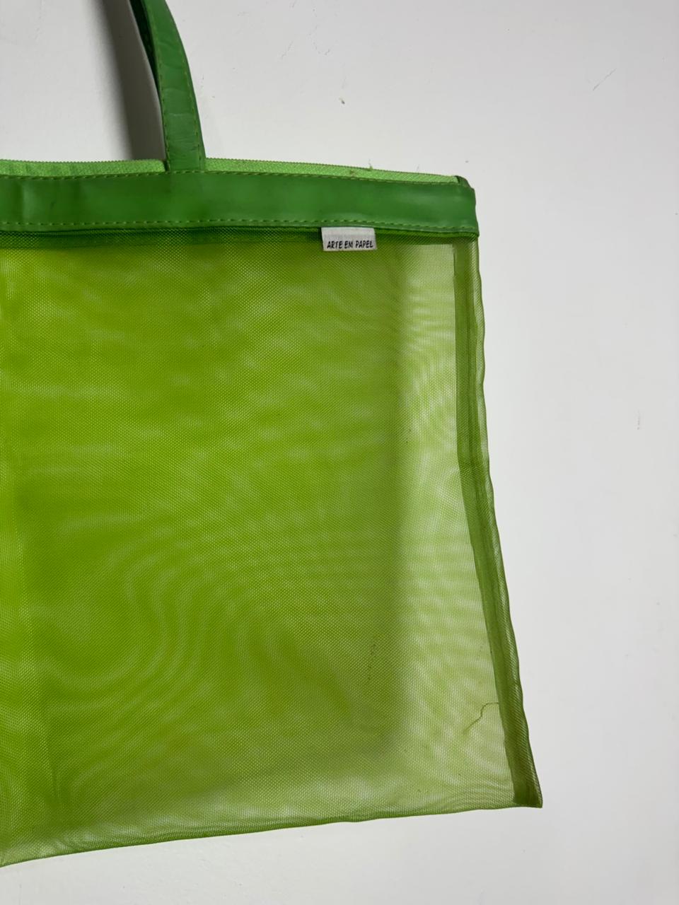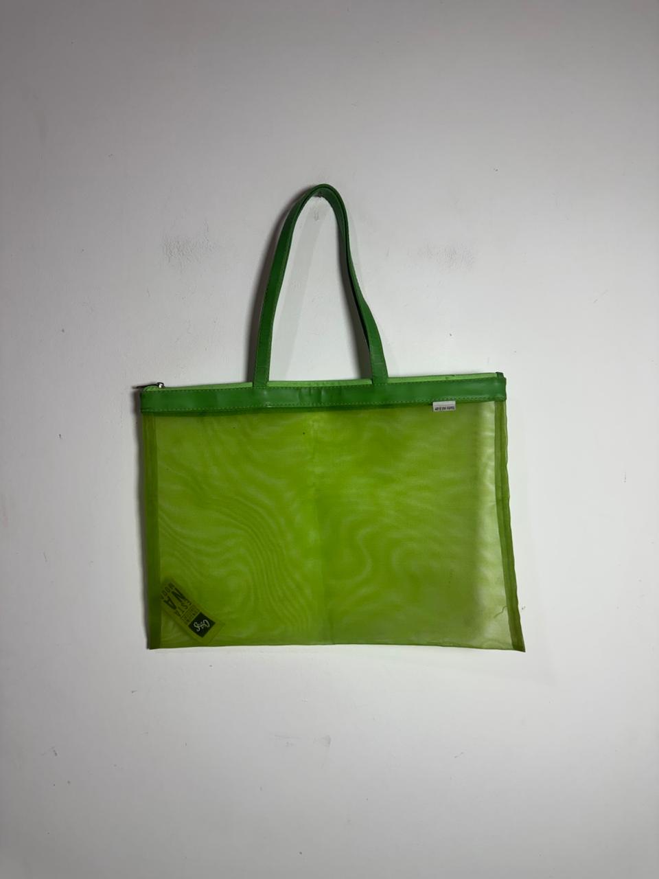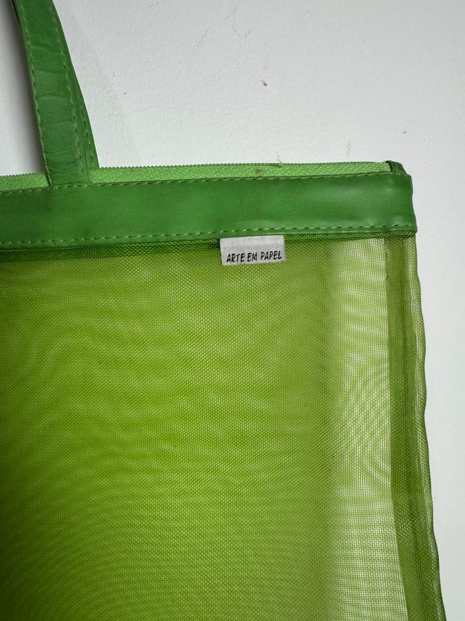 Bolsa retangular em tela transparente verde vibrante com fechamento superior por zíper e alças fixas. Acessório leve e moderno, excelente para dias de praia ou passeios descontraídos.