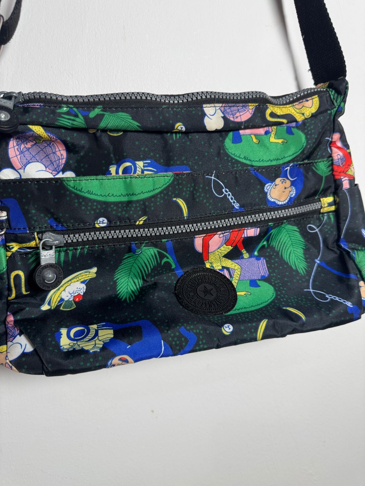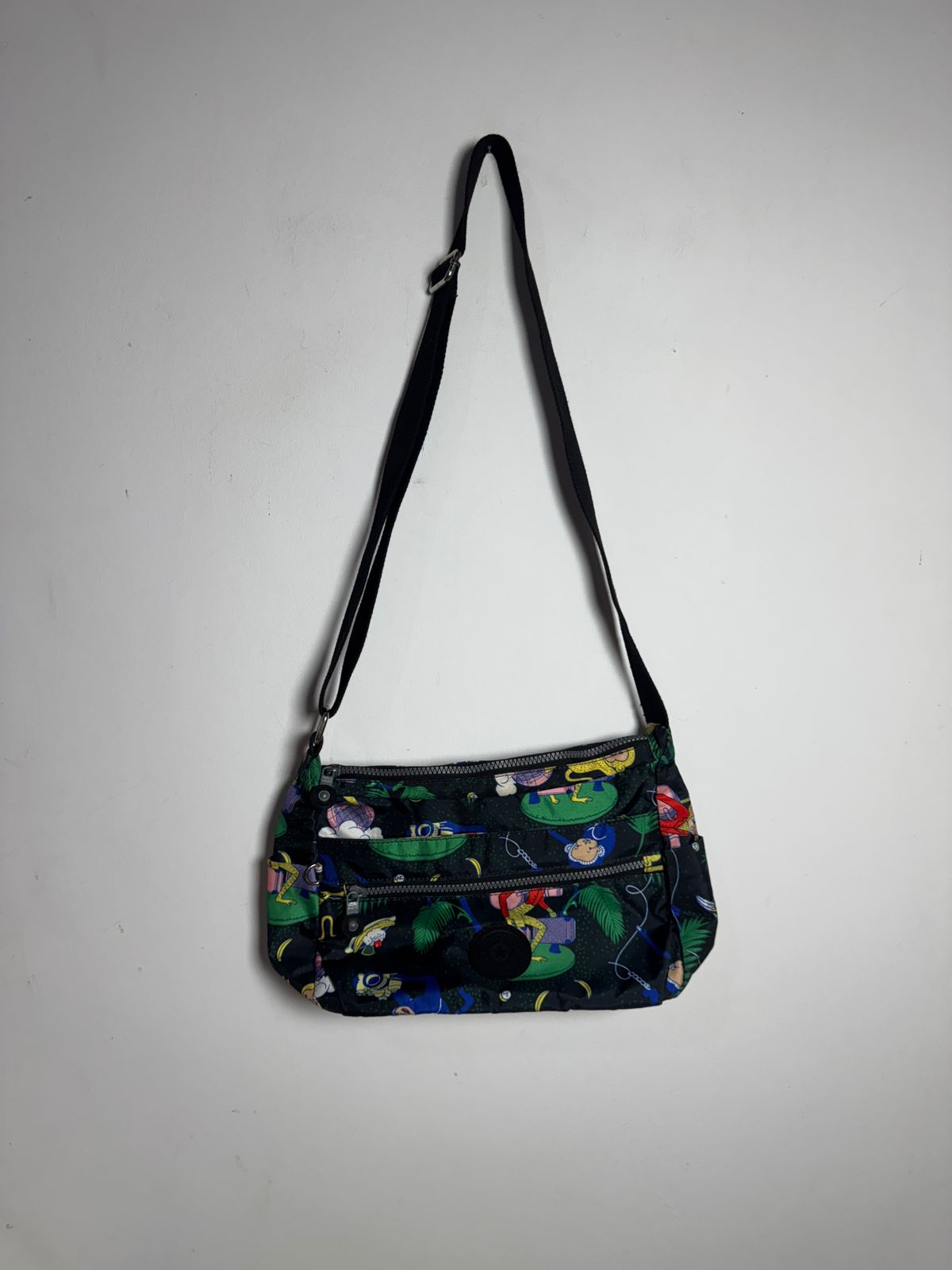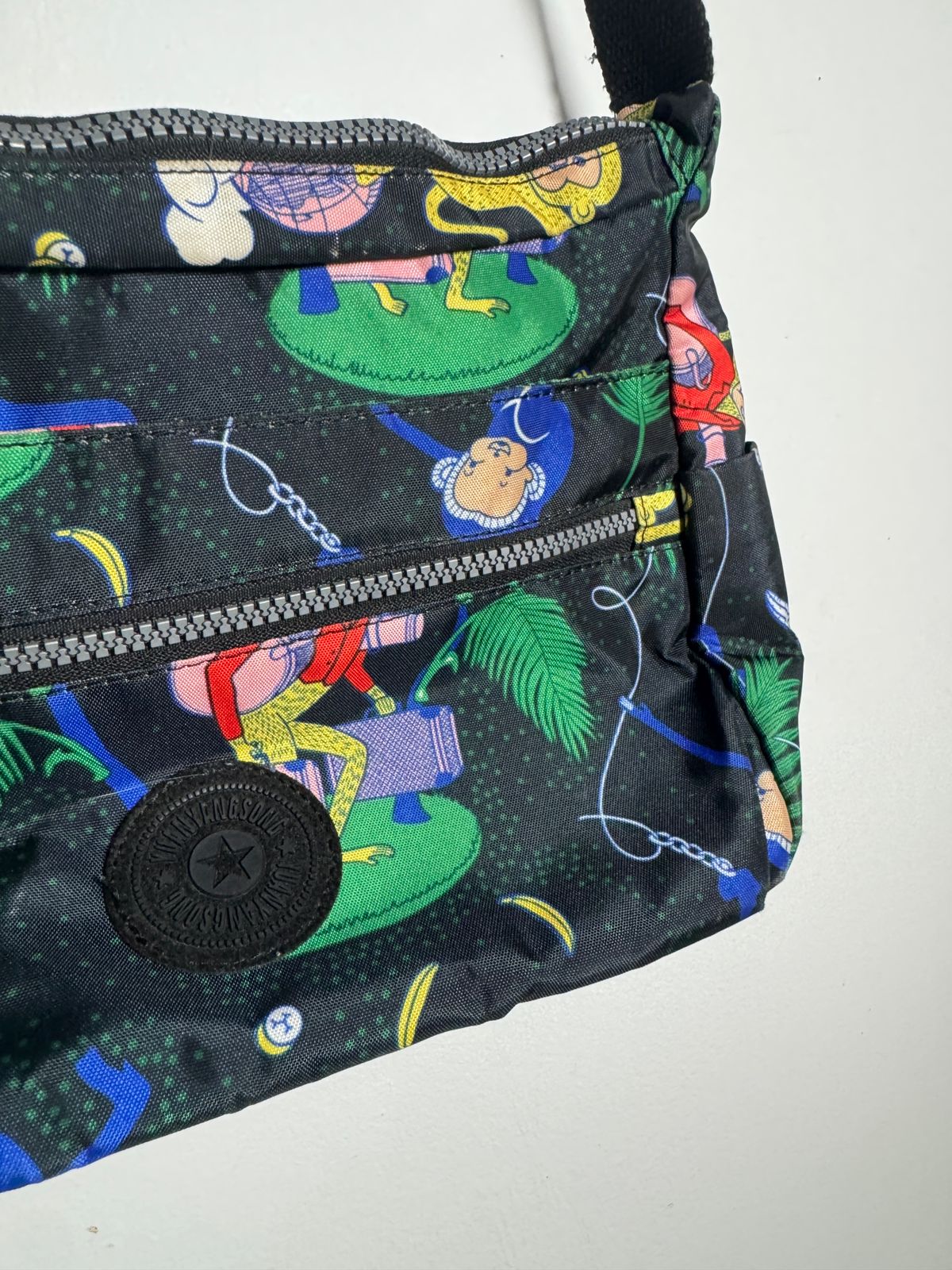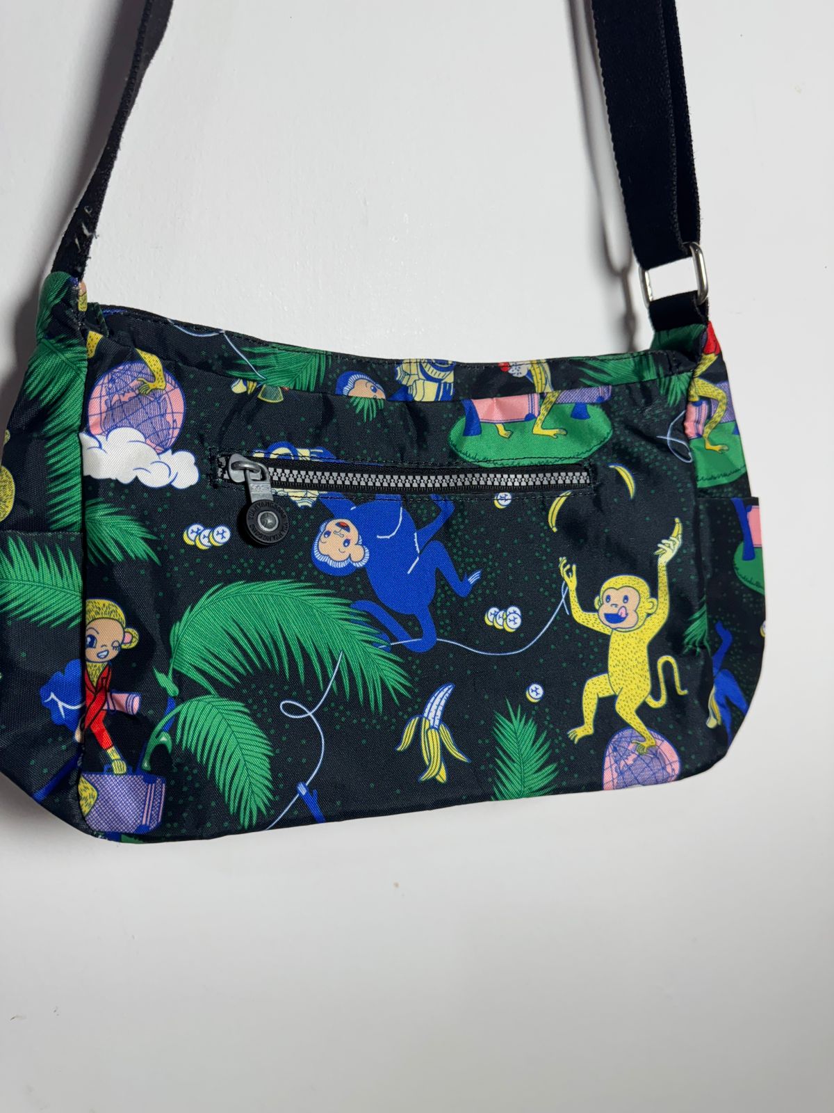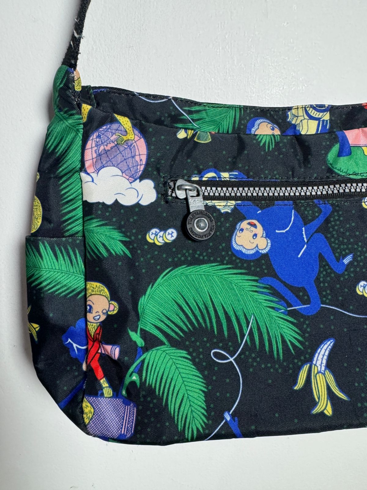 Bolsa de ombro preta com estampa divertida de macaquinhos e bananas! Perfeita para quem busca um acessório descontraído e funcional, com vários compartimentos para organizar seus itens essenciais.