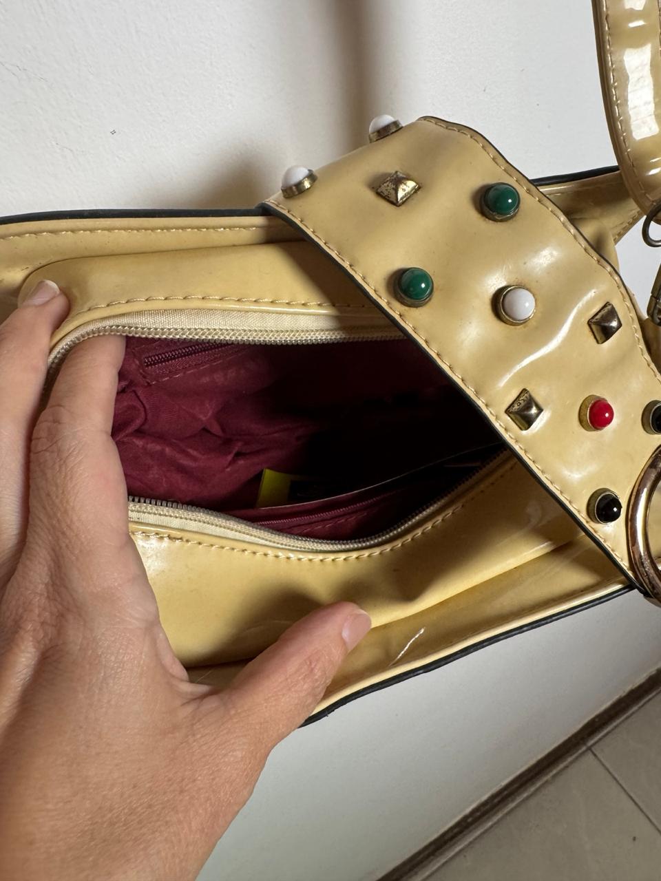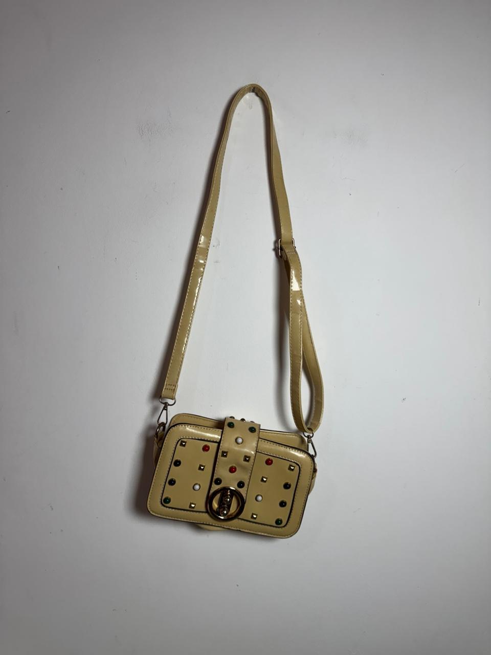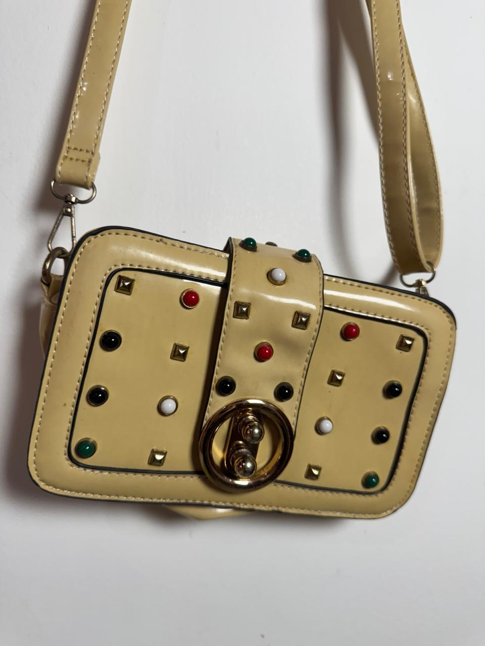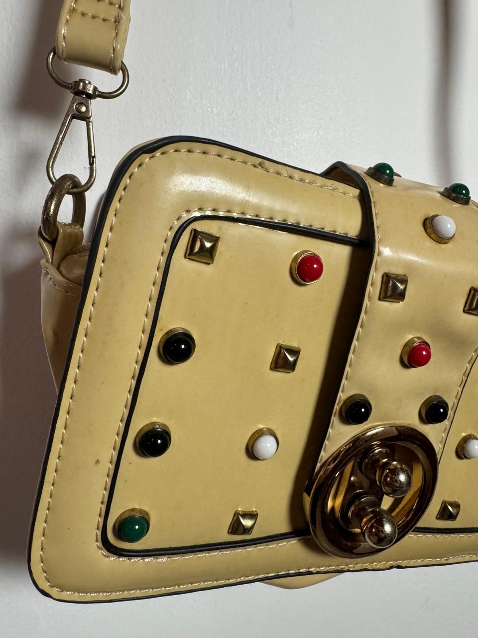 Peça em material estonado com textura geométrica, enriquecida por um mix de tachas metálicas e pedrarias coloridas frontais. O design folk é completado por uma alça larga em jacquard vibrante e bolso traseiro em tom caramelo, perfeita para um look boho-chic autêntico.