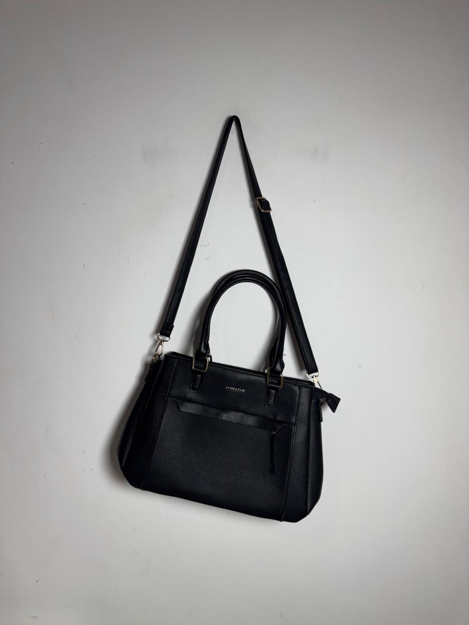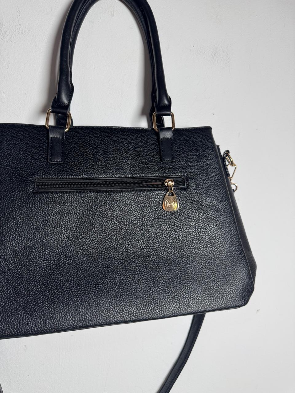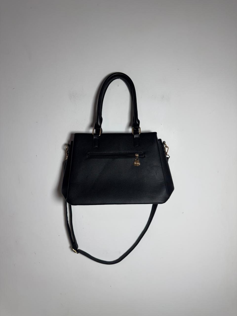 Bolsa de cor preta com acabamento texturizado, alças de mão arredondadas e alça longa ajustável. O modelo apresenta design elegante com detalhes em dourado, sendo ideal para compor produções profissionais e sociais.