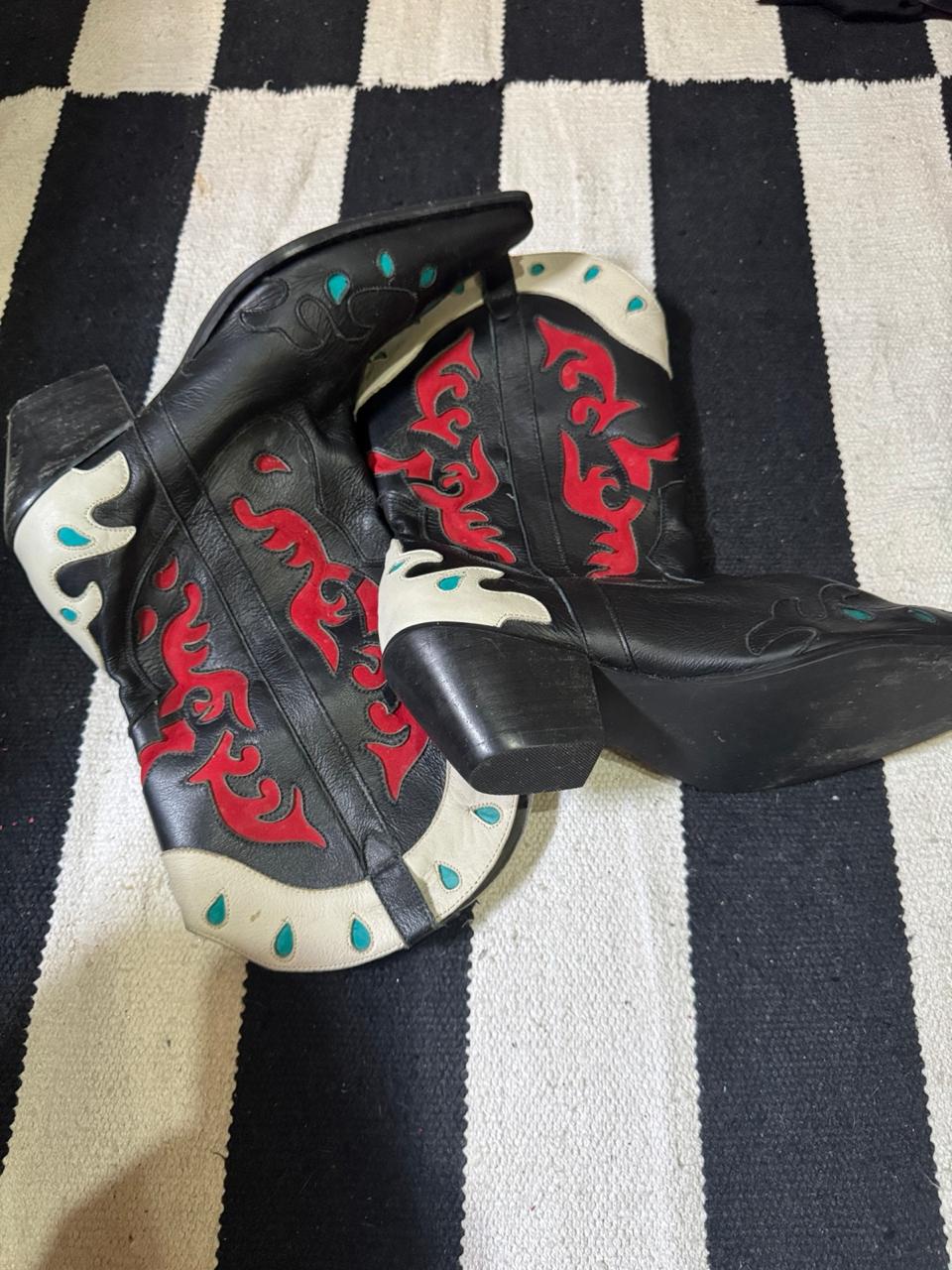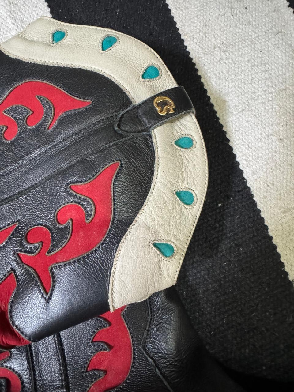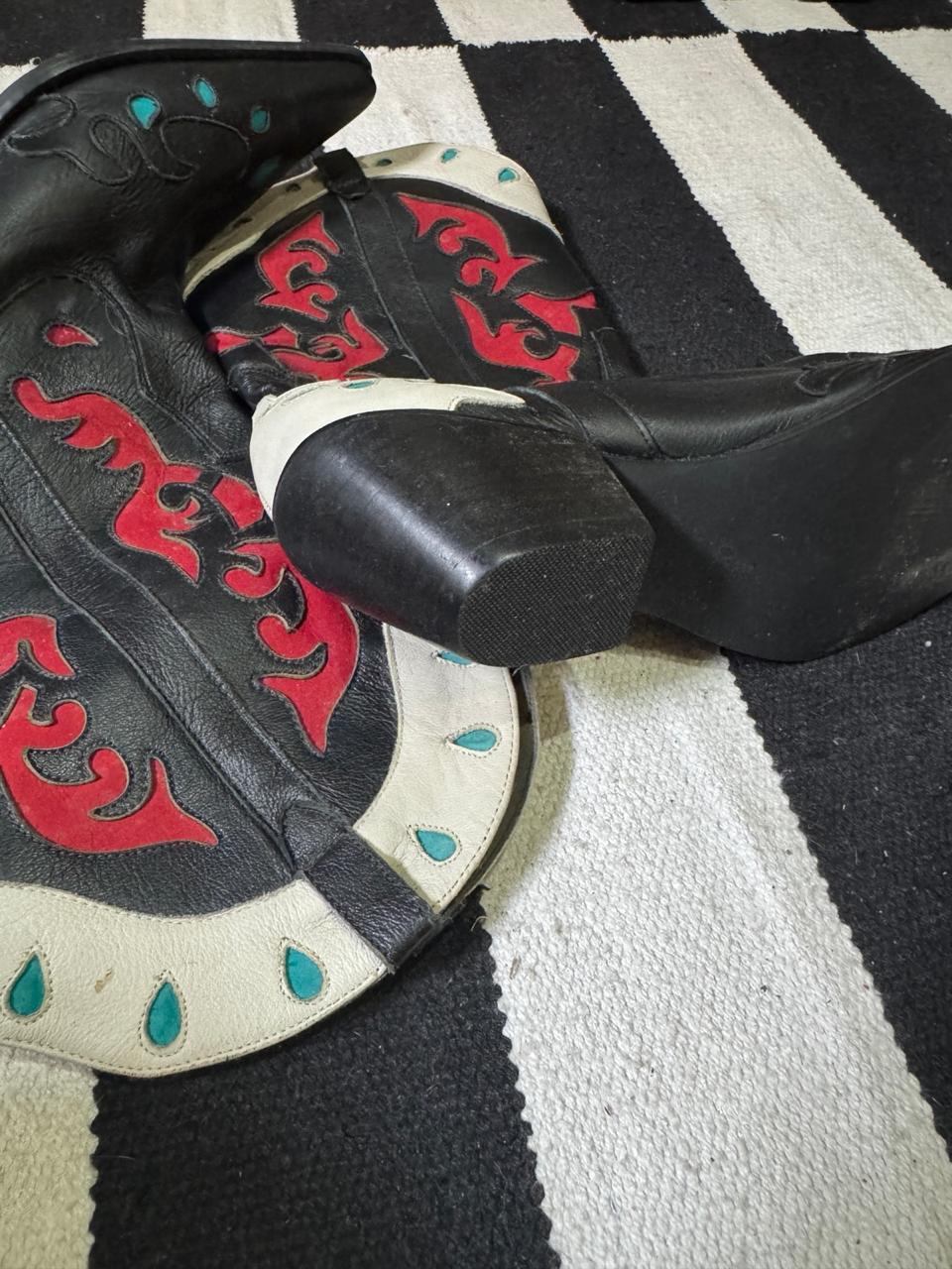 Personalidade máxima! Bota country de couro preto e salto bloco, com recortes e bordados em vermelho, branco e turquesa. A peça statement que vai te fazer brilhar em qualquer festival.