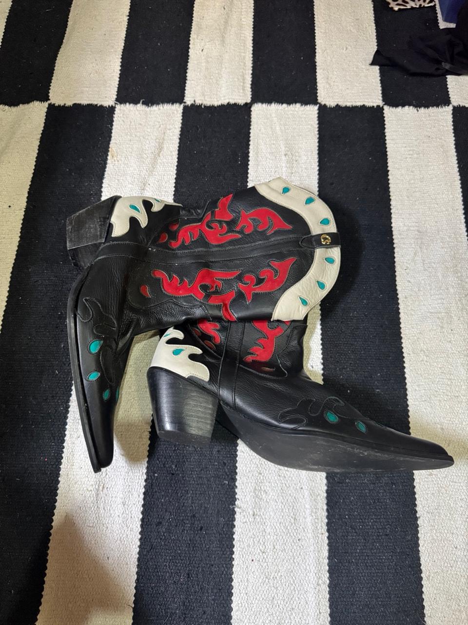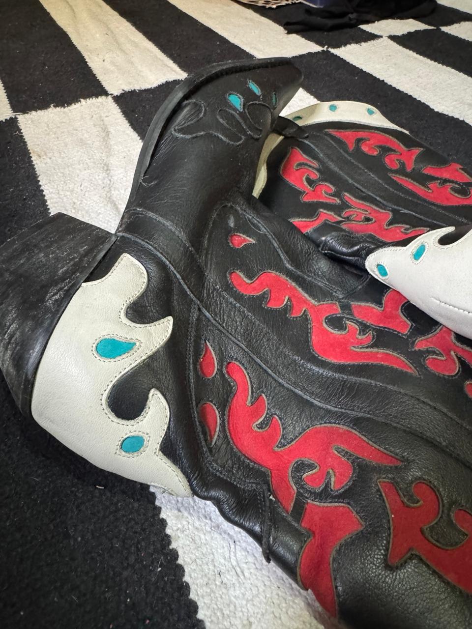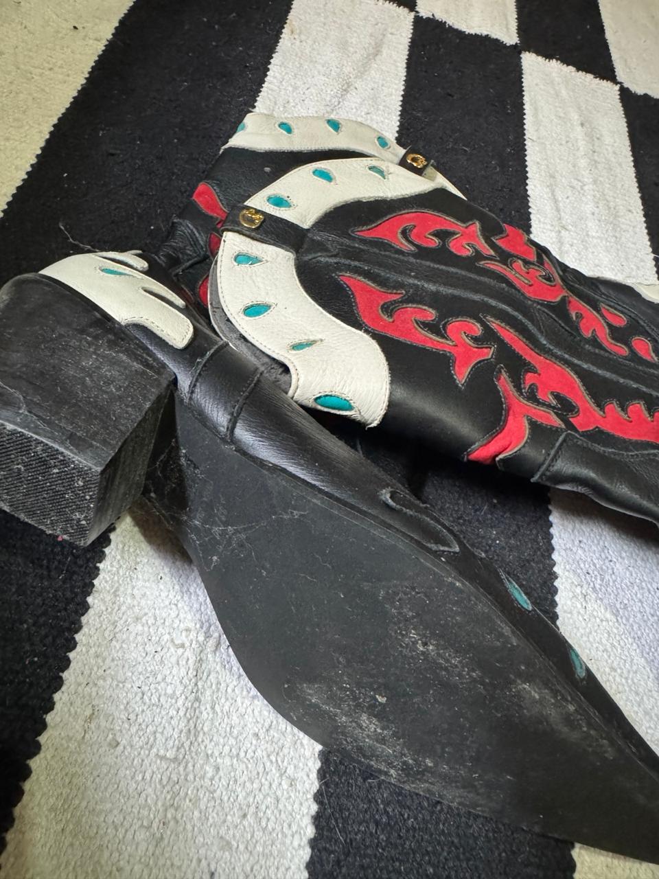 Personalidade máxima! Bota country de couro preto e salto bloco, com recortes e bordados em vermelho, branco e turquesa. A peça statement que vai te fazer brilhar em qualquer festival.