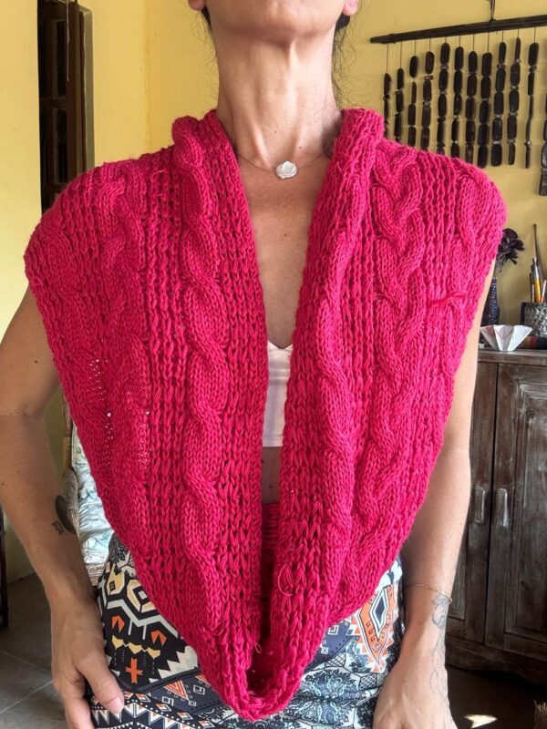 Pashmina/echarpe em tricô com ponto trabalhado (tranças), na cor vermelha (fúcsia/neon). A peça tubular e ampla pode ser usada como cachecol, colete ou gola, adicionando textura e um toque de cor ousado ao look.