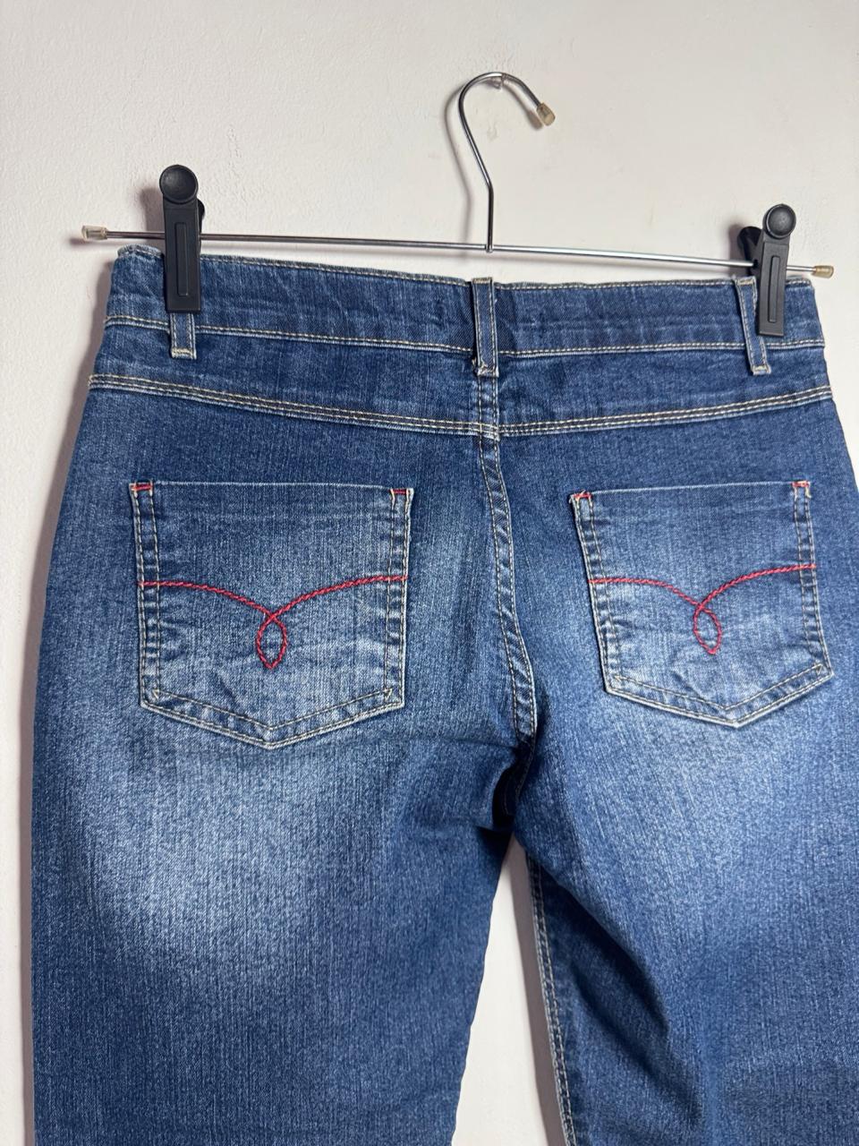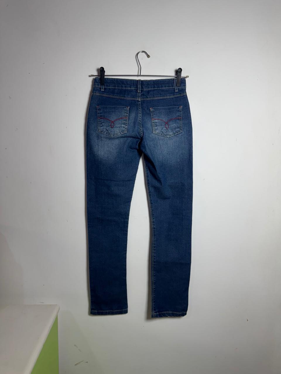 Calça jeans  em lavagem azul escura com leves desgastes, valorizada pelo detalhe do pesponto vermelho no bolso traseiro. Uma peça clássica e confortável com um toque de cor que adiciona personalidade e estilo ao básico.