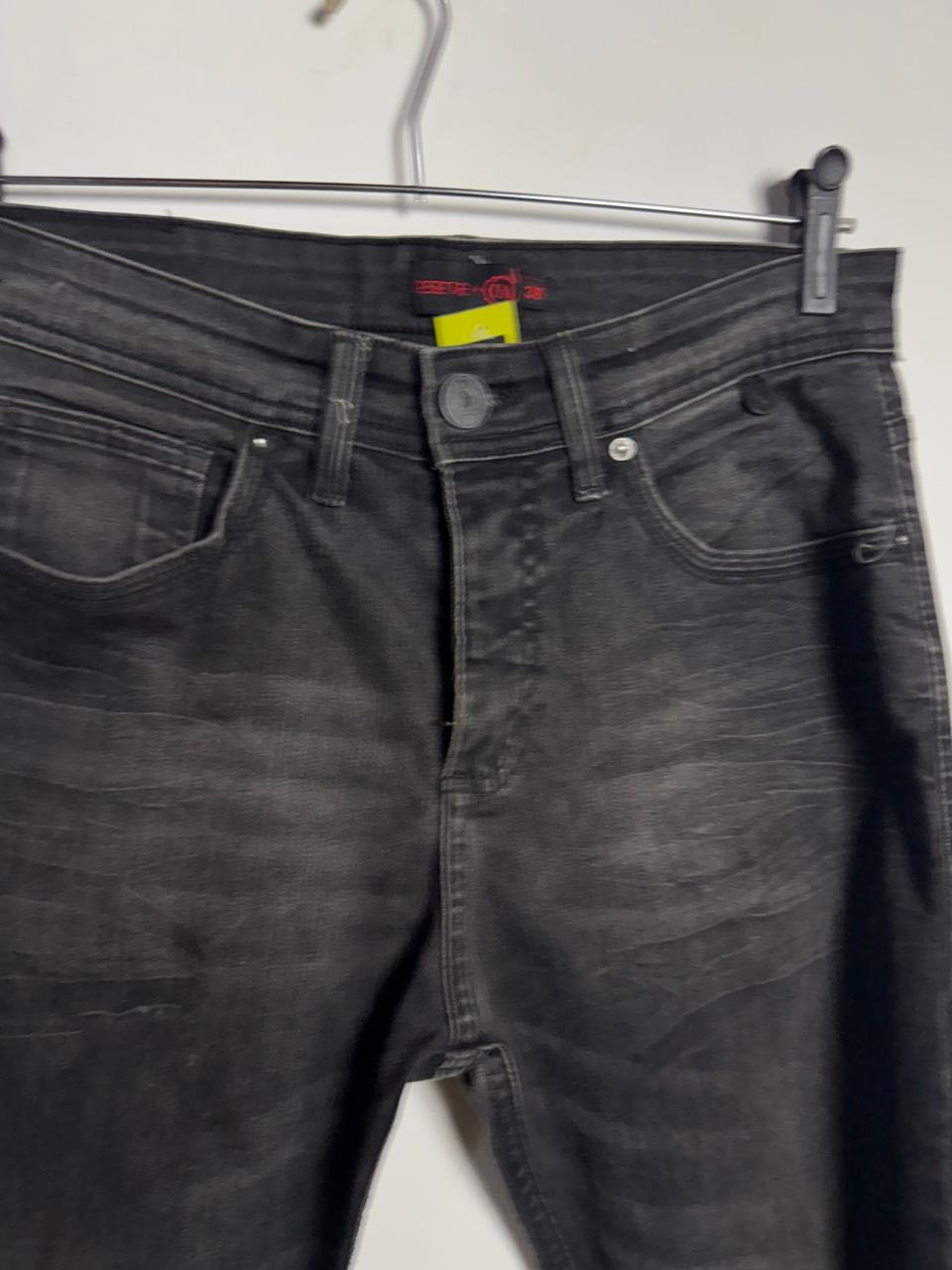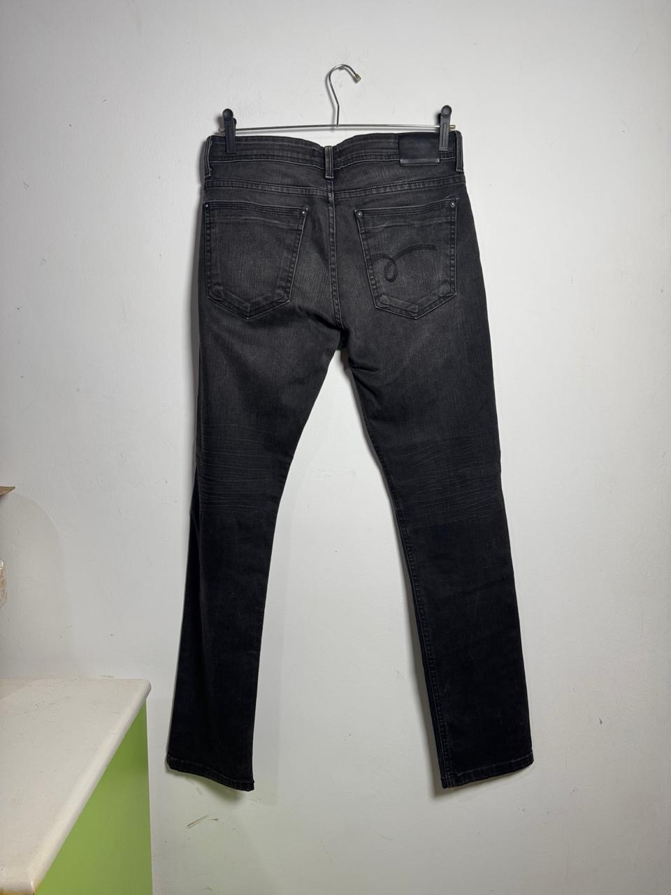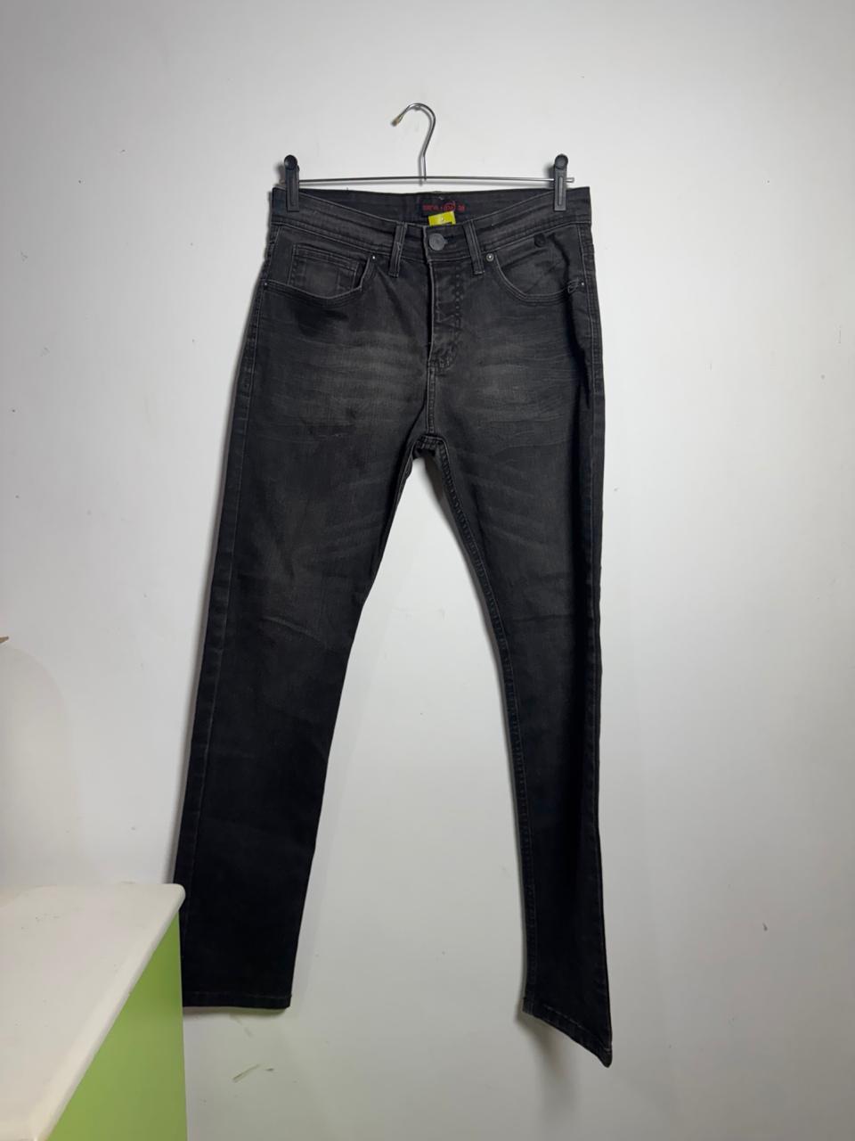 Jeans slim fit em black denim com lavagem estonada e detalhes pespontados, oferecendo um visual moderno e versátil para qualquer ocasião.