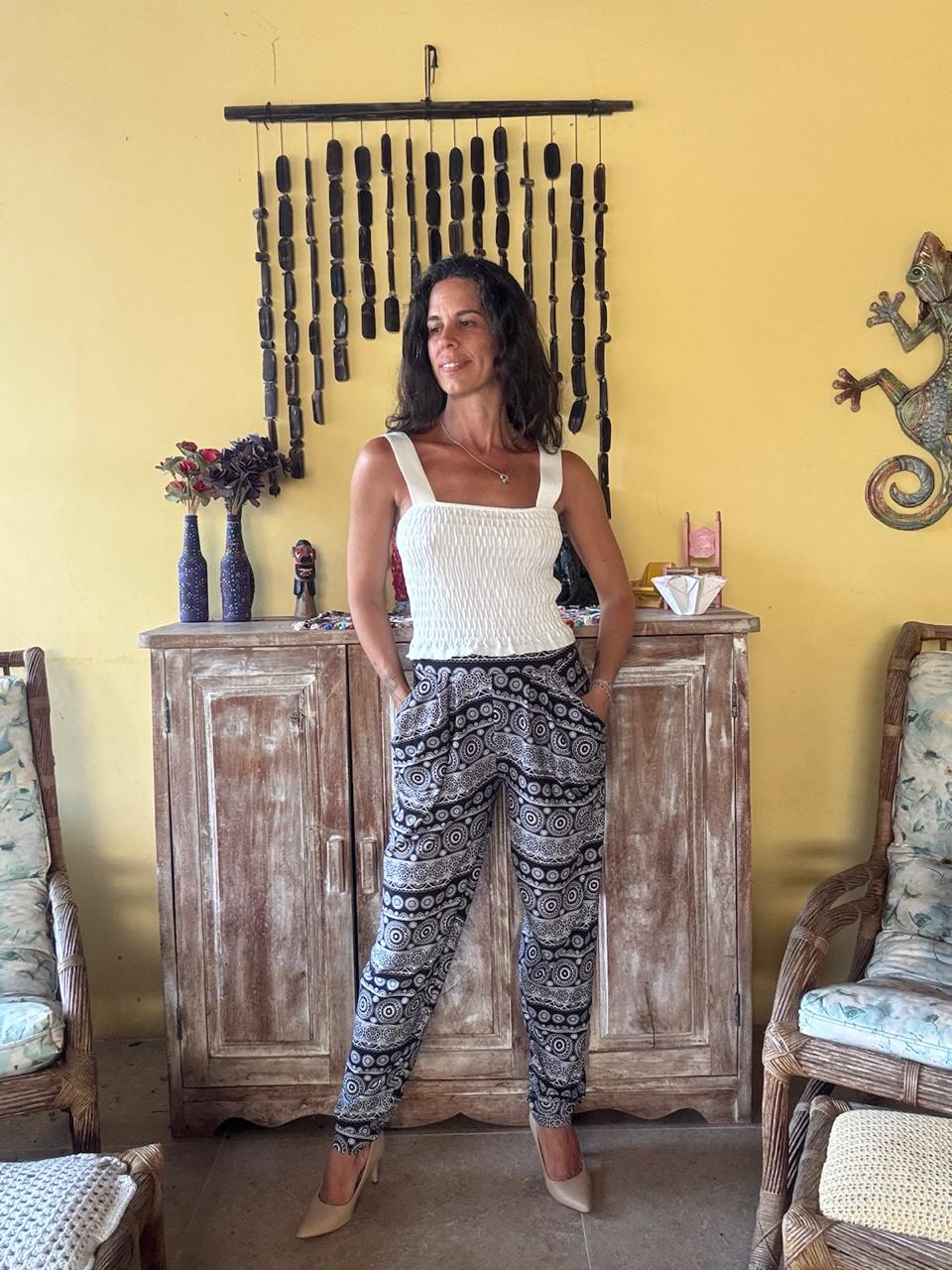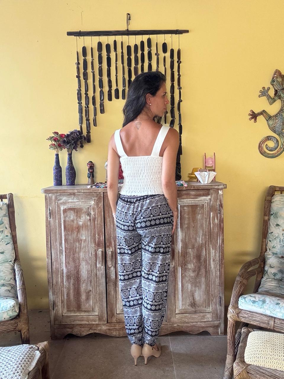 Calça de modelagem solta com estampa geométrica em tons de preto e branco e bolsos laterais. A peça apresenta punhos ajustados no tornozelo e cintura alta, sendo perfeita para uma produção despojada e moderna.