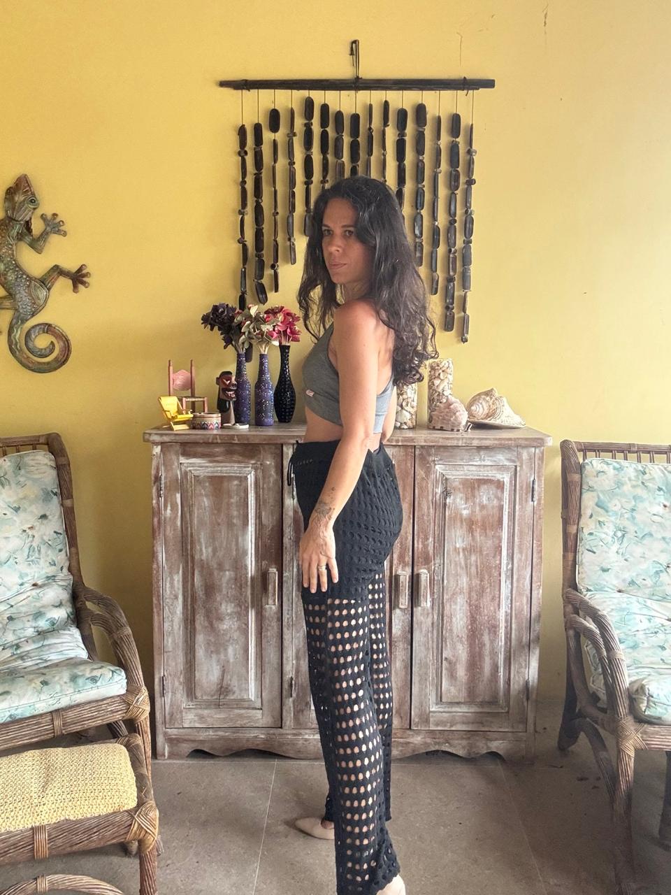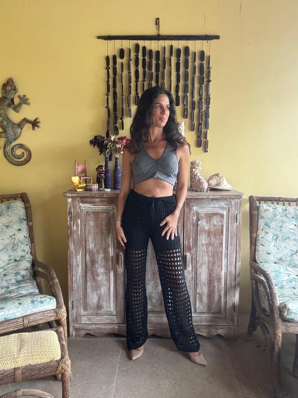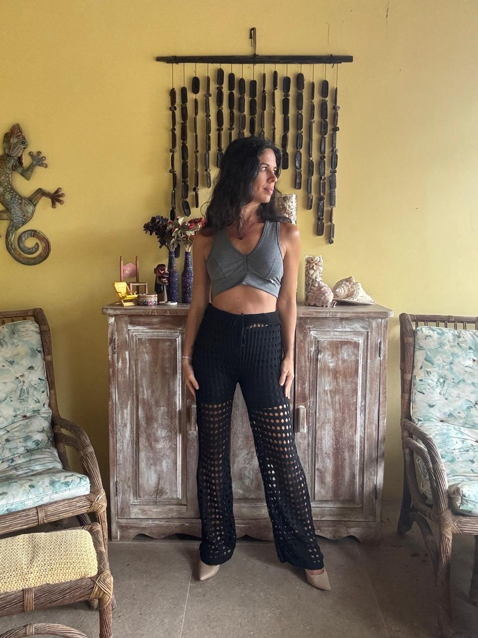 Calça na cor preta com trama aberta em furos e modelagem solta de pernas largas. Peça ideal para composições casuais com transparência ou para ser usada como saída de praia.