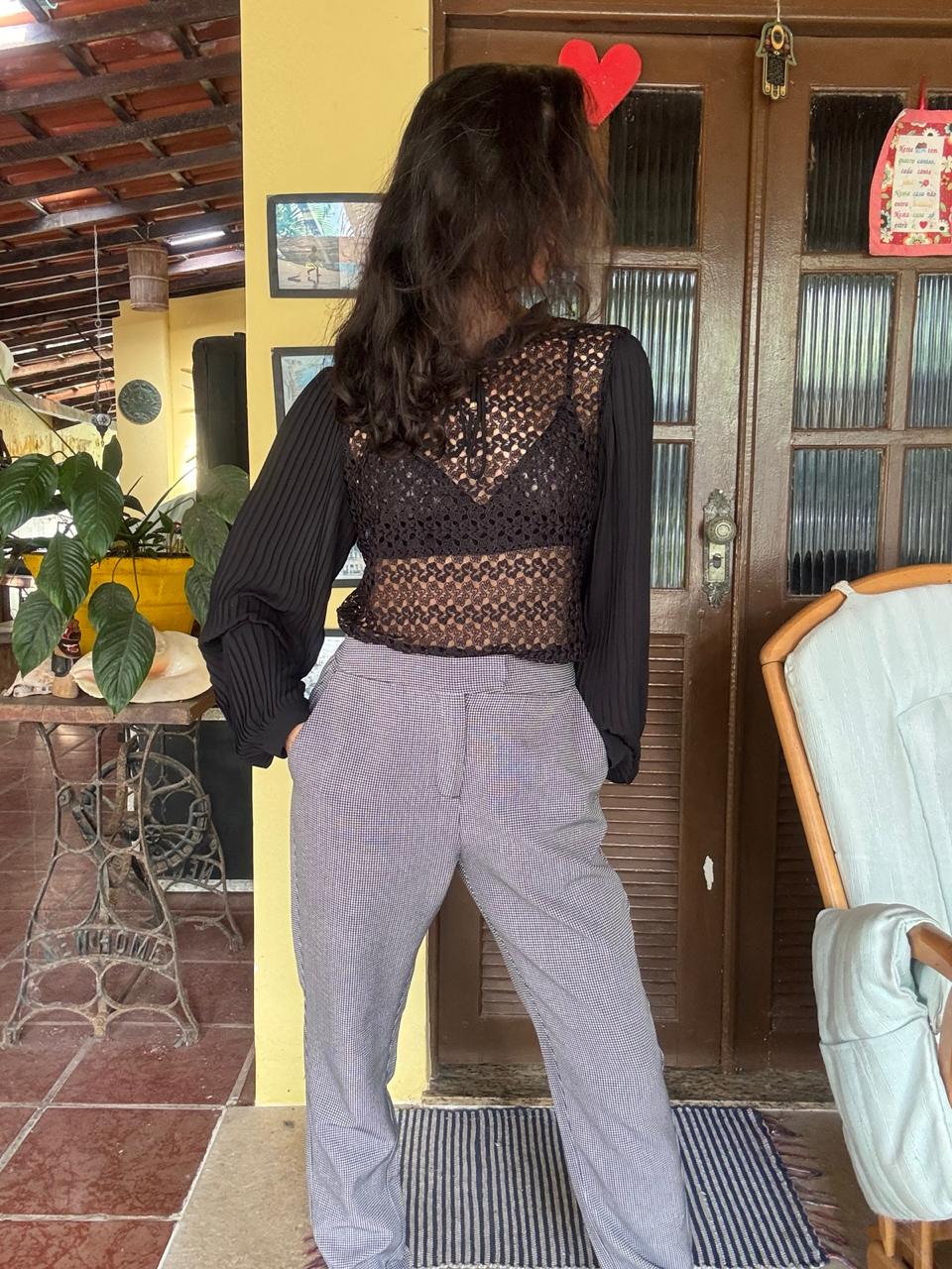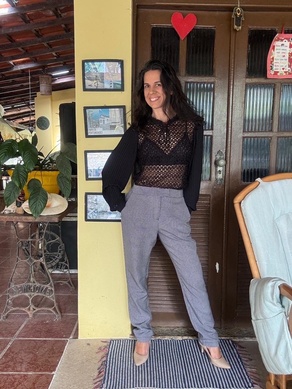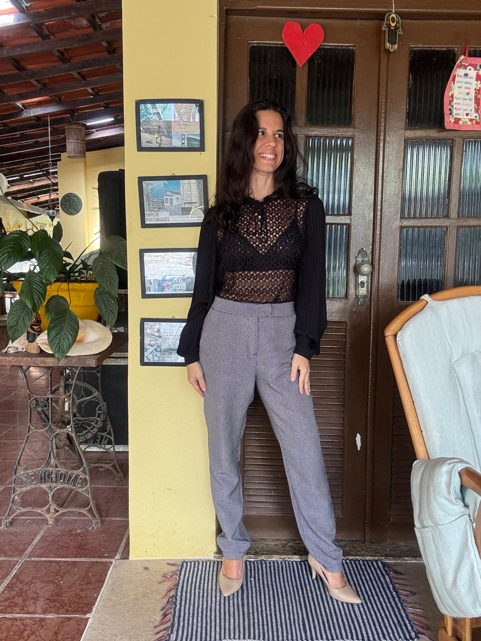 Calça social de corte reto e cintura alta, em um elegante tom de cinza mescla com textura discreta (micro xadrez). Uma peça clássica e atemporal que oferece caimento impecável e é perfeita para compor looks de trabalho e casuais com sofisticação.