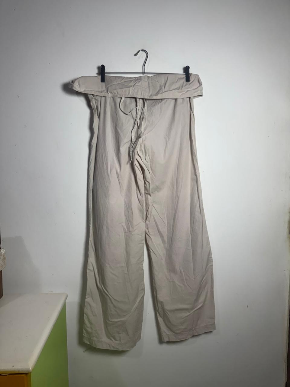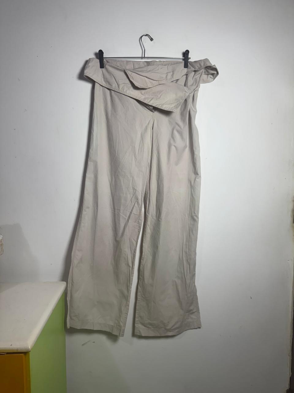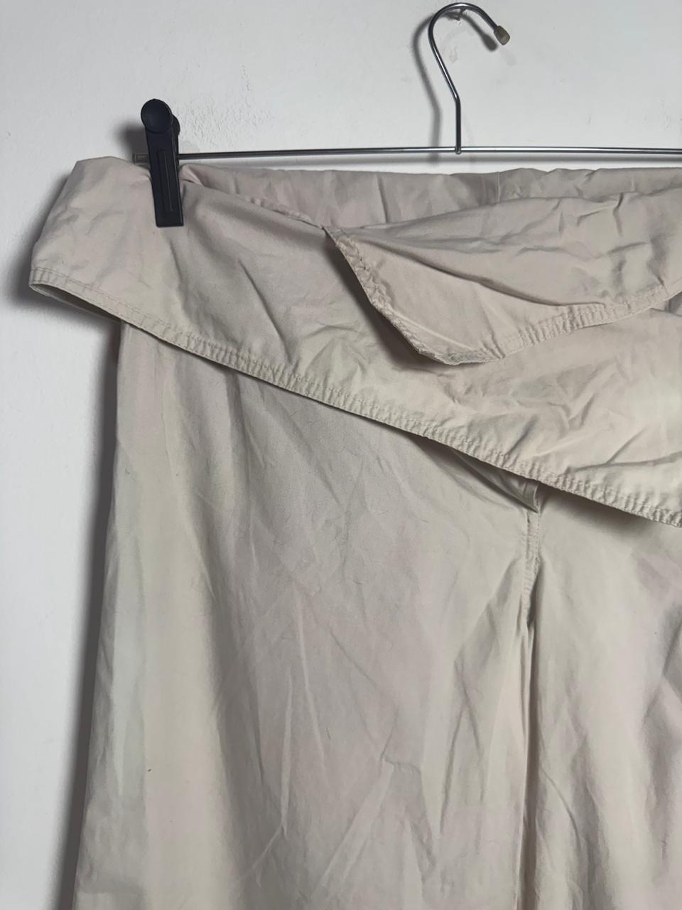 Calça de corte amplo e pernas largas em tom neutro com detalhe de pala dobrada na cintura. O caimento solto proporciona elegância e sofisticação para ambientes de trabalho ou passeios.