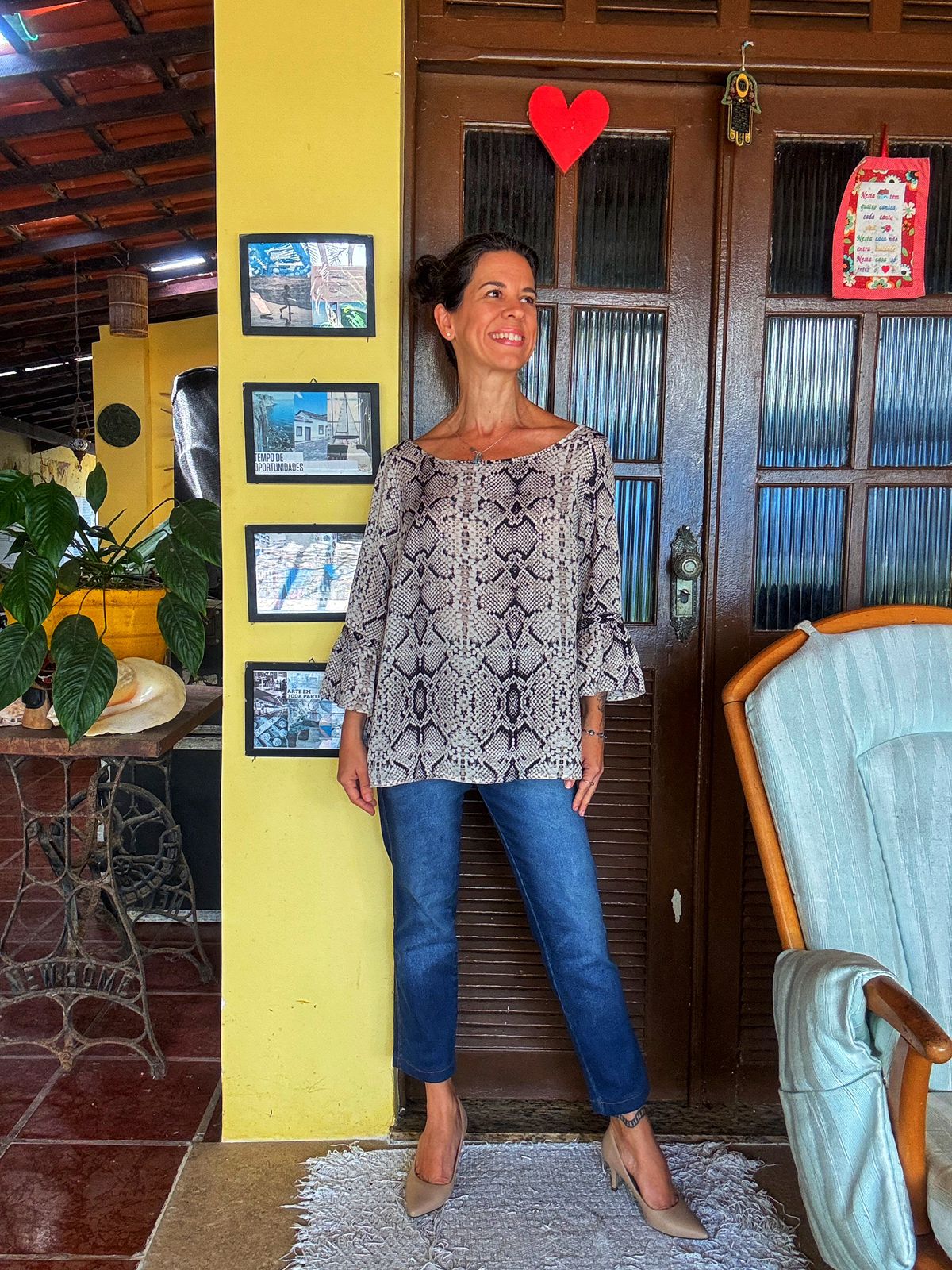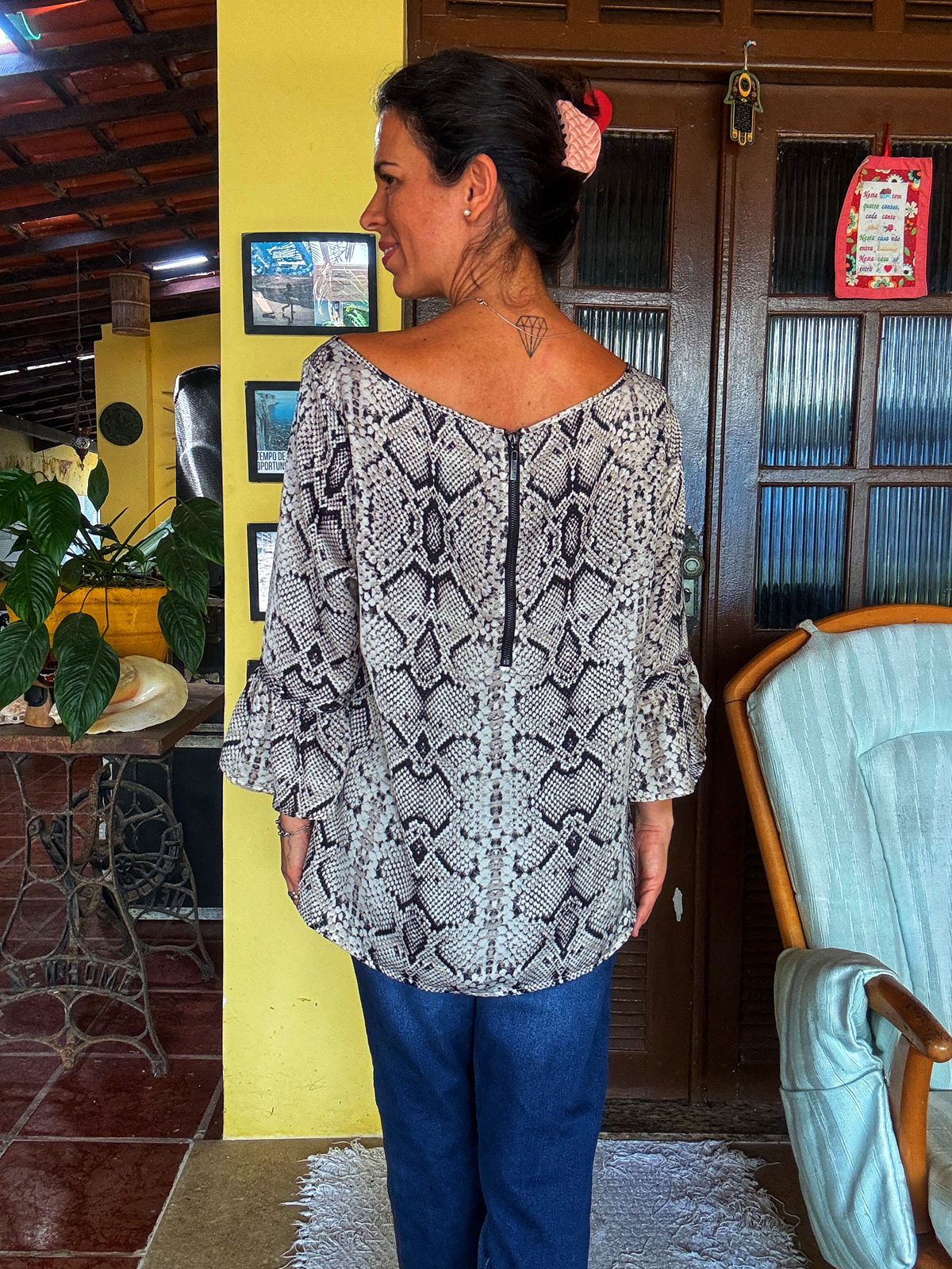 Blusa fluida com estampa de cobra em tons de cinza e preto. O destaque fica para o decote canoa e as mangas 3/4 com detalhe de babados.