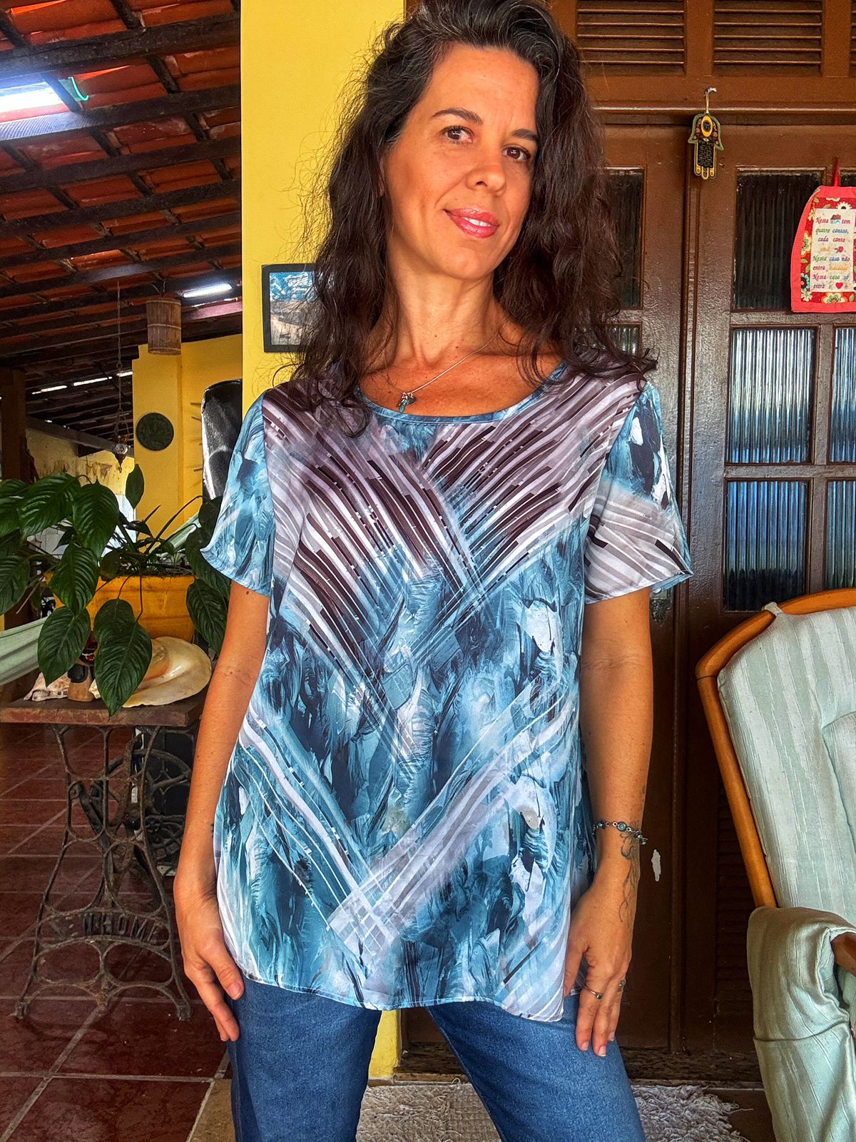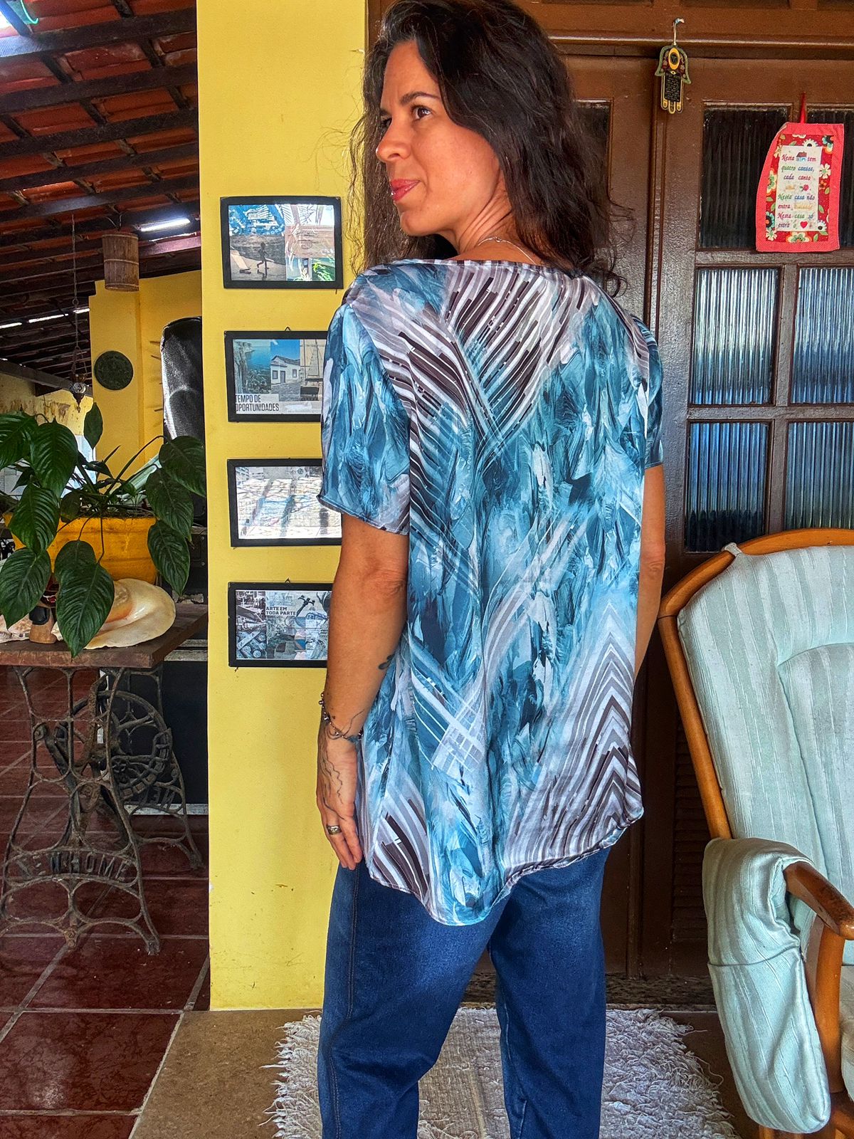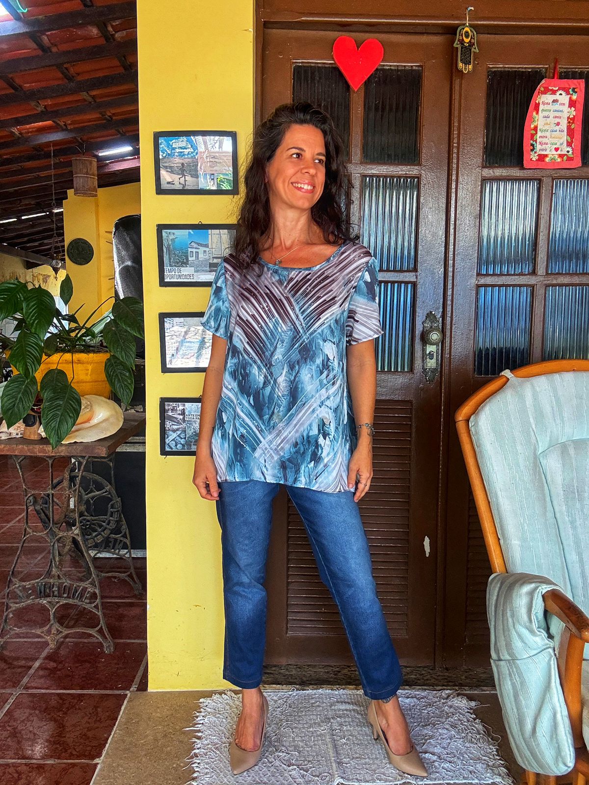 Blusa de malha leve com estampa abstrata em tons de azul, cinza e marrom. Tem modelagem solta e decote canoa, ideal para um visual casual e moderno.