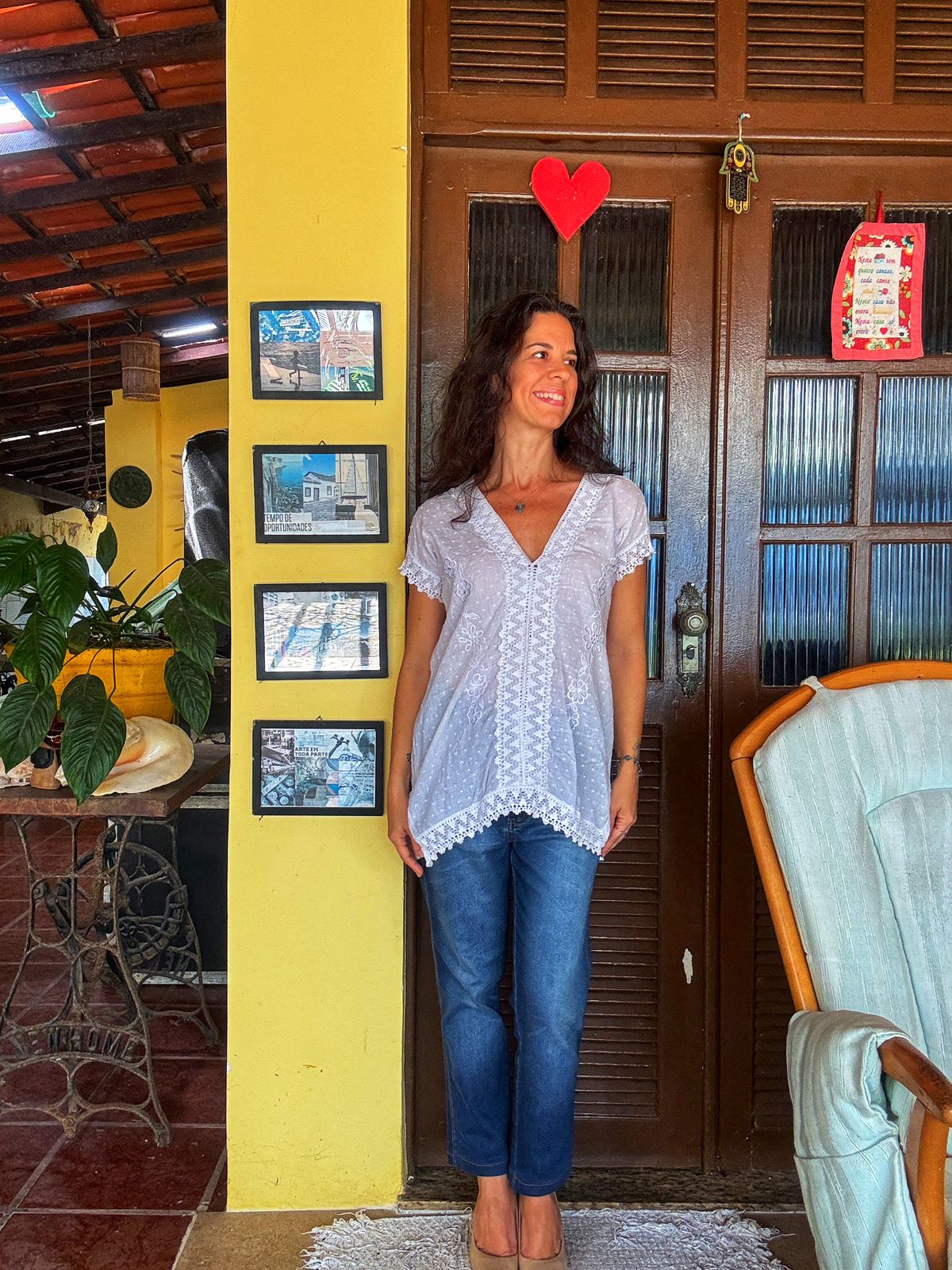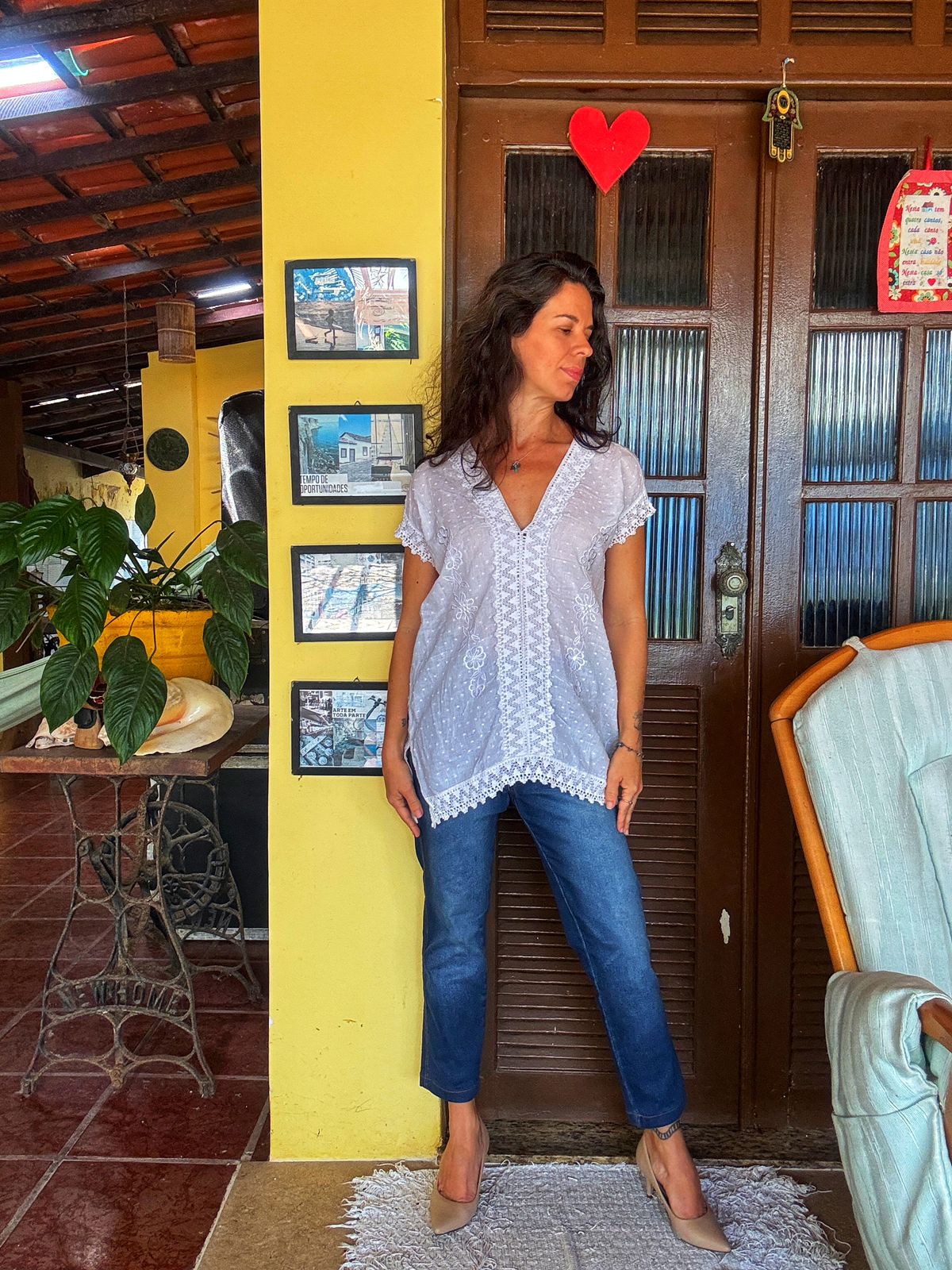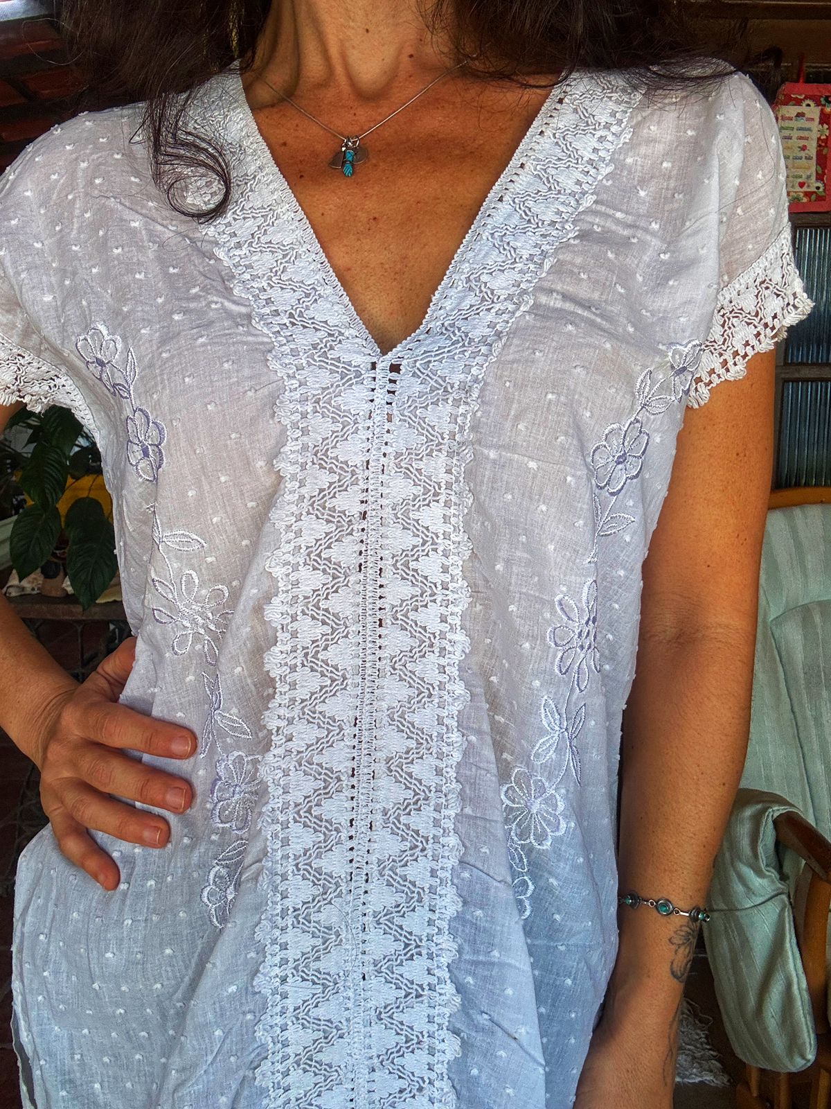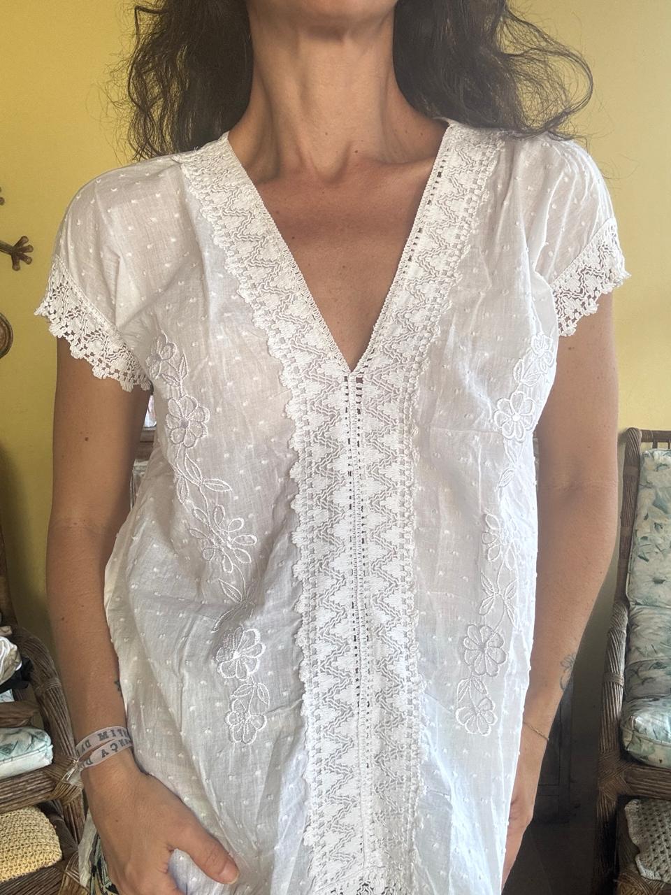 Esta peça em tecido leve de algodão apresenta padronagem poá em relevo, decote em V profundo e delicados bordados florais frontais. O acabamento em renda trabalhada nas mangas, barra e decote confere um toque romântico e artesanal ao design de modelagem solta.