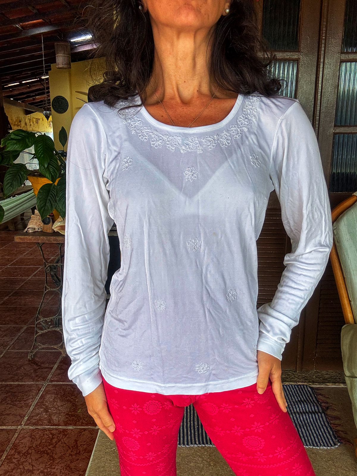 Blusa branca de manga longa com detalhes bordados que fazem a diferença. Uma peça curinga para ter no armário, unindo simplicidade e estilo.