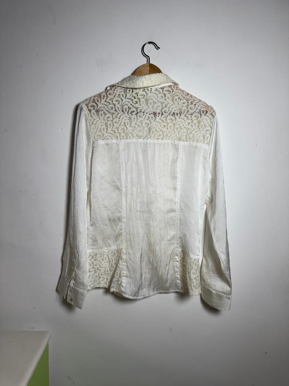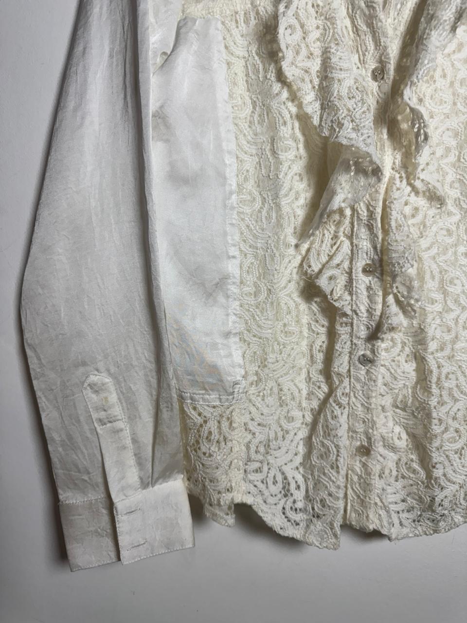 Camisa de manga longa em tecido off-white com mescla de texturas, combinando a renda floral no centro e ombros com o cetim nas laterais e mangas. O detalhe de babados frontais confere um charme romântico e sofisticado, ideal para eventos elegantes.