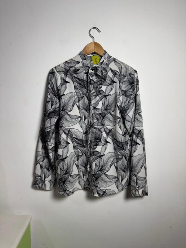 Camisa social com estampa abstrata de folhagens em preto e branco e detalhe de laço na gola, que oferece um visual dramático e elegante para o office look ou para um evento.