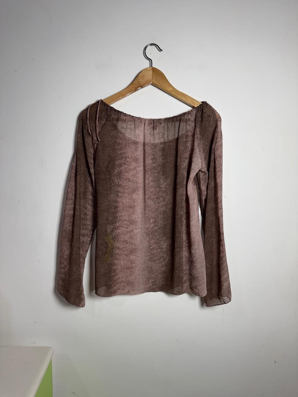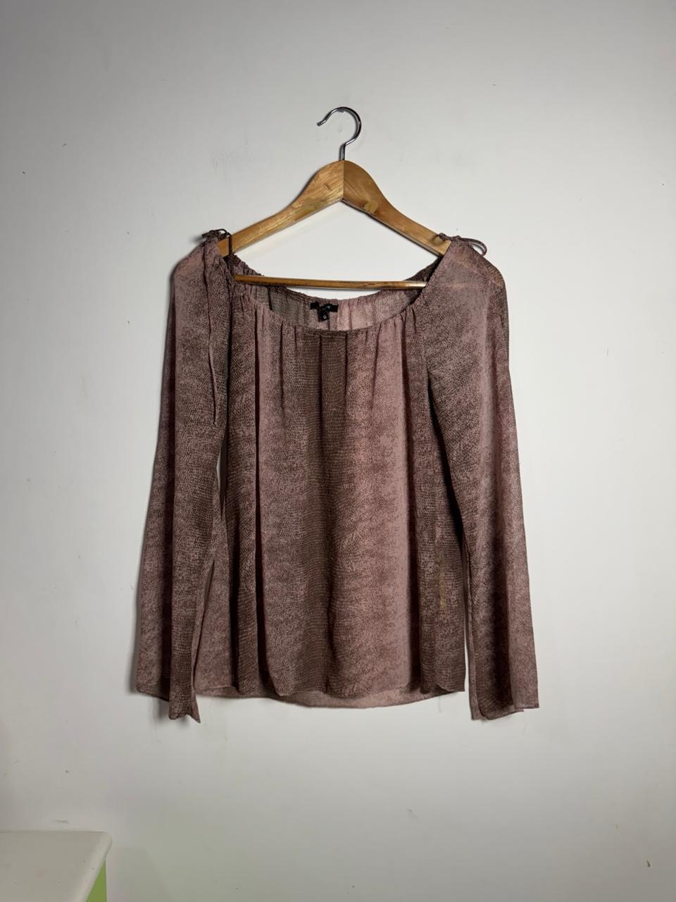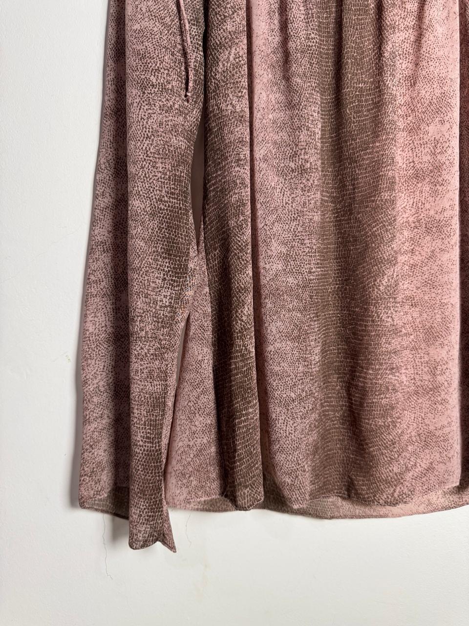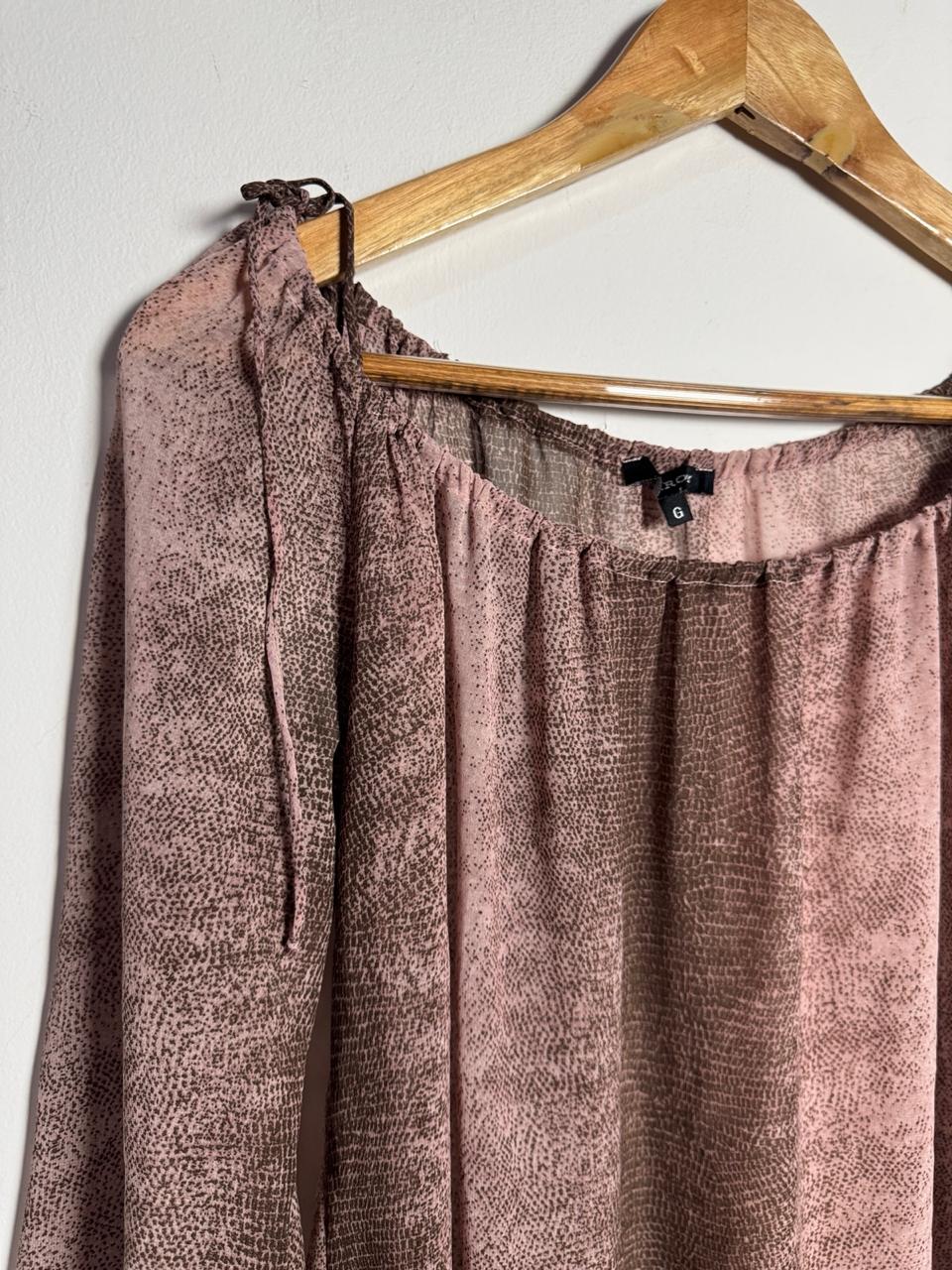 Camisa em tecido levinho de print poá / animal print em tons de rosa antigo e marrom. Possui decote ombro a ombro elastecido com amarrações delicadas nos ombros e mangas longas, perfeita para um visual romântico e fluido.