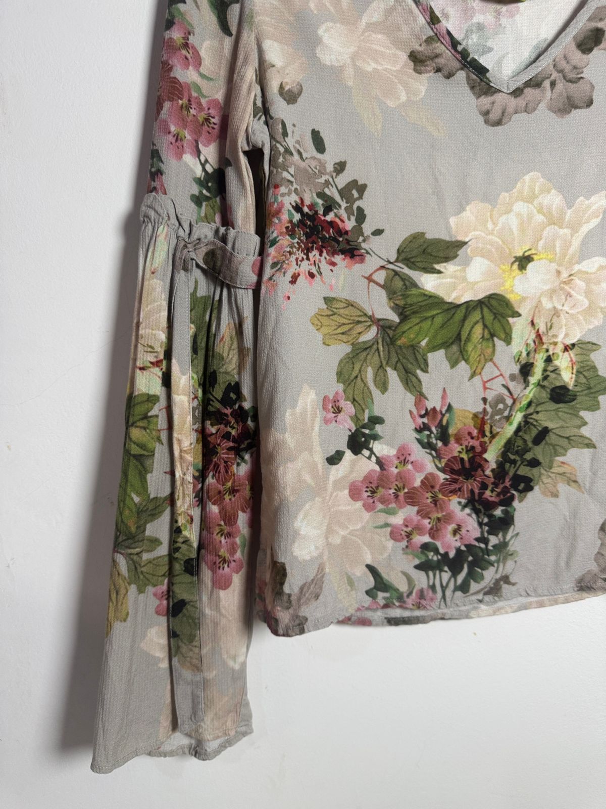 Estilo e delicadeza se unem nesta blusa de estampa floral, perfeita para um look romântico. Com gola V e mangas 3/4 com detalhe de franzido, é a peça ideal para adicionar cor e leveza ao seu visual.