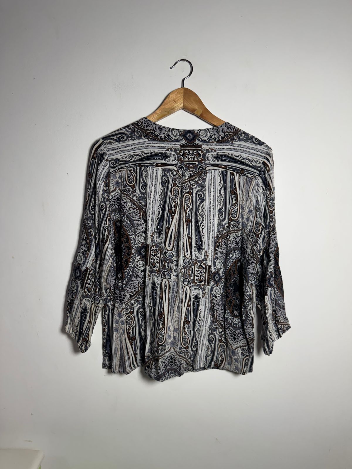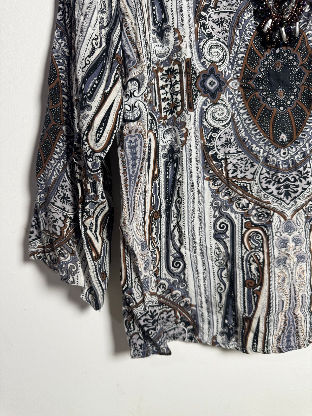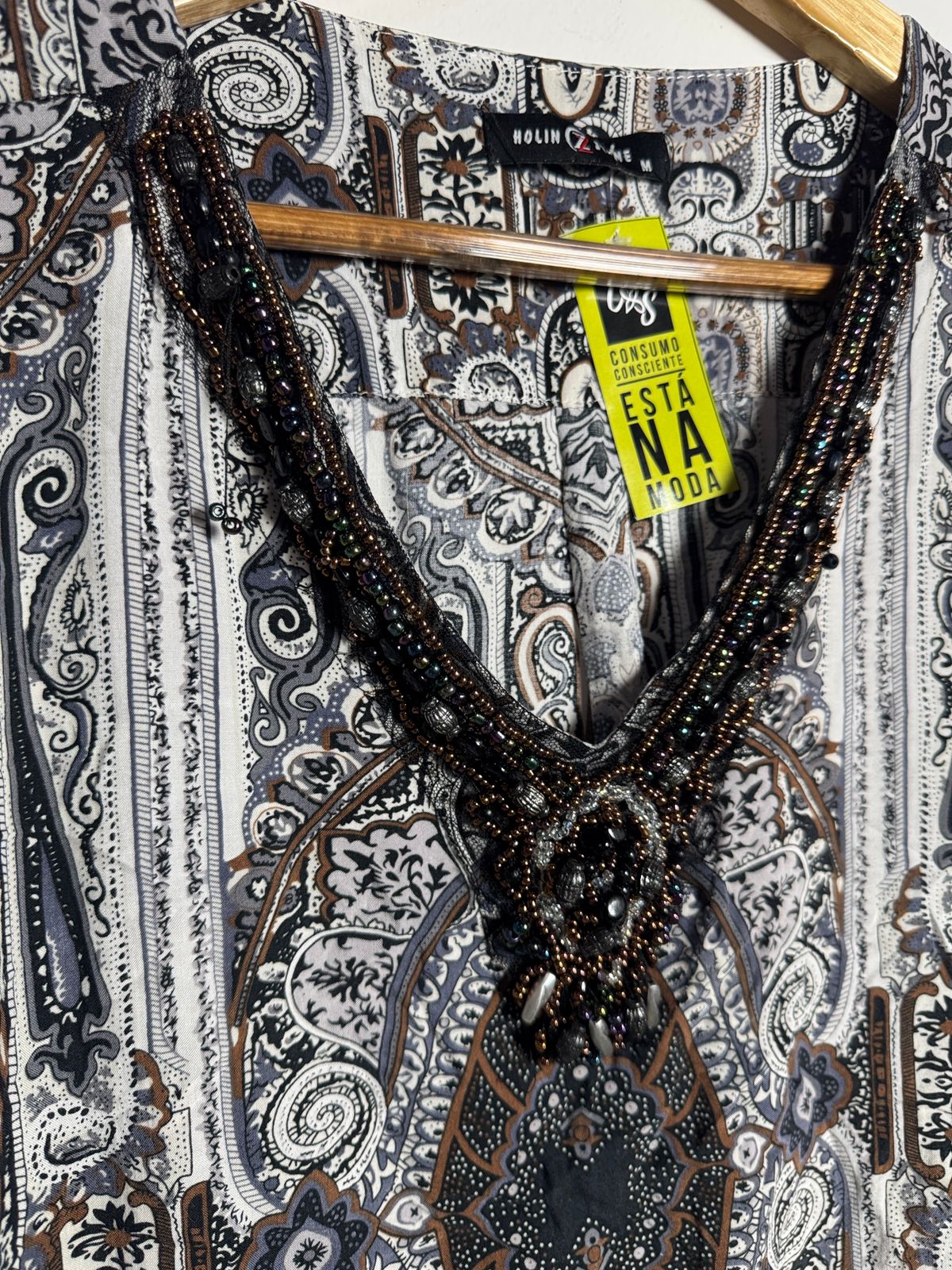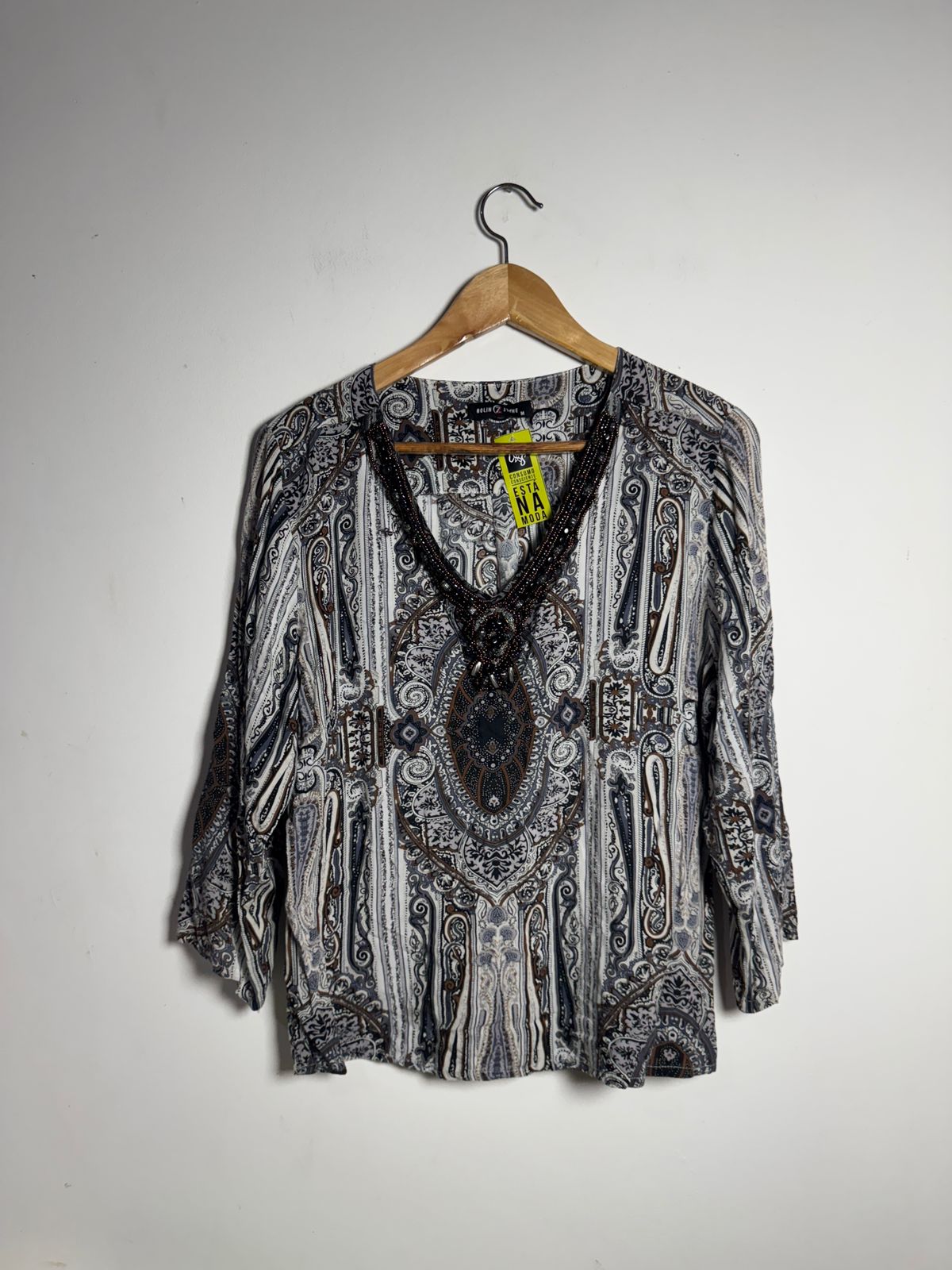 Blusa com Bordado de Miçangas na Gola: A blusa possui uma estampa paisley em tons neutros, e o decote em V é valorizado por um detalhe de miçangas, tornando-a perfeita para uma ocasião especial.
