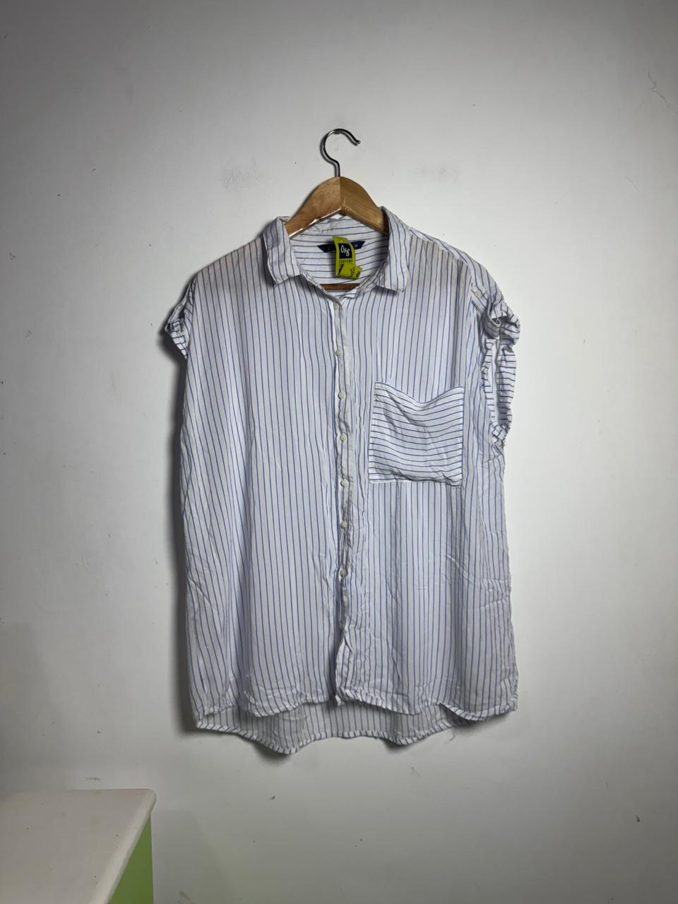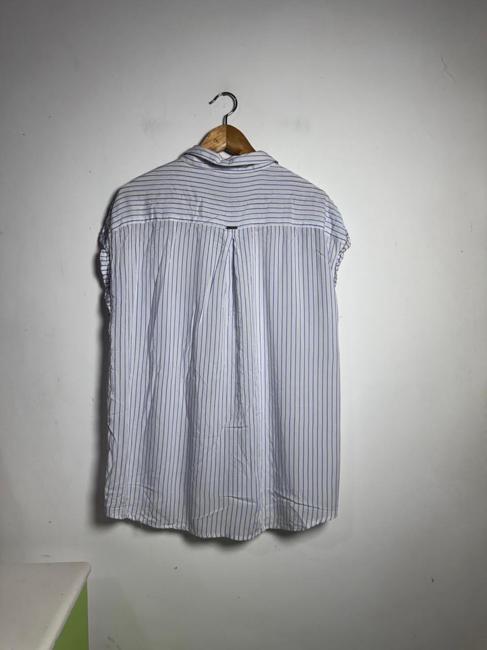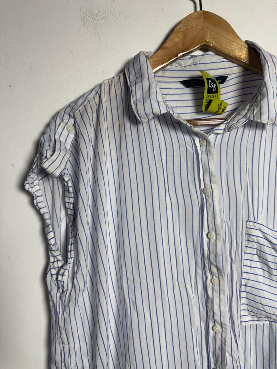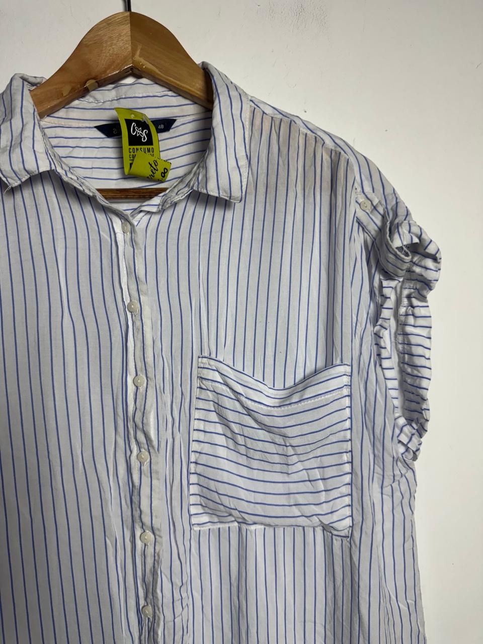Camisa com estampa de listras verticais, bolso frontal único e mangas curtas dobradas. A peça possui modelagem ampla e fechamento por botões, sendo ótima para looks casuais de trabalho ou lazer.