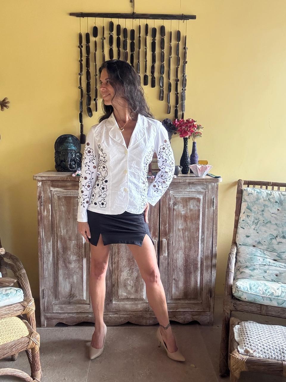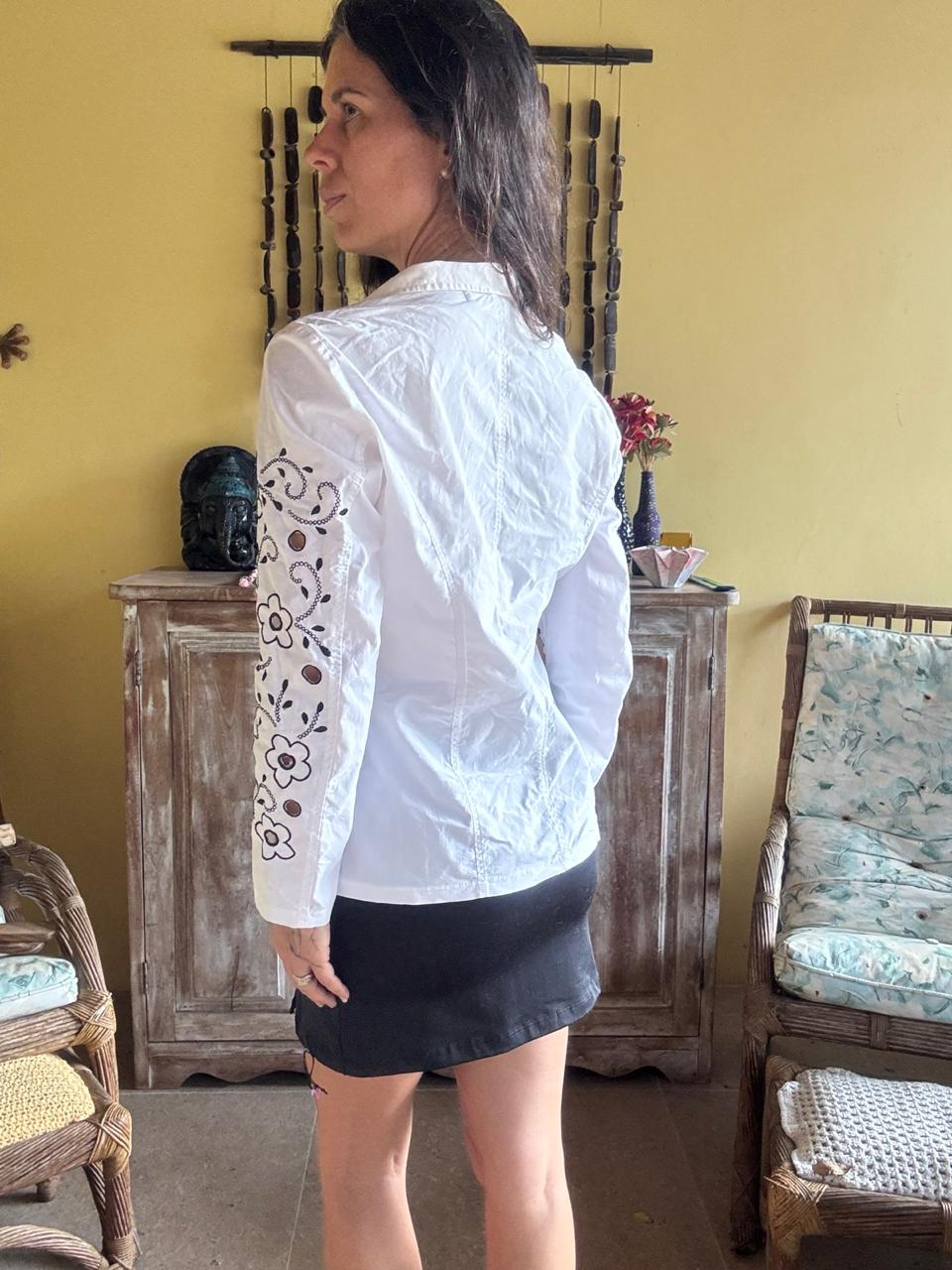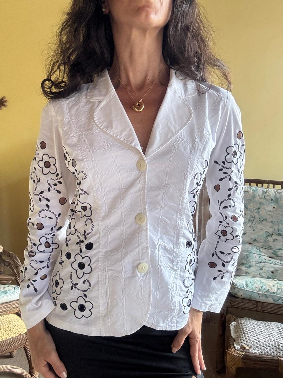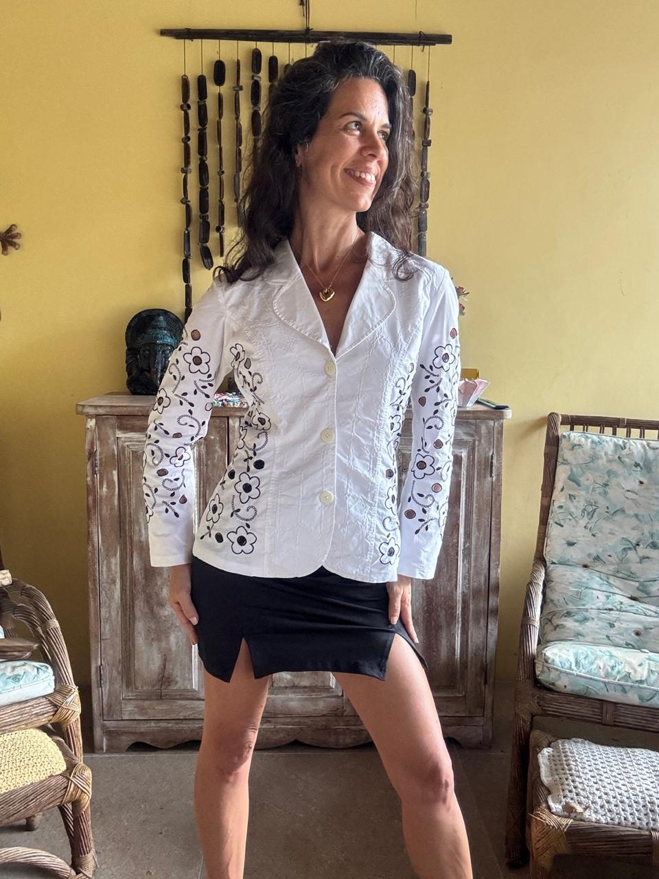 Blazer acinturado branco com bordados florais contrastantes