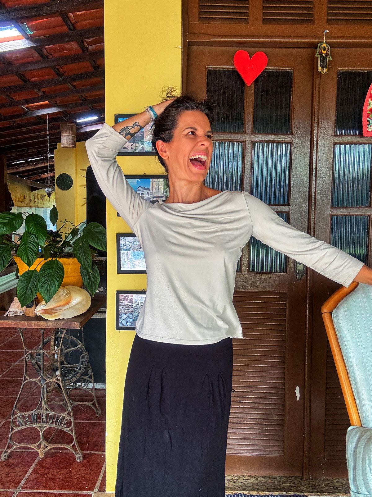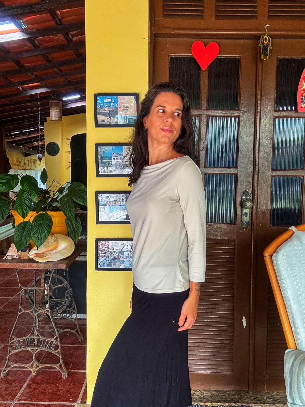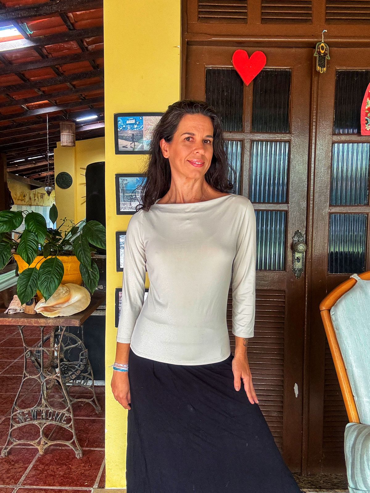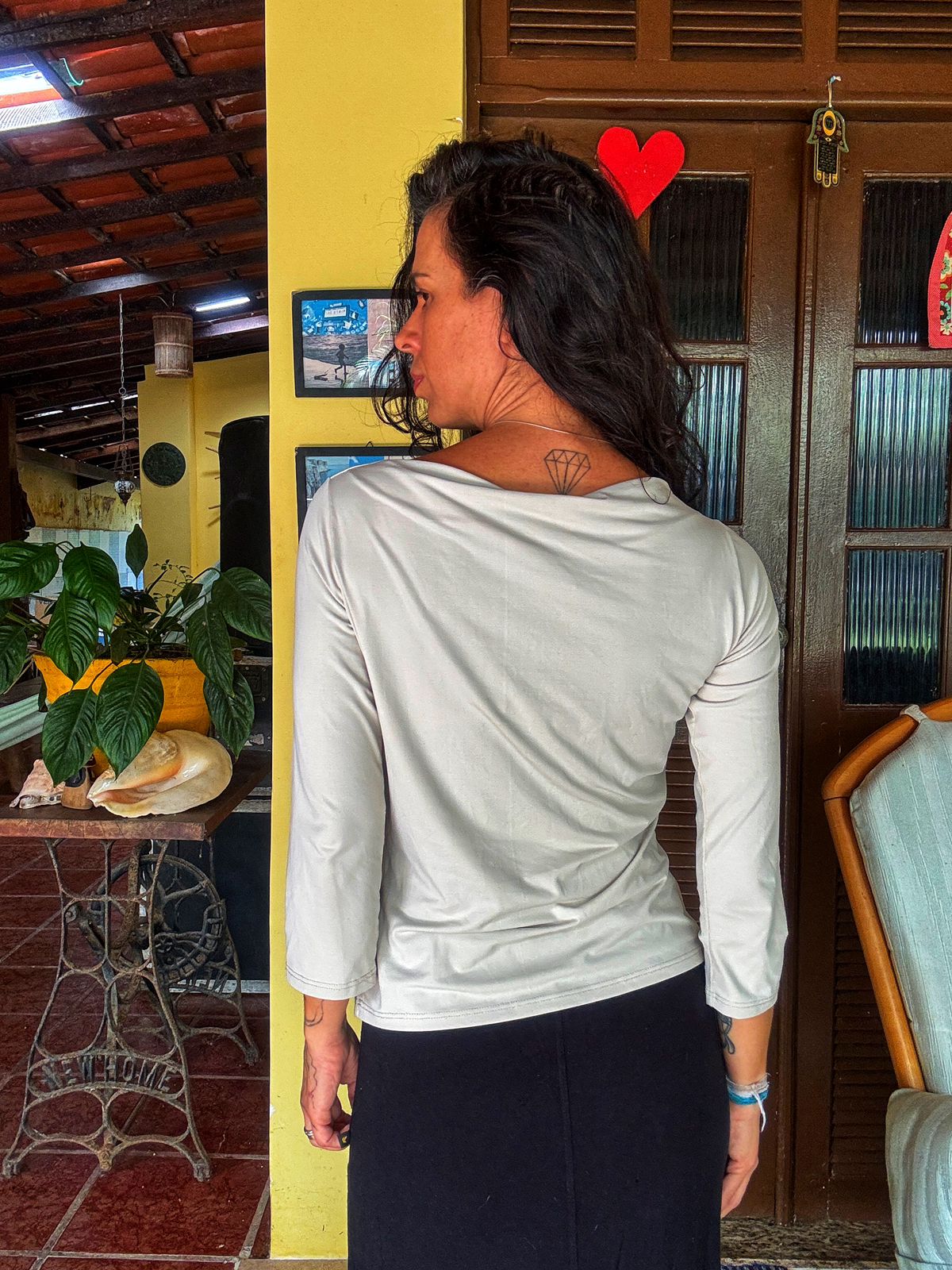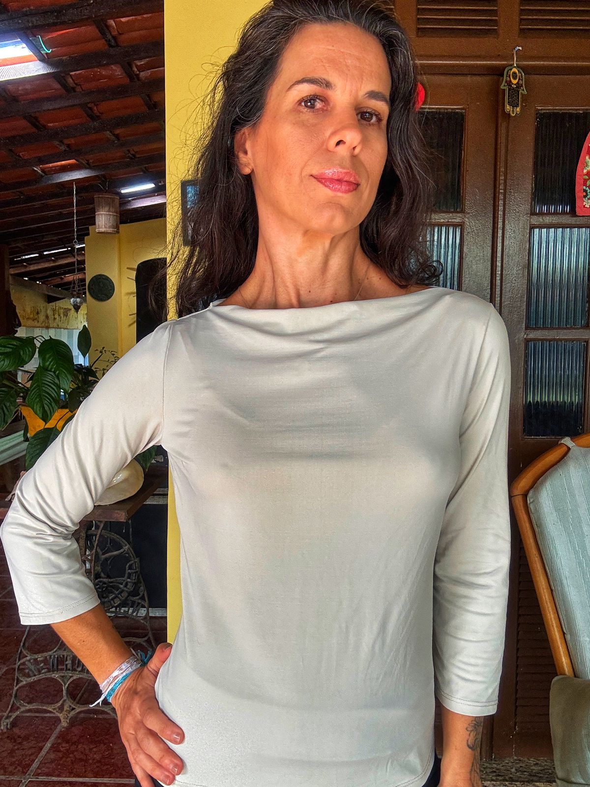 Camisa elegante em tom nude/gelo com decote canoa e mangas 3/4. Perfeita para criar looks versáteis, do casual chic ao mais formal, com um toque de sofisticação.