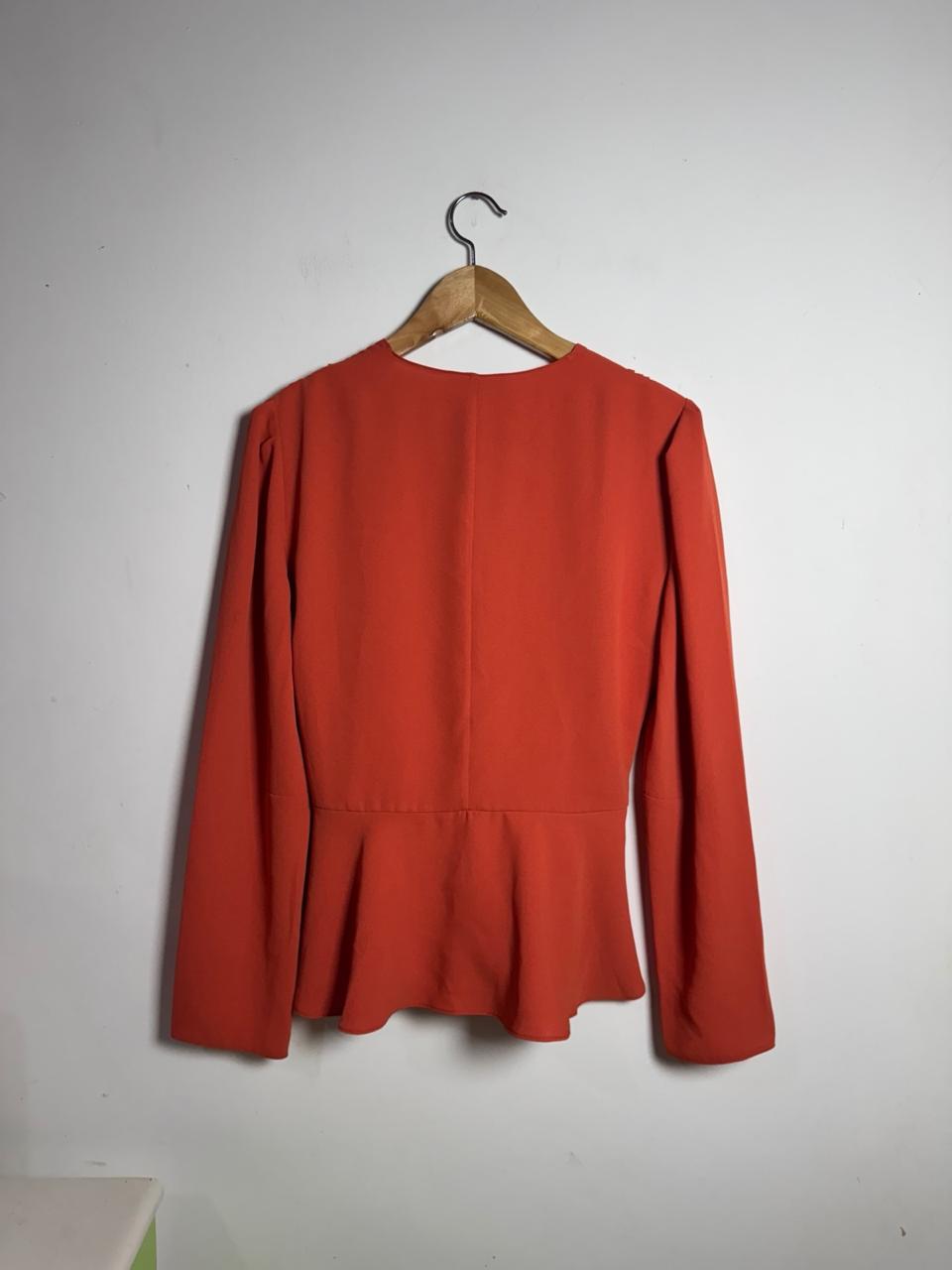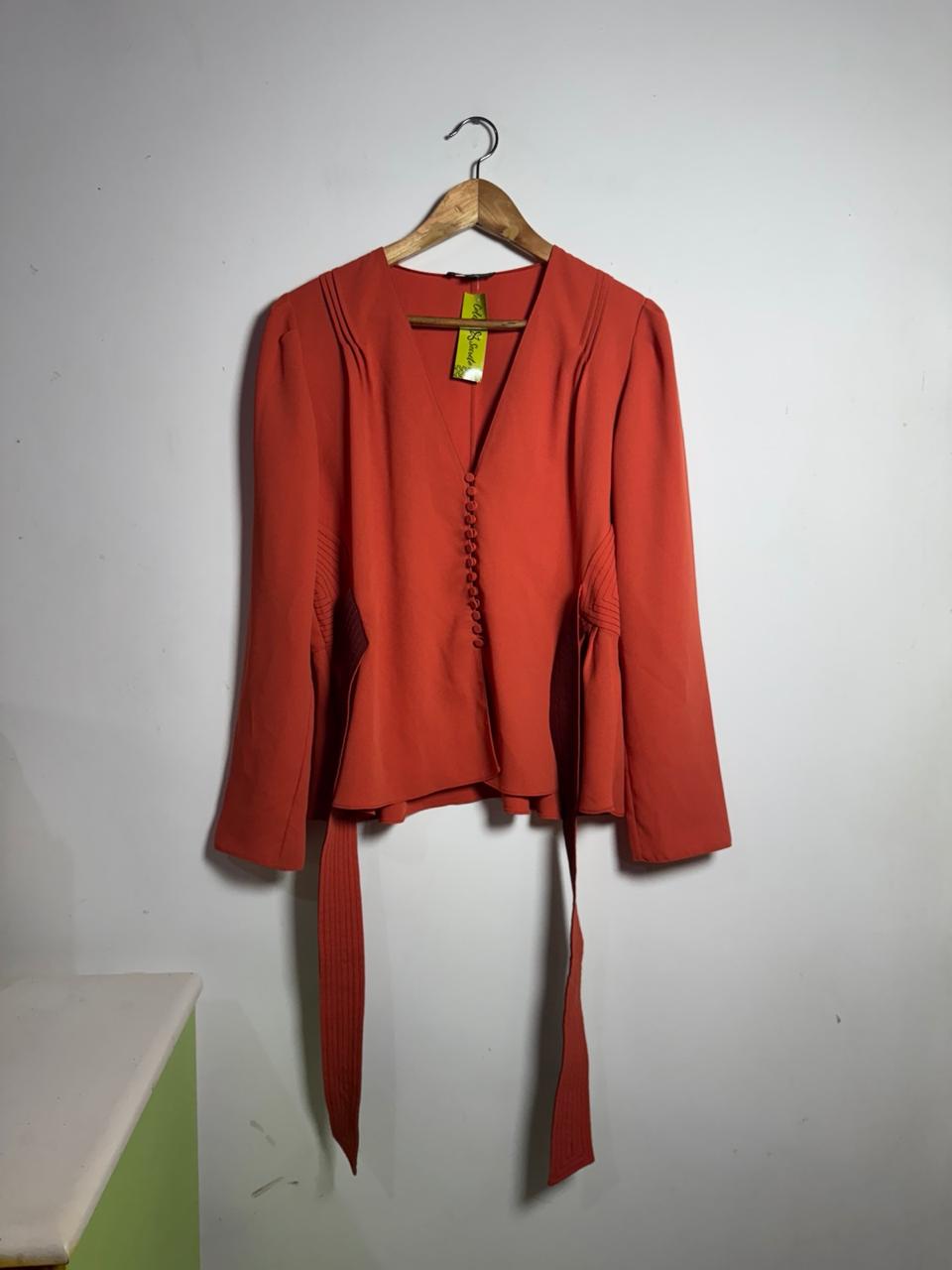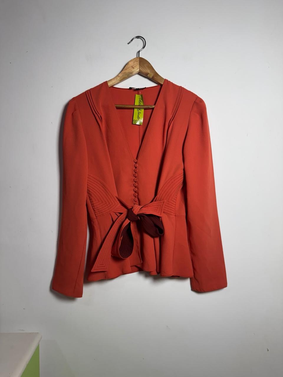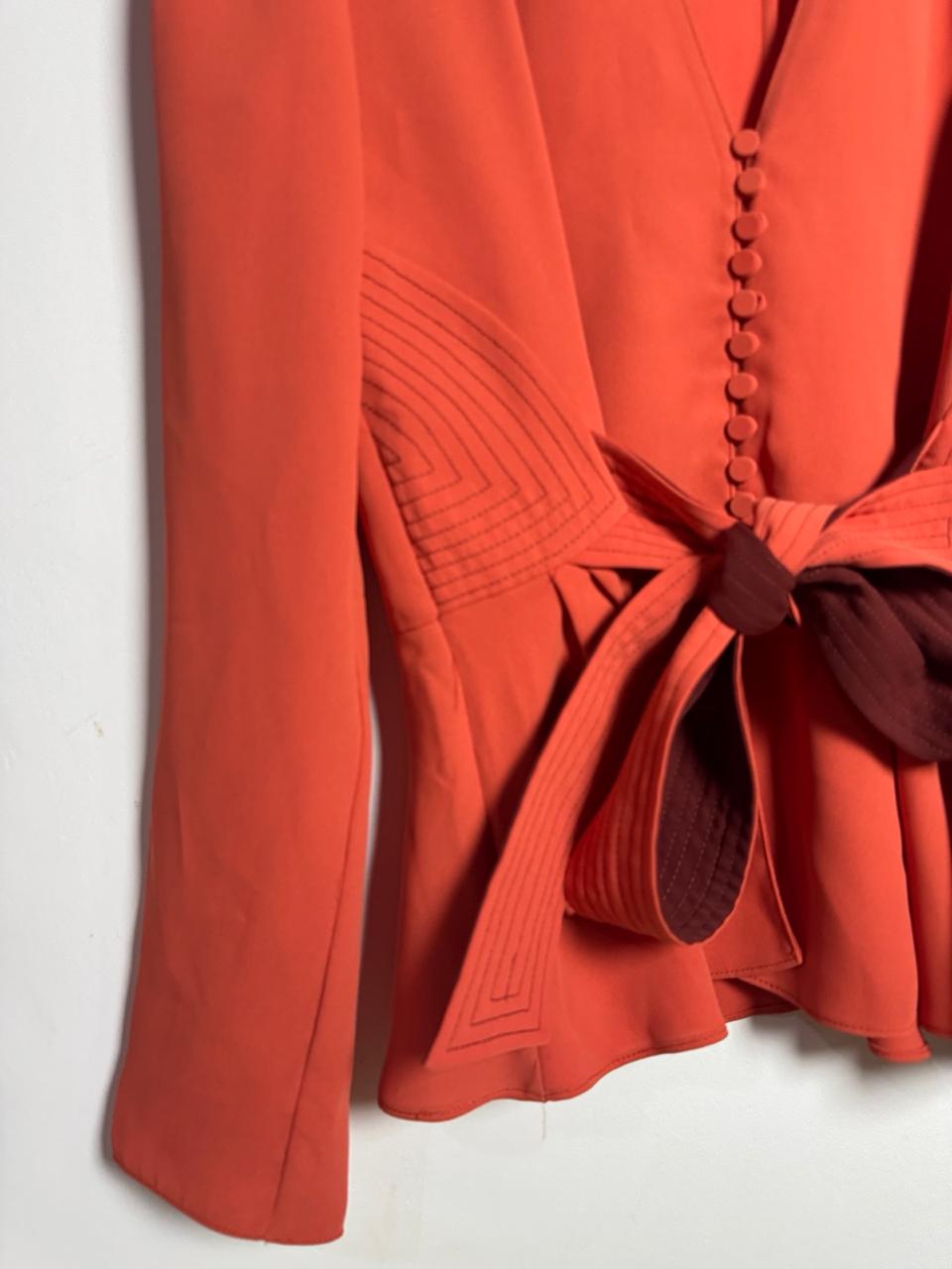 Camisa / Blazer cor salmão/terracota, com modelagem peplum, abotoamento frontal e elegante laço marrom com detalhes pespontados na cintura. Peça sofisticada e de impacto, perfeita para um visual social, chic e que valoriza a silhueta.