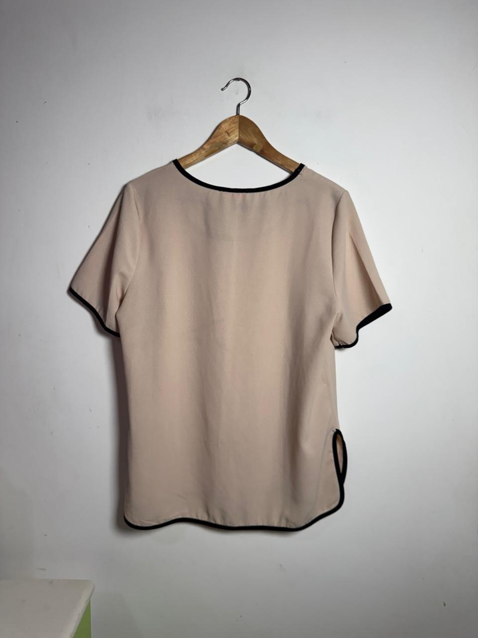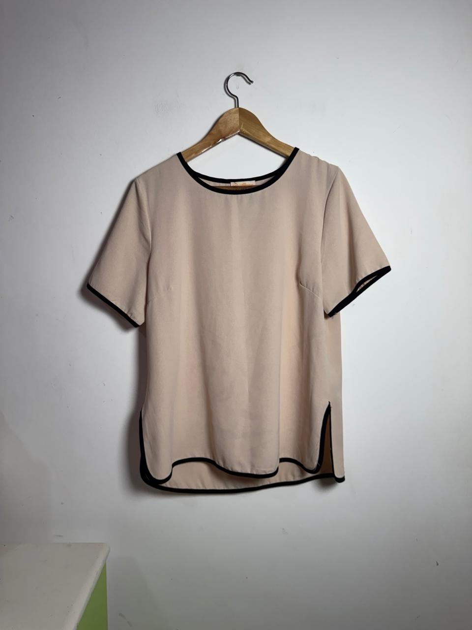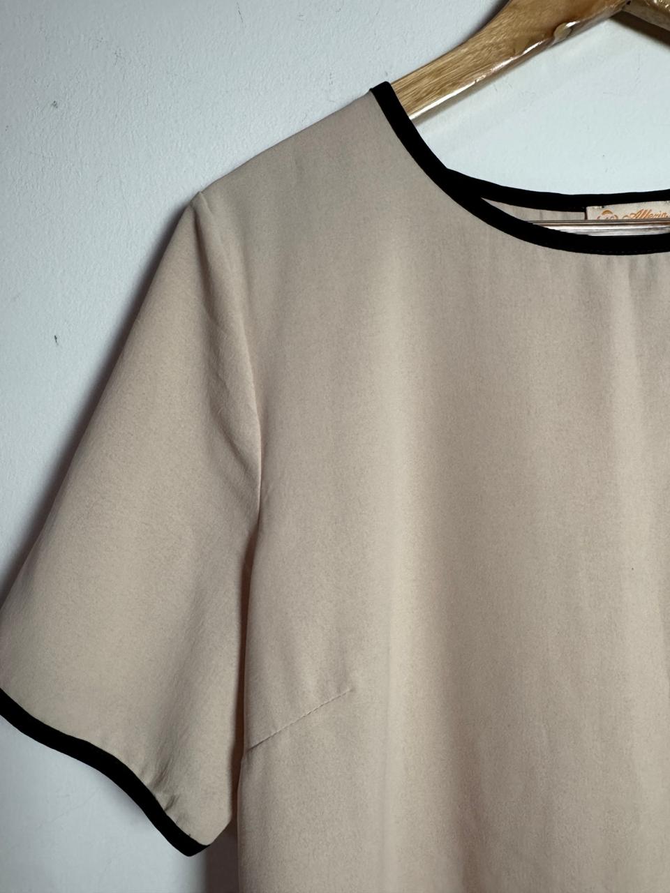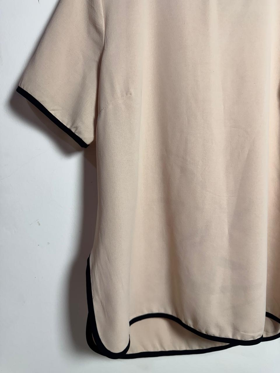 Camisa de mangas curtas em tom areia destacada por contornos contrastantes na gola, punhos e barra arredondada. O modelo exibe fendas laterais discretas e um caimento reto, funcionando como base polida para composições de escritório com calças de sarja.