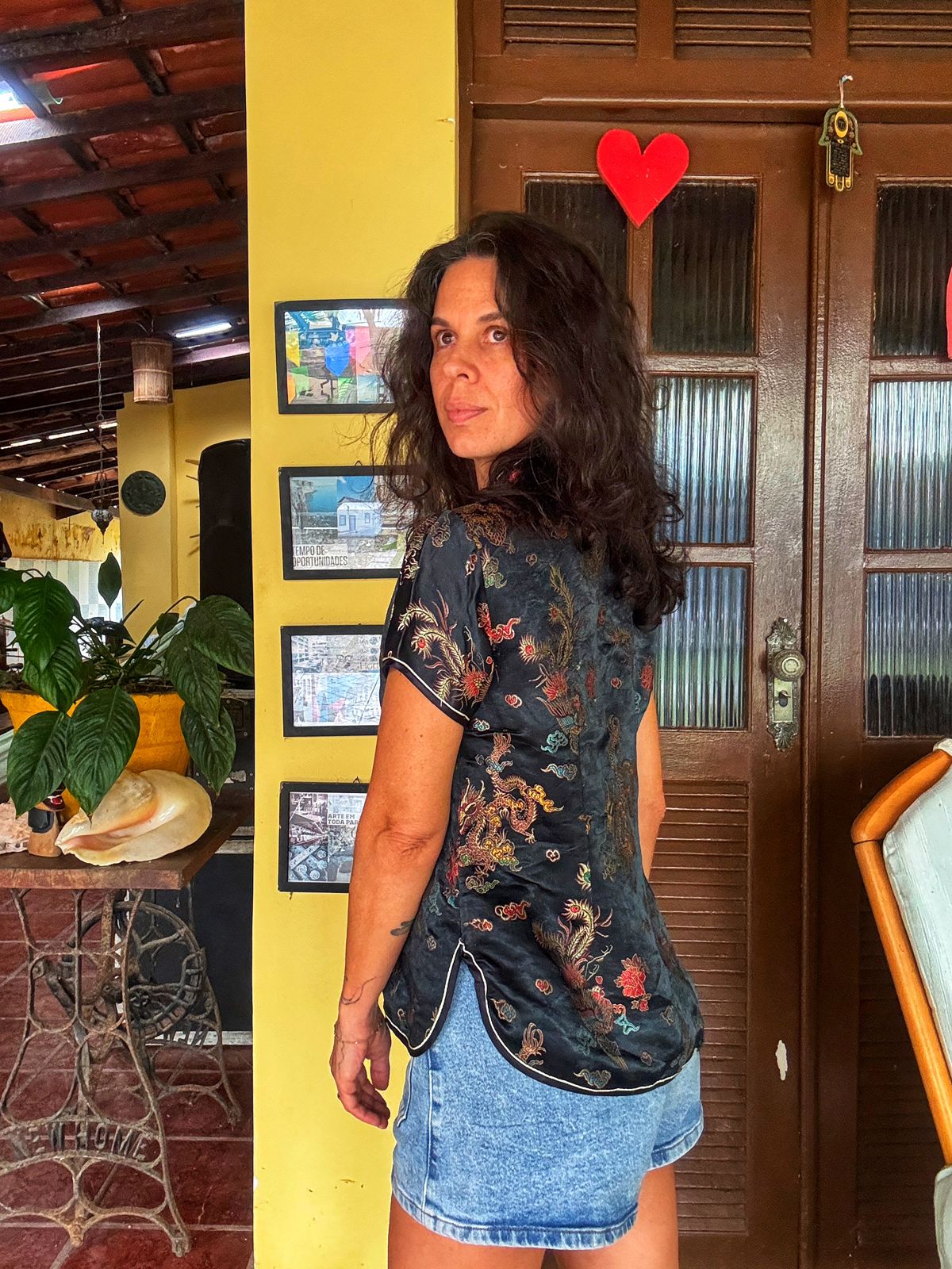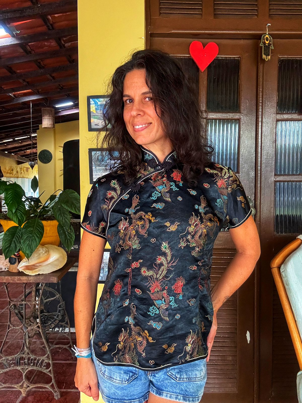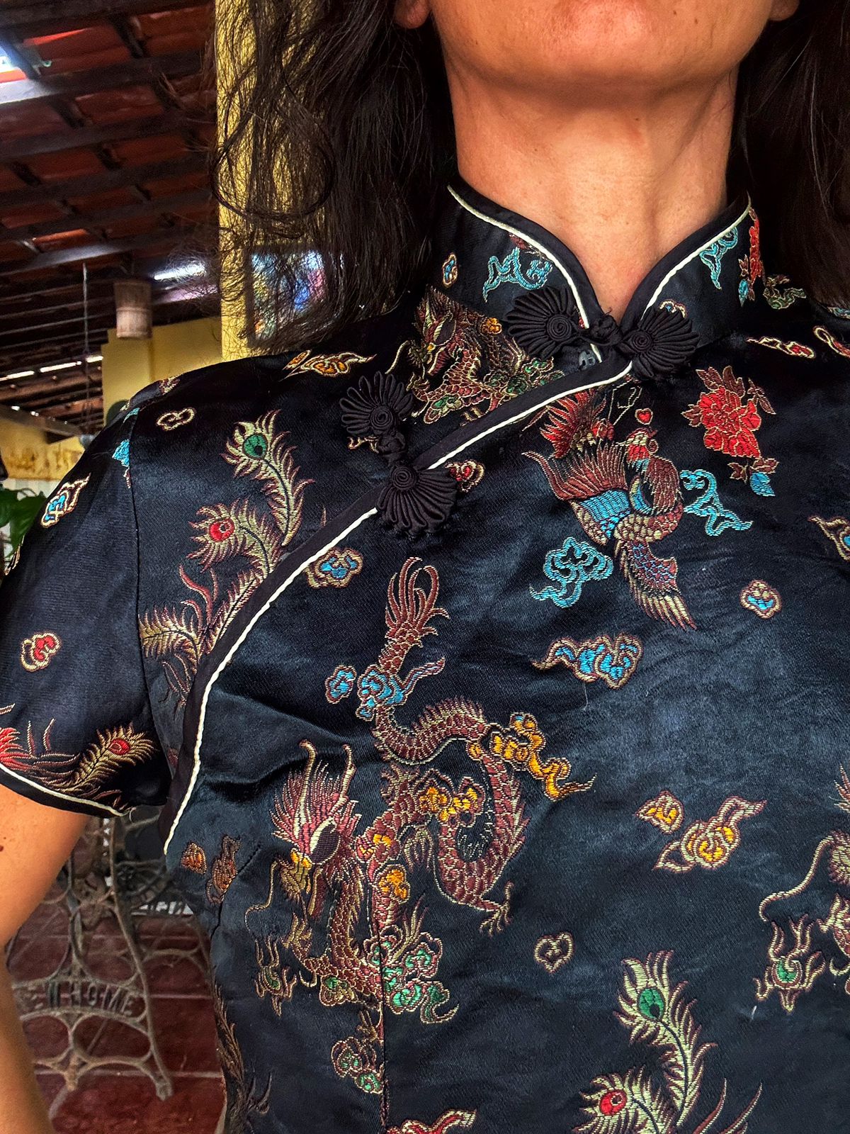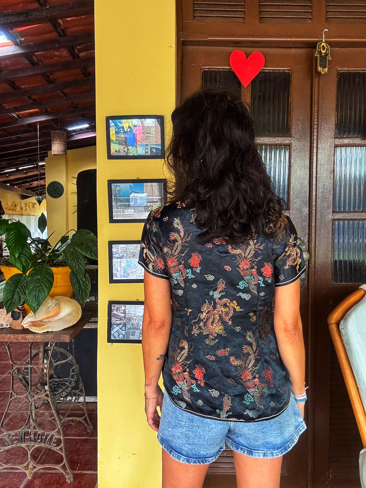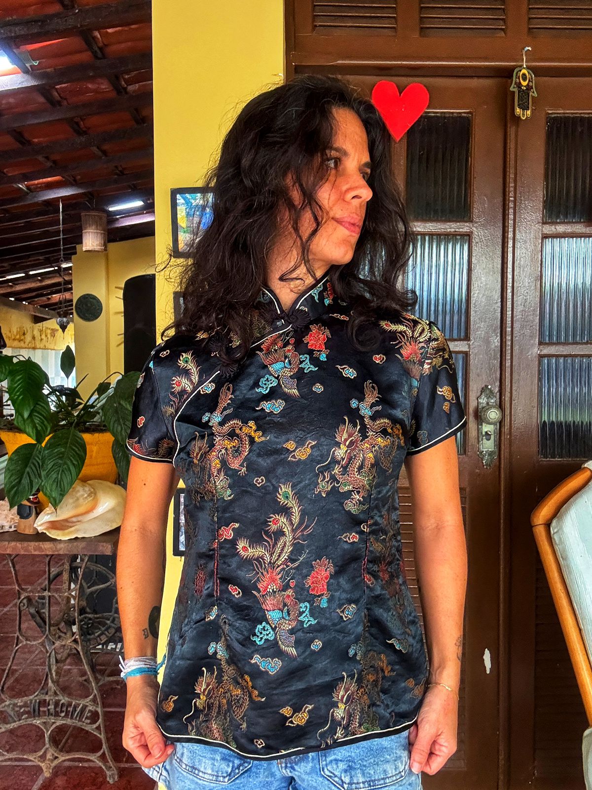 Camisa preta com um design oriental elegante, confeccionada em tecido levemente acetinado e com estampa rica em detalhes de dragões coloridos. Possui gola mandarim e fechamento lateral tradicional, além de mangas curtas com um discreto acabamento em viés branco. Uma peça versátil que adiciona um toque exótico e sofisticado a qualquer look, podendo ser usada de forma casual ou em ocasiões especiais.